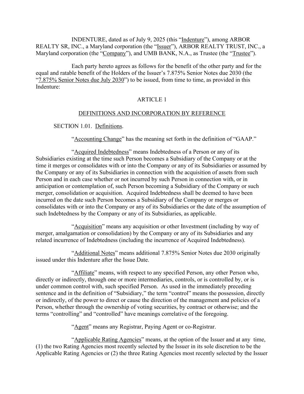 INDENTURE, dated as of July 9, 2025 (this “Indenture”), among ARBOR REALTY SR, INC., a Maryland corporation (the “Issuer”), ARBOR REALTY TRUST, INC., a Maryland corporation (the “Company”), and UMB BANK, N.A., as Trustee (the “Trustee”). Each party hereto agrees as follows for the benefit of the other party and for the equal and ratable benefit of the Holders of the Issuer’s 7.875% Senior Notes due 2030 (the “7.875% Senior Notes due July 2030”) to be issued, from time to time, as provided in this Indenture: ARTICLE 1 DEFINITIONS AND INCORPORATION BY REFERENCE SECTION 1.01. Definitions. “Accounting Change” has the meaning set forth in the definition of “GAAP.” “Acquired Indebtedness” means Indebtedness of a Person or any of its Subsidiaries existing at the time such Person becomes a Subsidiary of the Company or at the time it merges or consolidates with or into the Company or any of its Subsidiaries or assumed by the Company or any of its Subsidiaries in connection with the acquisition of assets from such Person and in each case whether or not incurred by such Person in connection with, or in anticipation or contemplation of, such Person becoming a Subsidiary of the Company or such merger, consolidation or acquisition. Acquired Indebtedness shall be deemed to have been incurred on the date such Person becomes a Subsidiary of the Company or merges or consolidates with or into the Company or any of its Subsidiaries or the date of the assumption of such Indebtedness by the Company or any of its Subsidiaries, as applicable. “Acquisition” means any acquisition or other Investment (including by way of merger, amalgamation or consolidation) by the Company or any of its Subsidiaries and any related incurrence of Indebtedness (including the incurrence of Acquired Indebtedness). “Additional Notes” means additional 7.875% Senior Notes due 2030 originally issued under this Indenture after the Issue Date. “Affiliate” means, with respect to any specified Person, any other Person who, directly or indirectly, through one or more intermediaries, controls, or is controlled by, or is under common control with, such specified Person. As used in the immediately preceding sentence and in the definition of “Subsidiary,” the term “control” means the possession, directly or indirectly, of the power to direct or cause the direction of the management and policies of a Person, whether through the ownership of voting securities, by contract or otherwise; and the terms “controlling” and “controlled” have meanings correlative of the foregoing. “Agent” means any Registrar, Paying Agent or co-Registrar. “Applicable Rating Agencies” means, at the option of the Issuer and at any time, (1) the two Rating Agencies most recently selected by the Issuer in its sole discretion to be the Applicable Rating Agencies or (2) the three Rating Agencies most recently selected by the Issuer