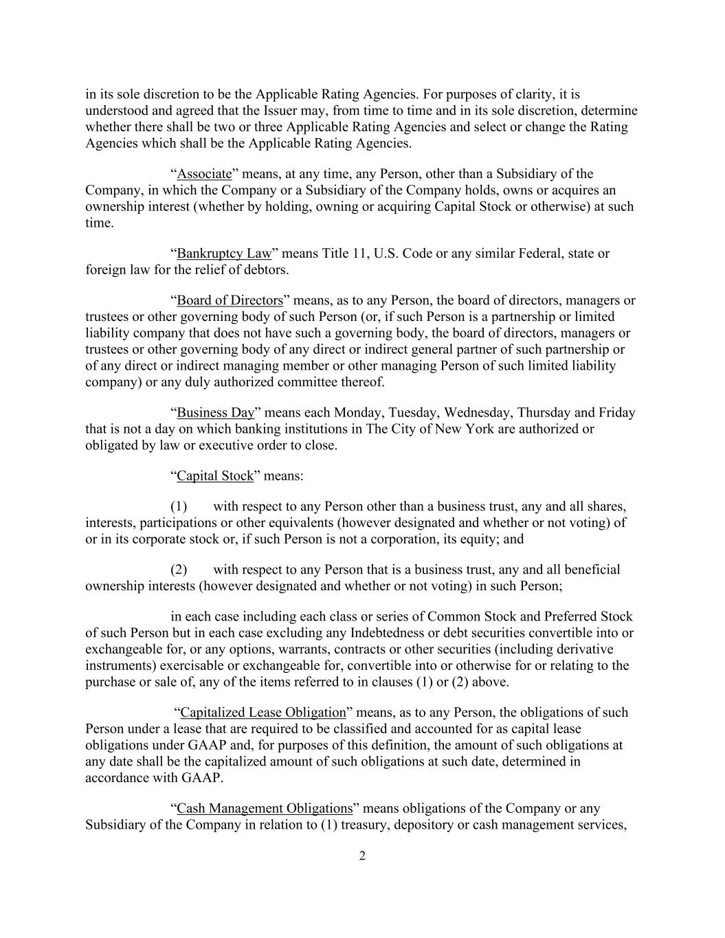 2 in its sole discretion to be the Applicable Rating Agencies. For purposes of clarity, it is understood and agreed that the Issuer may, from time to time and in its sole discretion, determine whether there shall be two or three Applicable Rating Agencies and select or change the Rating Agencies which shall be the Applicable Rating Agencies. “Associate” means, at any time, any Person, other than a Subsidiary of the Company, in which the Company or a Subsidiary of the Company holds, owns or acquires an ownership interest (whether by holding, owning or acquiring Capital Stock or otherwise) at such time. “Bankruptcy Law” means Title 11, U.S. Code or any similar Federal, state or foreign law for the relief of debtors. “Board of Directors” means, as to any Person, the board of directors, managers or trustees or other governing body of such Person (or, if such Person is a partnership or limited liability company that does not have such a governing body, the board of directors, managers or trustees or other governing body of any direct or indirect general partner of such partnership or of any direct or indirect managing member or other managing Person of such limited liability company) or any duly authorized committee thereof. “Business Day” means each Monday, Tuesday, Wednesday, Thursday and Friday that is not a day on which banking institutions in The City of New York are authorized or obligated by law or executive order to close. “Capital Stock” means: (1) with respect to any Person other than a business trust, any and all shares, interests, participations or other equivalents (however designated and whether or not voting) of or in its corporate stock or, if such Person is not a corporation, its equity; and (2) with respect to any Person that is a business trust, any and all beneficial ownership interests (however designated and whether or not voting) in such Person; in each case including each class or series of Common Stock and Preferred Stock of such Person but in each case excluding any Indebtedness or debt securities convertible into or exchangeable for, or any options, warrants, contracts or other securities (including derivative instruments) exercisable or exchangeable for, convertible into or otherwise for or relating to the purchase or sale of, any of the items referred to in clauses (1) or (2) above. “Capitalized Lease Obligation” means, as to any Person, the obligations of such Person under a lease that are required to be classified and accounted for as capital lease obligations under GAAP and, for purposes of this definition, the amount of such obligations at any date shall be the capitalized amount of such obligations at such date, determined in accordance with GAAP. “Cash Management Obligations” means obligations of the Company or any Subsidiary of the Company in relation to (1) treasury, depository or cash management services,