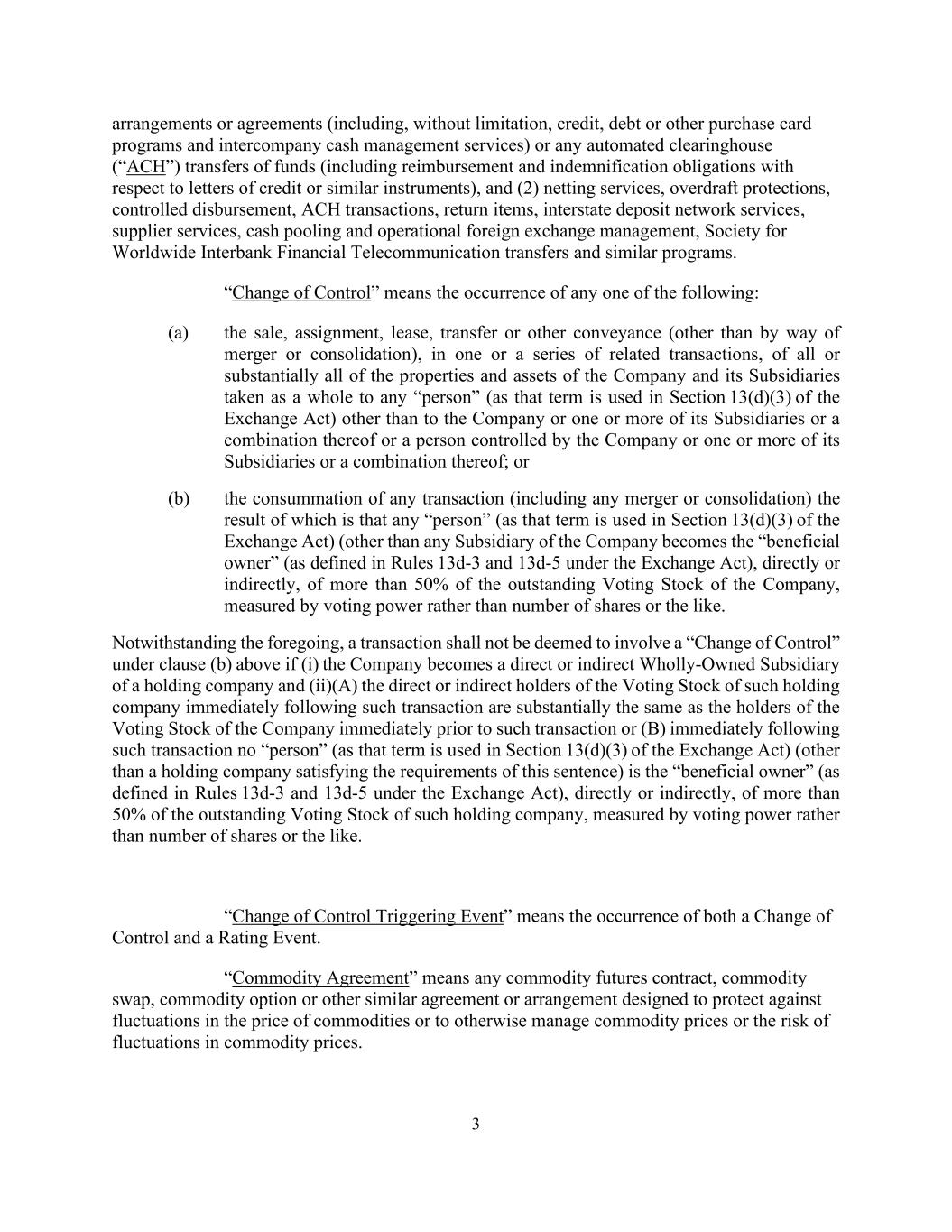 3 arrangements or agreements (including, without limitation, credit, debt or other purchase card programs and intercompany cash management services) or any automated clearinghouse (“ACH”) transfers of funds (including reimbursement and indemnification obligations with respect to letters of credit or similar instruments), and (2) netting services, overdraft protections, controlled disbursement, ACH transactions, return items, interstate deposit network services, supplier services, cash pooling and operational foreign exchange management, Society for Worldwide Interbank Financial Telecommunication transfers and similar programs. “Change of Control” means the occurrence of any one of the following: (a) the sale, assignment, lease, transfer or other conveyance (other than by way of merger or consolidation), in one or a series of related transactions, of all or substantially all of the properties and assets of the Company and its Subsidiaries taken as a whole to any “person” (as that term is used in Section 13(d)(3) of the Exchange Act) other than to the Company or one or more of its Subsidiaries or a combination thereof or a person controlled by the Company or one or more of its Subsidiaries or a combination thereof; or (b) the consummation of any transaction (including any merger or consolidation) the result of which is that any “person” (as that term is used in Section 13(d)(3) of the Exchange Act) (other than any Subsidiary of the Company becomes the “beneficial owner” (as defined in Rules 13d-3 and 13d-5 under the Exchange Act), directly or indirectly, of more than 50% of the outstanding Voting Stock of the Company, measured by voting power rather than number of shares or the like. Notwithstanding the foregoing, a transaction shall not be deemed to involve a “Change of Control” under clause (b) above if (i) the Company becomes a direct or indirect Wholly-Owned Subsidiary of a holding company and (ii)(A) the direct or indirect holders of the Voting Stock of such holding company immediately following such transaction are substantially the same as the holders of the Voting Stock of the Company immediately prior to such transaction or (B) immediately following such transaction no “person” (as that term is used in Section 13(d)(3) of the Exchange Act) (other than a holding company satisfying the requirements of this sentence) is the “beneficial owner” (as defined in Rules 13d-3 and 13d-5 under the Exchange Act), directly or indirectly, of more than 50% of the outstanding Voting Stock of such holding company, measured by voting power rather than number of shares or the like. “Change of Control Triggering Event” means the occurrence of both a Change of Control and a Rating Event. “Commodity Agreement” means any commodity futures contract, commodity swap, commodity option or other similar agreement or arrangement designed to protect against fluctuations in the price of commodities or to otherwise manage commodity prices or the risk of fluctuations in commodity prices.