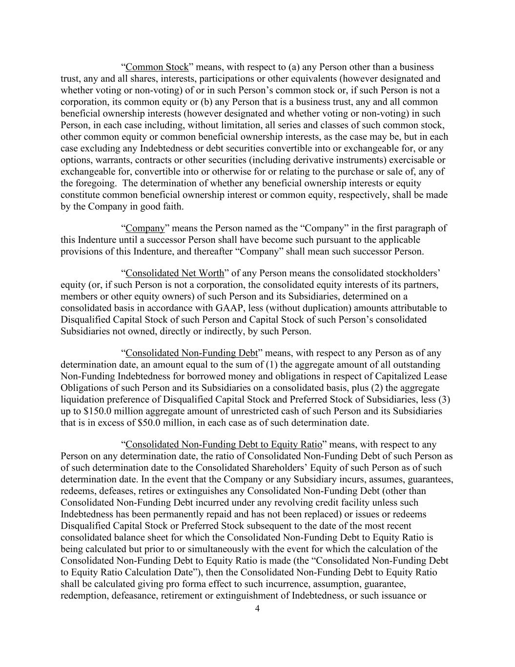 4 “Common Stock” means, with respect to (a) any Person other than a business trust, any and all shares, interests, participations or other equivalents (however designated and whether voting or non-voting) of or in such Person’s common stock or, if such Person is not a corporation, its common equity or (b) any Person that is a business trust, any and all common beneficial ownership interests (however designated and whether voting or non-voting) in such Person, in each case including, without limitation, all series and classes of such common stock, other common equity or common beneficial ownership interests, as the case may be, but in each case excluding any Indebtedness or debt securities convertible into or exchangeable for, or any options, warrants, contracts or other securities (including derivative instruments) exercisable or exchangeable for, convertible into or otherwise for or relating to the purchase or sale of, any of the foregoing. The determination of whether any beneficial ownership interests or equity constitute common beneficial ownership interest or common equity, respectively, shall be made by the Company in good faith. “Company” means the Person named as the “Company” in the first paragraph of this Indenture until a successor Person shall have become such pursuant to the applicable provisions of this Indenture, and thereafter “Company” shall mean such successor Person. “Consolidated Net Worth” of any Person means the consolidated stockholders’ equity (or, if such Person is not a corporation, the consolidated equity interests of its partners, members or other equity owners) of such Person and its Subsidiaries, determined on a consolidated basis in accordance with GAAP, less (without duplication) amounts attributable to Disqualified Capital Stock of such Person and Capital Stock of such Person’s consolidated Subsidiaries not owned, directly or indirectly, by such Person. “Consolidated Non-Funding Debt” means, with respect to any Person as of any determination date, an amount equal to the sum of (1) the aggregate amount of all outstanding Non-Funding Indebtedness for borrowed money and obligations in respect of Capitalized Lease Obligations of such Person and its Subsidiaries on a consolidated basis, plus (2) the aggregate liquidation preference of Disqualified Capital Stock and Preferred Stock of Subsidiaries, less (3) up to $150.0 million aggregate amount of unrestricted cash of such Person and its Subsidiaries that is in excess of $50.0 million, in each case as of such determination date. “Consolidated Non-Funding Debt to Equity Ratio” means, with respect to any Person on any determination date, the ratio of Consolidated Non-Funding Debt of such Person as of such determination date to the Consolidated Shareholders’ Equity of such Person as of such determination date. In the event that the Company or any Subsidiary incurs, assumes, guarantees, redeems, defeases, retires or extinguishes any Consolidated Non-Funding Debt (other than Consolidated Non-Funding Debt incurred under any revolving credit facility unless such Indebtedness has been permanently repaid and has not been replaced) or issues or redeems Disqualified Capital Stock or Preferred Stock subsequent to the date of the most recent consolidated balance sheet for which the Consolidated Non-Funding Debt to Equity Ratio is being calculated but prior to or simultaneously with the event for which the calculation of the Consolidated Non-Funding Debt to Equity Ratio is made (the “Consolidated Non-Funding Debt to Equity Ratio Calculation Date”), then the Consolidated Non-Funding Debt to Equity Ratio shall be calculated giving pro forma effect to such incurrence, assumption, guarantee, redemption, defeasance, retirement or extinguishment of Indebtedness, or such issuance or