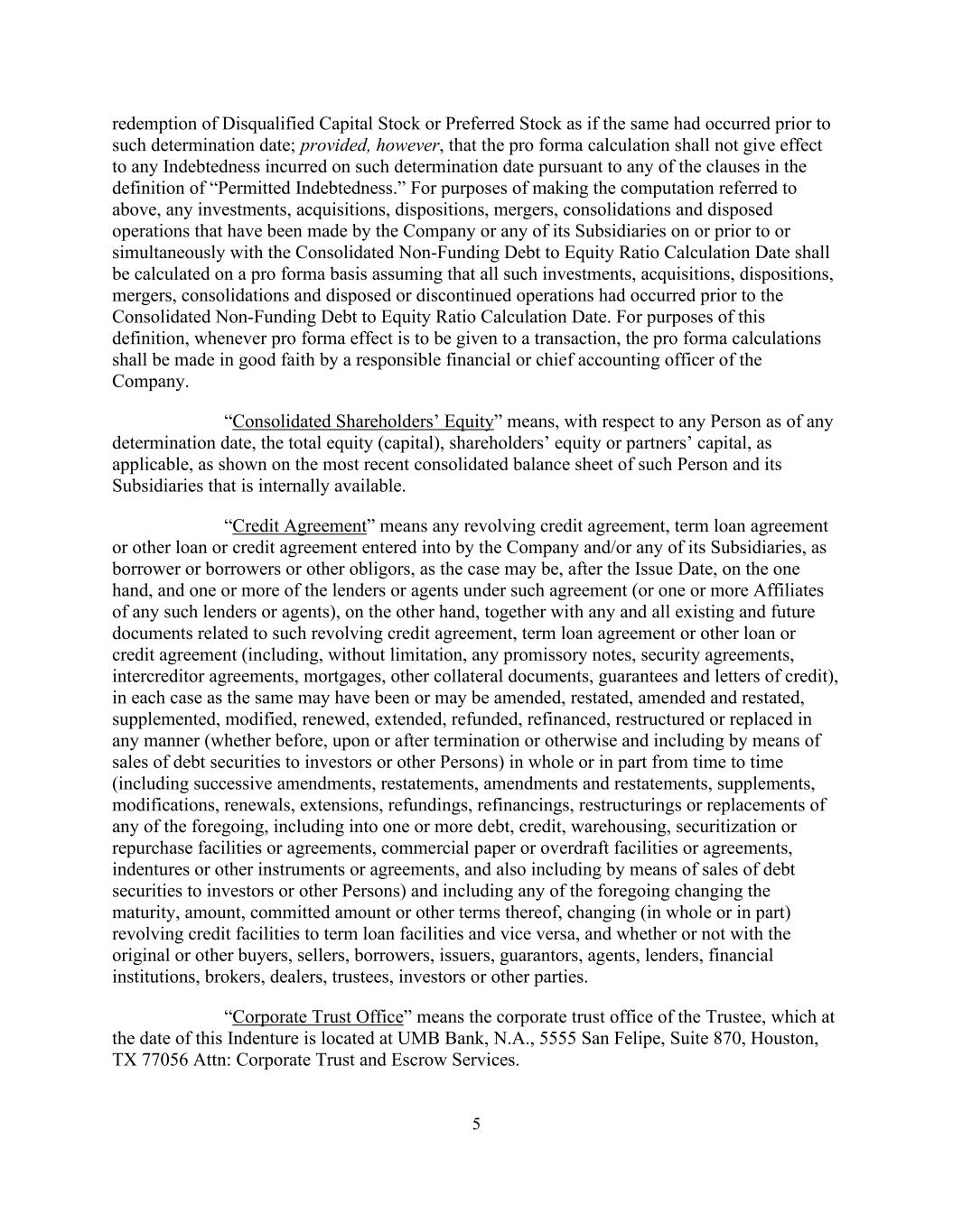 5 redemption of Disqualified Capital Stock or Preferred Stock as if the same had occurred prior to such determination date; provided, however, that the pro forma calculation shall not give effect to any Indebtedness incurred on such determination date pursuant to any of the clauses in the definition of “Permitted Indebtedness.” For purposes of making the computation referred to above, any investments, acquisitions, dispositions, mergers, consolidations and disposed operations that have been made by the Company or any of its Subsidiaries on or prior to or simultaneously with the Consolidated Non-Funding Debt to Equity Ratio Calculation Date shall be calculated on a pro forma basis assuming that all such investments, acquisitions, dispositions, mergers, consolidations and disposed or discontinued operations had occurred prior to the Consolidated Non-Funding Debt to Equity Ratio Calculation Date. For purposes of this definition, whenever pro forma effect is to be given to a transaction, the pro forma calculations shall be made in good faith by a responsible financial or chief accounting officer of the Company. “Consolidated Shareholders’ Equity” means, with respect to any Person as of any determination date, the total equity (capital), shareholders’ equity or partners’ capital, as applicable, as shown on the most recent consolidated balance sheet of such Person and its Subsidiaries that is internally available. “Credit Agreement” means any revolving credit agreement, term loan agreement or other loan or credit agreement entered into by the Company and/or any of its Subsidiaries, as borrower or borrowers or other obligors, as the case may be, after the Issue Date, on the one hand, and one or more of the lenders or agents under such agreement (or one or more Affiliates of any such lenders or agents), on the other hand, together with any and all existing and future documents related to such revolving credit agreement, term loan agreement or other loan or credit agreement (including, without limitation, any promissory notes, security agreements, intercreditor agreements, mortgages, other collateral documents, guarantees and letters of credit), in each case as the same may have been or may be amended, restated, amended and restated, supplemented, modified, renewed, extended, refunded, refinanced, restructured or replaced in any manner (whether before, upon or after termination or otherwise and including by means of sales of debt securities to investors or other Persons) in whole or in part from time to time (including successive amendments, restatements, amendments and restatements, supplements, modifications, renewals, extensions, refundings, refinancings, restructurings or replacements of any of the foregoing, including into one or more debt, credit, warehousing, securitization or repurchase facilities or agreements, commercial paper or overdraft facilities or agreements, indentures or other instruments or agreements, and also including by means of sales of debt securities to investors or other Persons) and including any of the foregoing changing the maturity, amount, committed amount or other terms thereof, changing (in whole or in part) revolving credit facilities to term loan facilities and vice versa, and whether or not with the original or other buyers, sellers, borrowers, issuers, guarantors, agents, lenders, financial institutions, brokers, dealers, trustees, investors or other parties. “Corporate Trust Office” means the corporate trust office of the Trustee, which at the date of this Indenture is located at UMB Bank, N.A., 5555 San Felipe, Suite 870, Houston, TX 77056 Attn: Corporate Trust and Escrow Services.