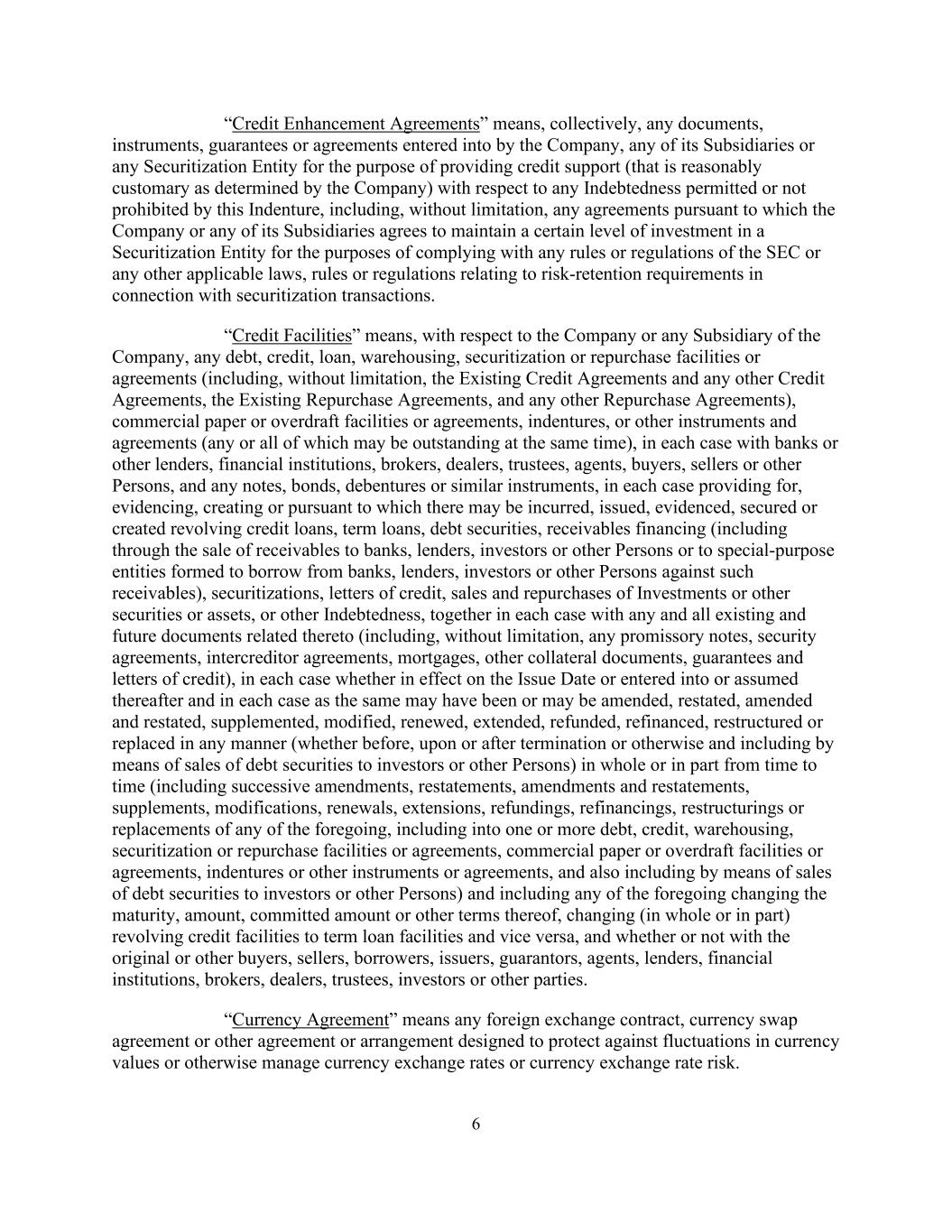 6 “Credit Enhancement Agreements” means, collectively, any documents, instruments, guarantees or agreements entered into by the Company, any of its Subsidiaries or any Securitization Entity for the purpose of providing credit support (that is reasonably customary as determined by the Company) with respect to any Indebtedness permitted or not prohibited by this Indenture, including, without limitation, any agreements pursuant to which the Company or any of its Subsidiaries agrees to maintain a certain level of investment in a Securitization Entity for the purposes of complying with any rules or regulations of the SEC or any other applicable laws, rules or regulations relating to risk-retention requirements in connection with securitization transactions. “Credit Facilities” means, with respect to the Company or any Subsidiary of the Company, any debt, credit, loan, warehousing, securitization or repurchase facilities or agreements (including, without limitation, the Existing Credit Agreements and any other Credit Agreements, the Existing Repurchase Agreements, and any other Repurchase Agreements), commercial paper or overdraft facilities or agreements, indentures, or other instruments and agreements (any or all of which may be outstanding at the same time), in each case with banks or other lenders, financial institutions, brokers, dealers, trustees, agents, buyers, sellers or other Persons, and any notes, bonds, debentures or similar instruments, in each case providing for, evidencing, creating or pursuant to which there may be incurred, issued, evidenced, secured or created revolving credit loans, term loans, debt securities, receivables financing (including through the sale of receivables to banks, lenders, investors or other Persons or to special-purpose entities formed to borrow from banks, lenders, investors or other Persons against such receivables), securitizations, letters of credit, sales and repurchases of Investments or other securities or assets, or other Indebtedness, together in each case with any and all existing and future documents related thereto (including, without limitation, any promissory notes, security agreements, intercreditor agreements, mortgages, other collateral documents, guarantees and letters of credit), in each case whether in effect on the Issue Date or entered into or assumed thereafter and in each case as the same may have been or may be amended, restated, amended and restated, supplemented, modified, renewed, extended, refunded, refinanced, restructured or replaced in any manner (whether before, upon or after termination or otherwise and including by means of sales of debt securities to investors or other Persons) in whole or in part from time to time (including successive amendments, restatements, amendments and restatements, supplements, modifications, renewals, extensions, refundings, refinancings, restructurings or replacements of any of the foregoing, including into one or more debt, credit, warehousing, securitization or repurchase facilities or agreements, commercial paper or overdraft facilities or agreements, indentures or other instruments or agreements, and also including by means of sales of debt securities to investors or other Persons) and including any of the foregoing changing the maturity, amount, committed amount or other terms thereof, changing (in whole or in part) revolving credit facilities to term loan facilities and vice versa, and whether or not with the original or other buyers, sellers, borrowers, issuers, guarantors, agents, lenders, financial institutions, brokers, dealers, trustees, investors or other parties. “Currency Agreement” means any foreign exchange contract, currency swap agreement or other agreement or arrangement designed to protect against fluctuations in currency values or otherwise manage currency exchange rates or currency exchange rate risk.
