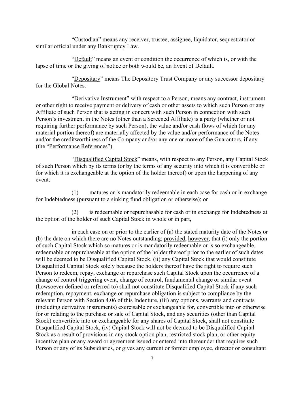 7 “Custodian” means any receiver, trustee, assignee, liquidator, sequestrator or similar official under any Bankruptcy Law. “Default” means an event or condition the occurrence of which is, or with the lapse of time or the giving of notice or both would be, an Event of Default. “Depositary” means The Depository Trust Company or any successor depositary for the Global Notes. “Derivative Instrument” with respect to a Person, means any contract, instrument or other right to receive payment or delivery of cash or other assets to which such Person or any Affiliate of such Person that is acting in concert with such Person in connection with such Person’s investment in the Notes (other than a Screened Affiliate) is a party (whether or not requiring further performance by such Person), the value and/or cash flows of which (or any material portion thereof) are materially affected by the value and/or performance of the Notes and/or the creditworthiness of the Company and/or any one or more of the Guarantors, if any (the “Performance References”). “Disqualified Capital Stock” means, with respect to any Person, any Capital Stock of such Person which by its terms (or by the terms of any security into which it is convertible or for which it is exchangeable at the option of the holder thereof) or upon the happening of any event: (1) matures or is mandatorily redeemable in each case for cash or in exchange for Indebtedness (pursuant to a sinking fund obligation or otherwise); or (2) is redeemable or repurchasable for cash or in exchange for Indebtedness at the option of the holder of such Capital Stock in whole or in part, in each case on or prior to the earlier of (a) the stated maturity date of the Notes or (b) the date on which there are no Notes outstanding; provided, however, that (i) only the portion of such Capital Stock which so matures or is mandatorily redeemable or is so exchangeable, redeemable or repurchasable at the option of the holder thereof prior to the earlier of such dates will be deemed to be Disqualified Capital Stock, (ii) any Capital Stock that would constitute Disqualified Capital Stock solely because the holders thereof have the right to require such Person to redeem, repay, exchange or repurchase such Capital Stock upon the occurrence of a change of control triggering event, change of control, fundamental change or similar event (howsoever defined or referred to) shall not constitute Disqualified Capital Stock if any such redemption, repayment, exchange or repurchase obligation is subject to compliance by the relevant Person with Section 4.06 of this Indenture, (iii) any options, warrants and contracts (including derivative instruments) exercisable or exchangeable for, convertible into or otherwise for or relating to the purchase or sale of Capital Stock, and any securities (other than Capital Stock) convertible into or exchangeable for any shares of Capital Stock, shall not constitute Disqualified Capital Stock, (iv) Capital Stock will not be deemed to be Disqualified Capital Stock as a result of provisions in any stock option plan, restricted stock plan, or other equity incentive plan or any award or agreement issued or entered into thereunder that requires such Person or any of its Subsidiaries, or gives any current or former employee, director or consultant