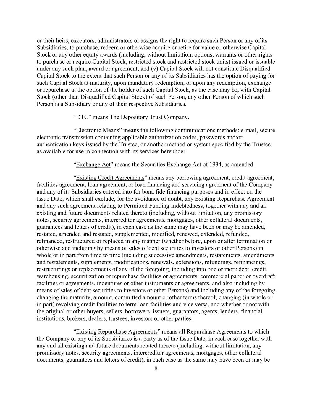 8 or their heirs, executors, administrators or assigns the right to require such Person or any of its Subsidiaries, to purchase, redeem or otherwise acquire or retire for value or otherwise Capital Stock or any other equity awards (including, without limitation, options, warrants or other rights to purchase or acquire Capital Stock, restricted stock and restricted stock units) issued or issuable under any such plan, award or agreement; and (v) Capital Stock will not constitute Disqualified Capital Stock to the extent that such Person or any of its Subsidiaries has the option of paying for such Capital Stock at maturity, upon mandatory redemption, or upon any redemption, exchange or repurchase at the option of the holder of such Capital Stock, as the case may be, with Capital Stock (other than Disqualified Capital Stock) of such Person, any other Person of which such Person is a Subsidiary or any of their respective Subsidiaries. “DTC” means The Depository Trust Company. “Electronic Means” means the following communications methods: e-mail, secure electronic transmission containing applicable authorization codes, passwords and/or authentication keys issued by the Trustee, or another method or system specified by the Trustee as available for use in connection with its services hereunder. “Exchange Act” means the Securities Exchange Act of 1934, as amended. “Existing Credit Agreements” means any borrowing agreement, credit agreement, facilities agreement, loan agreement, or loan financing and servicing agreement of the Company and any of its Subsidiaries entered into for bona fide financing purposes and in effect on the Issue Date, which shall exclude, for the avoidance of doubt, any Existing Repurchase Agreement and any such agreement relating to Permitted Funding Indebtedness, together with any and all existing and future documents related thereto (including, without limitation, any promissory notes, security agreements, intercreditor agreements, mortgages, other collateral documents, guarantees and letters of credit), in each case as the same may have been or may be amended, restated, amended and restated, supplemented, modified, renewed, extended, refunded, refinanced, restructured or replaced in any manner (whether before, upon or after termination or otherwise and including by means of sales of debt securities to investors or other Persons) in whole or in part from time to time (including successive amendments, restatements, amendments and restatements, supplements, modifications, renewals, extensions, refundings, refinancings, restructurings or replacements of any of the foregoing, including into one or more debt, credit, warehousing, securitization or repurchase facilities or agreements, commercial paper or overdraft facilities or agreements, indentures or other instruments or agreements, and also including by means of sales of debt securities to investors or other Persons) and including any of the foregoing changing the maturity, amount, committed amount or other terms thereof, changing (in whole or in part) revolving credit facilities to term loan facilities and vice versa, and whether or not with the original or other buyers, sellers, borrowers, issuers, guarantors, agents, lenders, financial institutions, brokers, dealers, trustees, investors or other parties. “Existing Repurchase Agreements” means all Repurchase Agreements to which the Company or any of its Subsidiaries is a party as of the Issue Date, in each case together with any and all existing and future documents related thereto (including, without limitation, any promissory notes, security agreements, intercreditor agreements, mortgages, other collateral documents, guarantees and letters of credit), in each case as the same may have been or may be