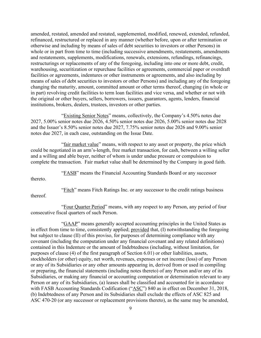 9 amended, restated, amended and restated, supplemented, modified, renewed, extended, refunded, refinanced, restructured or replaced in any manner (whether before, upon or after termination or otherwise and including by means of sales of debt securities to investors or other Persons) in whole or in part from time to time (including successive amendments, restatements, amendments and restatements, supplements, modifications, renewals, extensions, refundings, refinancings, restructurings or replacements of any of the foregoing, including into one or more debt, credit, warehousing, securitization or repurchase facilities or agreements, commercial paper or overdraft facilities or agreements, indentures or other instruments or agreements, and also including by means of sales of debt securities to investors or other Persons) and including any of the foregoing changing the maturity, amount, committed amount or other terms thereof, changing (in whole or in part) revolving credit facilities to term loan facilities and vice versa, and whether or not with the original or other buyers, sellers, borrowers, issuers, guarantors, agents, lenders, financial institutions, brokers, dealers, trustees, investors or other parties. “Existing Senior Notes” means, collectively, the Company’s 4.50% notes due 2027, 5.00% senior notes due 2026, 4.50% senior notes due 2026, 5.00% senior notes due 2028 and the Issuer’s 8.50% senior notes due 2027, 7.75% senior notes due 2026 and 9.00% senior notes due 2027, in each case, outstanding on the Issue Date. “fair market value” means, with respect to any asset or property, the price which could be negotiated in an arm’s-length, free market transaction, for cash, between a willing seller and a willing and able buyer, neither of whom is under undue pressure or compulsion to complete the transaction. Fair market value shall be determined by the Company in good faith. “FASB” means the Financial Accounting Standards Board or any successor thereto. “Fitch” means Fitch Ratings Inc. or any successor to the credit ratings business thereof. “Four Quarter Period” means, with any respect to any Person, any period of four consecutive fiscal quarters of such Person. “GAAP” means generally accepted accounting principles in the United States as in effect from time to time, consistently applied; provided that, (I) notwithstanding the foregoing but subject to clause (II) of this proviso, for purposes of determining compliance with any covenant (including the computation under any financial covenant and any related definitions) contained in this Indenture or the amount of Indebtedness (including, without limitation, for purposes of clause (4) of the first paragraph of Section 6.01) or other liabilities, assets, stockholders (or other) equity, net worth, revenues, expenses or net income (loss) of any Person or any of its Subsidiaries or any other amounts appearing in, derived from or used in compiling or preparing, the financial statements (including notes thereto) of any Person and/or any of its Subsidiaries, or making any financial or accounting computation or determination relevant to any Person or any of its Subsidiaries, (a) leases shall be classified and accounted for in accordance with FASB Accounting Standards Codification (“ASC”) 840 as in effect on December 31, 2018, (b) Indebtedness of any Person and its Subsidiaries shall exclude the effects of ASC 825 and ASC 470-20 (or any successor or replacement provisions thereto), as the same may be amended,