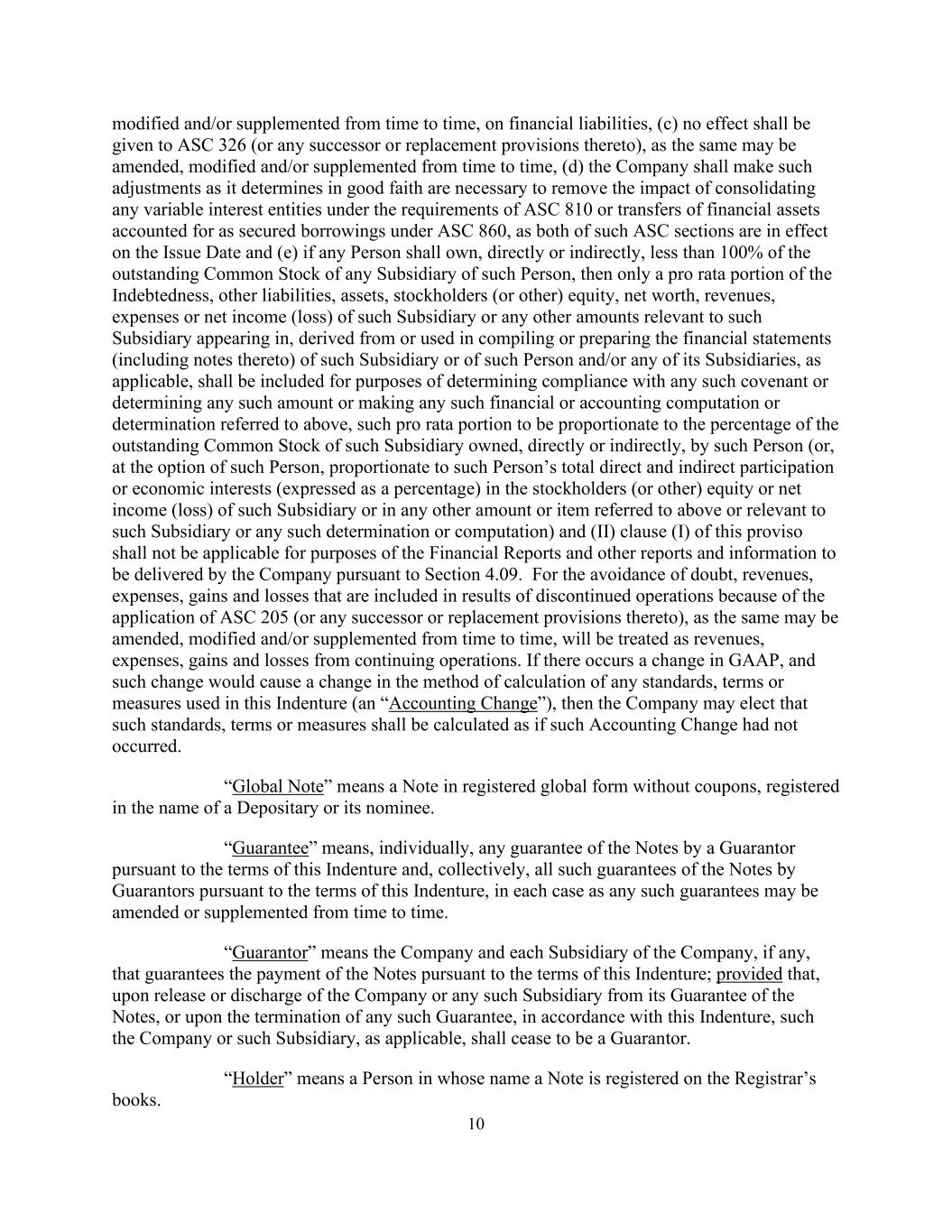 10 modified and/or supplemented from time to time, on financial liabilities, (c) no effect shall be given to ASC 326 (or any successor or replacement provisions thereto), as the same may be amended, modified and/or supplemented from time to time, (d) the Company shall make such adjustments as it determines in good faith are necessary to remove the impact of consolidating any variable interest entities under the requirements of ASC 810 or transfers of financial assets accounted for as secured borrowings under ASC 860, as both of such ASC sections are in effect on the Issue Date and (e) if any Person shall own, directly or indirectly, less than 100% of the outstanding Common Stock of any Subsidiary of such Person, then only a pro rata portion of the Indebtedness, other liabilities, assets, stockholders (or other) equity, net worth, revenues, expenses or net income (loss) of such Subsidiary or any other amounts relevant to such Subsidiary appearing in, derived from or used in compiling or preparing the financial statements (including notes thereto) of such Subsidiary or of such Person and/or any of its Subsidiaries, as applicable, shall be included for purposes of determining compliance with any such covenant or determining any such amount or making any such financial or accounting computation or determination referred to above, such pro rata portion to be proportionate to the percentage of the outstanding Common Stock of such Subsidiary owned, directly or indirectly, by such Person (or, at the option of such Person, proportionate to such Person’s total direct and indirect participation or economic interests (expressed as a percentage) in the stockholders (or other) equity or net income (loss) of such Subsidiary or in any other amount or item referred to above or relevant to such Subsidiary or any such determination or computation) and (II) clause (I) of this proviso shall not be applicable for purposes of the Financial Reports and other reports and information to be delivered by the Company pursuant to Section 4.09. For the avoidance of doubt, revenues, expenses, gains and losses that are included in results of discontinued operations because of the application of ASC 205 (or any successor or replacement provisions thereto), as the same may be amended, modified and/or supplemented from time to time, will be treated as revenues, expenses, gains and losses from continuing operations. If there occurs a change in GAAP, and such change would cause a change in the method of calculation of any standards, terms or measures used in this Indenture (an “Accounting Change”), then the Company may elect that such standards, terms or measures shall be calculated as if such Accounting Change had not occurred. “Global Note” means a Note in registered global form without coupons, registered in the name of a Depositary or its nominee. “Guarantee” means, individually, any guarantee of the Notes by a Guarantor pursuant to the terms of this Indenture and, collectively, all such guarantees of the Notes by Guarantors pursuant to the terms of this Indenture, in each case as any such guarantees may be amended or supplemented from time to time. “Guarantor” means the Company and each Subsidiary of the Company, if any, that guarantees the payment of the Notes pursuant to the terms of this Indenture; provided that, upon release or discharge of the Company or any such Subsidiary from its Guarantee of the Notes, or upon the termination of any such Guarantee, in accordance with this Indenture, such the Company or such Subsidiary, as applicable, shall cease to be a Guarantor. “Holder” means a Person in whose name a Note is registered on the Registrar’s books.