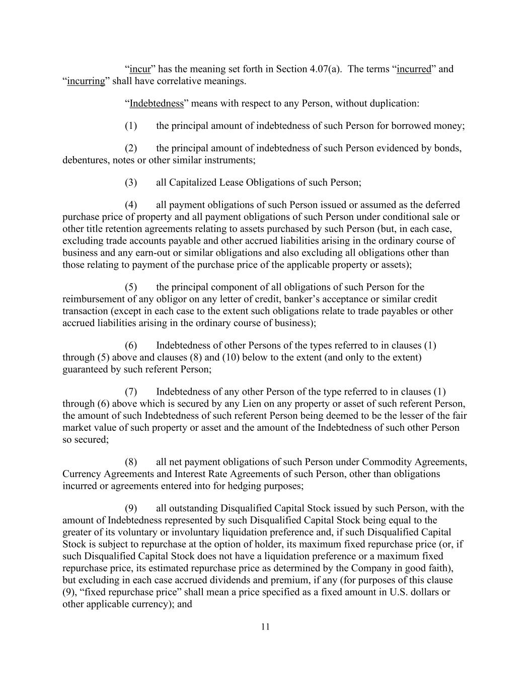 11 “incur” has the meaning set forth in Section 4.07(a). The terms “incurred” and “incurring” shall have correlative meanings. “Indebtedness” means with respect to any Person, without duplication: (1) the principal amount of indebtedness of such Person for borrowed money; (2) the principal amount of indebtedness of such Person evidenced by bonds, debentures, notes or other similar instruments; (3) all Capitalized Lease Obligations of such Person; (4) all payment obligations of such Person issued or assumed as the deferred purchase price of property and all payment obligations of such Person under conditional sale or other title retention agreements relating to assets purchased by such Person (but, in each case, excluding trade accounts payable and other accrued liabilities arising in the ordinary course of business and any earn-out or similar obligations and also excluding all obligations other than those relating to payment of the purchase price of the applicable property or assets); (5) the principal component of all obligations of such Person for the reimbursement of any obligor on any letter of credit, banker’s acceptance or similar credit transaction (except in each case to the extent such obligations relate to trade payables or other accrued liabilities arising in the ordinary course of business); (6) Indebtedness of other Persons of the types referred to in clauses (1) through (5) above and clauses (8) and (10) below to the extent (and only to the extent) guaranteed by such referent Person; (7) Indebtedness of any other Person of the type referred to in clauses (1) through (6) above which is secured by any Lien on any property or asset of such referent Person, the amount of such Indebtedness of such referent Person being deemed to be the lesser of the fair market value of such property or asset and the amount of the Indebtedness of such other Person so secured; (8) all net payment obligations of such Person under Commodity Agreements, Currency Agreements and Interest Rate Agreements of such Person, other than obligations incurred or agreements entered into for hedging purposes; (9) all outstanding Disqualified Capital Stock issued by such Person, with the amount of Indebtedness represented by such Disqualified Capital Stock being equal to the greater of its voluntary or involuntary liquidation preference and, if such Disqualified Capital Stock is subject to repurchase at the option of holder, its maximum fixed repurchase price (or, if such Disqualified Capital Stock does not have a liquidation preference or a maximum fixed repurchase price, its estimated repurchase price as determined by the Company in good faith), but excluding in each case accrued dividends and premium, if any (for purposes of this clause (9), “fixed repurchase price” shall mean a price specified as a fixed amount in U.S. dollars or other applicable currency); and