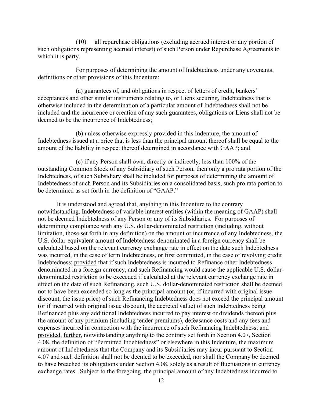 12 (10) all repurchase obligations (excluding accrued interest or any portion of such obligations representing accrued interest) of such Person under Repurchase Agreements to which it is party. For purposes of determining the amount of Indebtedness under any covenants, definitions or other provisions of this Indenture: (a) guarantees of, and obligations in respect of letters of credit, bankers’ acceptances and other similar instruments relating to, or Liens securing, Indebtedness that is otherwise included in the determination of a particular amount of Indebtedness shall not be included and the incurrence or creation of any such guarantees, obligations or Liens shall not be deemed to be the incurrence of Indebtedness; (b) unless otherwise expressly provided in this Indenture, the amount of Indebtedness issued at a price that is less than the principal amount thereof shall be equal to the amount of the liability in respect thereof determined in accordance with GAAP; and (c) if any Person shall own, directly or indirectly, less than 100% of the outstanding Common Stock of any Subsidiary of such Person, then only a pro rata portion of the Indebtedness, of such Subsidiary shall be included for purposes of determining the amount of Indebtedness of such Person and its Subsidiaries on a consolidated basis, such pro rata portion to be determined as set forth in the definition of “GAAP.” It is understood and agreed that, anything in this Indenture to the contrary notwithstanding, Indebtedness of variable interest entities (within the meaning of GAAP) shall not be deemed Indebtedness of any Person or any of its Subsidiaries. For purposes of determining compliance with any U.S. dollar-denominated restriction (including, without limitation, those set forth in any definition) on the amount or incurrence of any Indebtedness, the U.S. dollar-equivalent amount of Indebtedness denominated in a foreign currency shall be calculated based on the relevant currency exchange rate in effect on the date such Indebtedness was incurred, in the case of term Indebtedness, or first committed, in the case of revolving credit Indebtedness; provided that if such Indebtedness is incurred to Refinance other Indebtedness denominated in a foreign currency, and such Refinancing would cause the applicable U.S. dollar- denominated restriction to be exceeded if calculated at the relevant currency exchange rate in effect on the date of such Refinancing, such U.S. dollar-denominated restriction shall be deemed not to have been exceeded so long as the principal amount (or, if incurred with original issue discount, the issue price) of such Refinancing Indebtedness does not exceed the principal amount (or if incurred with original issue discount, the accreted value) of such Indebtedness being Refinanced plus any additional Indebtedness incurred to pay interest or dividends thereon plus the amount of any premium (including tender premiums), defeasance costs and any fees and expenses incurred in connection with the incurrence of such Refinancing Indebtedness; and provided, further, notwithstanding anything to the contrary set forth in Section 4.07, Section 4.08, the definition of “Permitted Indebtedness” or elsewhere in this Indenture, the maximum amount of Indebtedness that the Company and its Subsidiaries may incur pursuant to Section 4.07 and such definition shall not be deemed to be exceeded, nor shall the Company be deemed to have breached its obligations under Section 4.08, solely as a result of fluctuations in currency exchange rates. Subject to the foregoing, the principal amount of any Indebtedness incurred to