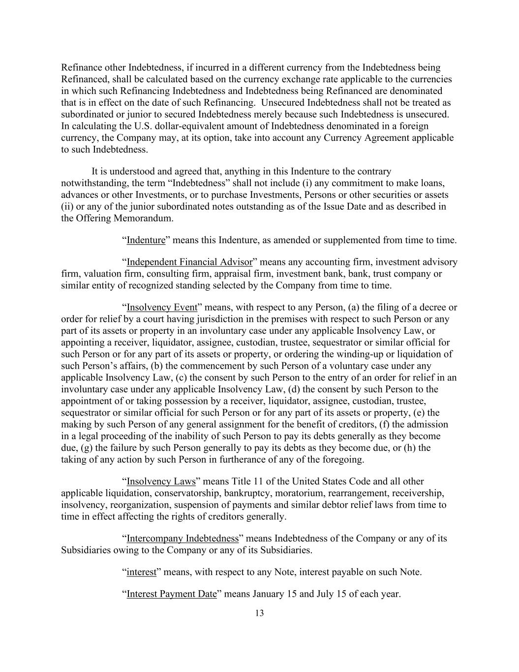 13 Refinance other Indebtedness, if incurred in a different currency from the Indebtedness being Refinanced, shall be calculated based on the currency exchange rate applicable to the currencies in which such Refinancing Indebtedness and Indebtedness being Refinanced are denominated that is in effect on the date of such Refinancing. Unsecured Indebtedness shall not be treated as subordinated or junior to secured Indebtedness merely because such Indebtedness is unsecured. In calculating the U.S. dollar-equivalent amount of Indebtedness denominated in a foreign currency, the Company may, at its option, take into account any Currency Agreement applicable to such Indebtedness. It is understood and agreed that, anything in this Indenture to the contrary notwithstanding, the term “Indebtedness” shall not include (i) any commitment to make loans, advances or other Investments, or to purchase Investments, Persons or other securities or assets (ii) or any of the junior subordinated notes outstanding as of the Issue Date and as described in the Offering Memorandum. “Indenture” means this Indenture, as amended or supplemented from time to time. “Independent Financial Advisor” means any accounting firm, investment advisory firm, valuation firm, consulting firm, appraisal firm, investment bank, bank, trust company or similar entity of recognized standing selected by the Company from time to time. “Insolvency Event” means, with respect to any Person, (a) the filing of a decree or order for relief by a court having jurisdiction in the premises with respect to such Person or any part of its assets or property in an involuntary case under any applicable Insolvency Law, or appointing a receiver, liquidator, assignee, custodian, trustee, sequestrator or similar official for such Person or for any part of its assets or property, or ordering the winding-up or liquidation of such Person’s affairs, (b) the commencement by such Person of a voluntary case under any applicable Insolvency Law, (c) the consent by such Person to the entry of an order for relief in an involuntary case under any applicable Insolvency Law, (d) the consent by such Person to the appointment of or taking possession by a receiver, liquidator, assignee, custodian, trustee, sequestrator or similar official for such Person or for any part of its assets or property, (e) the making by such Person of any general assignment for the benefit of creditors, (f) the admission in a legal proceeding of the inability of such Person to pay its debts generally as they become due, (g) the failure by such Person generally to pay its debts as they become due, or (h) the taking of any action by such Person in furtherance of any of the foregoing. “Insolvency Laws” means Title 11 of the United States Code and all other applicable liquidation, conservatorship, bankruptcy, moratorium, rearrangement, receivership, insolvency, reorganization, suspension of payments and similar debtor relief laws from time to time in effect affecting the rights of creditors generally. “Intercompany Indebtedness” means Indebtedness of the Company or any of its Subsidiaries owing to the Company or any of its Subsidiaries. “interest” means, with respect to any Note, interest payable on such Note. “Interest Payment Date” means January 15 and July 15 of each year.