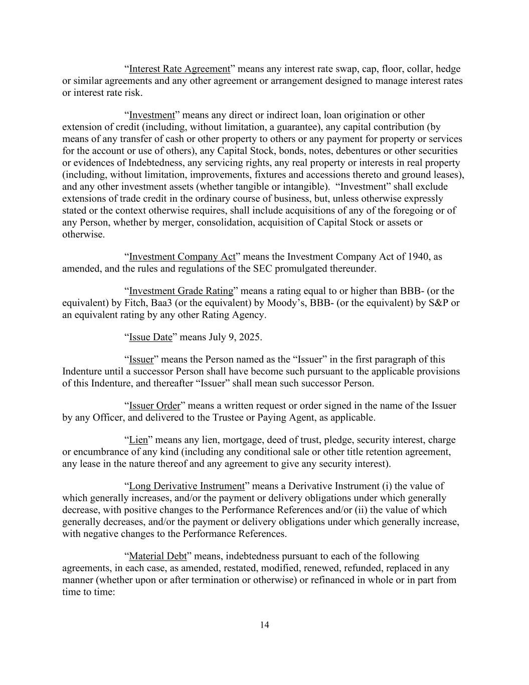 14 “Interest Rate Agreement” means any interest rate swap, cap, floor, collar, hedge or similar agreements and any other agreement or arrangement designed to manage interest rates or interest rate risk. “Investment” means any direct or indirect loan, loan origination or other extension of credit (including, without limitation, a guarantee), any capital contribution (by means of any transfer of cash or other property to others or any payment for property or services for the account or use of others), any Capital Stock, bonds, notes, debentures or other securities or evidences of Indebtedness, any servicing rights, any real property or interests in real property (including, without limitation, improvements, fixtures and accessions thereto and ground leases), and any other investment assets (whether tangible or intangible). “Investment” shall exclude extensions of trade credit in the ordinary course of business, but, unless otherwise expressly stated or the context otherwise requires, shall include acquisitions of any of the foregoing or of any Person, whether by merger, consolidation, acquisition of Capital Stock or assets or otherwise. “Investment Company Act” means the Investment Company Act of 1940, as amended, and the rules and regulations of the SEC promulgated thereunder. “Investment Grade Rating” means a rating equal to or higher than BBB- (or the equivalent) by Fitch, Baa3 (or the equivalent) by Moody’s, BBB- (or the equivalent) by S&P or an equivalent rating by any other Rating Agency. “Issue Date” means July 9, 2025. “Issuer” means the Person named as the “Issuer” in the first paragraph of this Indenture until a successor Person shall have become such pursuant to the applicable provisions of this Indenture, and thereafter “Issuer” shall mean such successor Person. “Issuer Order” means a written request or order signed in the name of the Issuer by any Officer, and delivered to the Trustee or Paying Agent, as applicable. “Lien” means any lien, mortgage, deed of trust, pledge, security interest, charge or encumbrance of any kind (including any conditional sale or other title retention agreement, any lease in the nature thereof and any agreement to give any security interest). “Long Derivative Instrument” means a Derivative Instrument (i) the value of which generally increases, and/or the payment or delivery obligations under which generally decrease, with positive changes to the Performance References and/or (ii) the value of which generally decreases, and/or the payment or delivery obligations under which generally increase, with negative changes to the Performance References. “Material Debt” means, indebtedness pursuant to each of the following agreements, in each case, as amended, restated, modified, renewed, refunded, replaced in any manner (whether upon or after termination or otherwise) or refinanced in whole or in part from time to time: