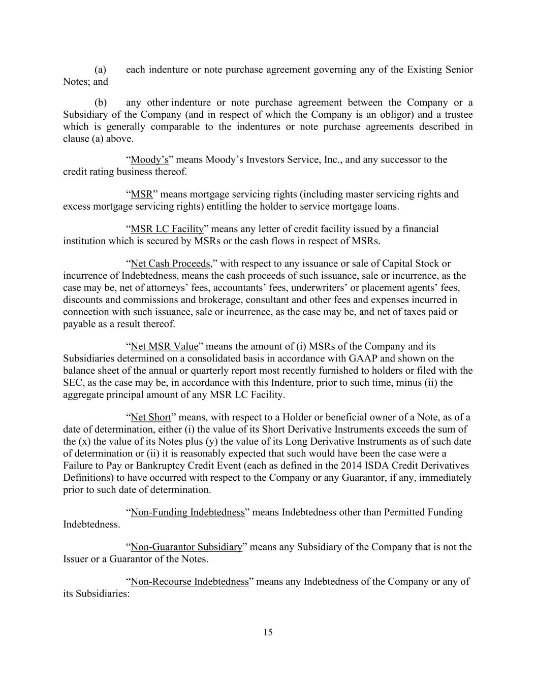15 (a) each indenture or note purchase agreement governing any of the Existing Senior Notes; and (b) any other indenture or note purchase agreement between the Company or a Subsidiary of the Company (and in respect of which the Company is an obligor) and a trustee which is generally comparable to the indentures or note purchase agreements described in clause (a) above. “Moody’s” means Moody’s Investors Service, Inc., and any successor to the credit rating business thereof. “MSR” means mortgage servicing rights (including master servicing rights and excess mortgage servicing rights) entitling the holder to service mortgage loans. “MSR LC Facility” means any letter of credit facility issued by a financial institution which is secured by MSRs or the cash flows in respect of MSRs. “Net Cash Proceeds,” with respect to any issuance or sale of Capital Stock or incurrence of Indebtedness, means the cash proceeds of such issuance, sale or incurrence, as the case may be, net of attorneys’ fees, accountants’ fees, underwriters’ or placement agents’ fees, discounts and commissions and brokerage, consultant and other fees and expenses incurred in connection with such issuance, sale or incurrence, as the case may be, and net of taxes paid or payable as a result thereof. “Net MSR Value” means the amount of (i) MSRs of the Company and its Subsidiaries determined on a consolidated basis in accordance with GAAP and shown on the balance sheet of the annual or quarterly report most recently furnished to holders or filed with the SEC, as the case may be, in accordance with this Indenture, prior to such time, minus (ii) the aggregate principal amount of any MSR LC Facility. “Net Short” means, with respect to a Holder or beneficial owner of a Note, as of a date of determination, either (i) the value of its Short Derivative Instruments exceeds the sum of the (x) the value of its Notes plus (y) the value of its Long Derivative Instruments as of such date of determination or (ii) it is reasonably expected that such would have been the case were a Failure to Pay or Bankruptcy Credit Event (each as defined in the 2014 ISDA Credit Derivatives Definitions) to have occurred with respect to the Company or any Guarantor, if any, immediately prior to such date of determination. “Non-Funding Indebtedness” means Indebtedness other than Permitted Funding Indebtedness. “Non-Guarantor Subsidiary” means any Subsidiary of the Company that is not the Issuer or a Guarantor of the Notes. “Non-Recourse Indebtedness” means any Indebtedness of the Company or any of its Subsidiaries: