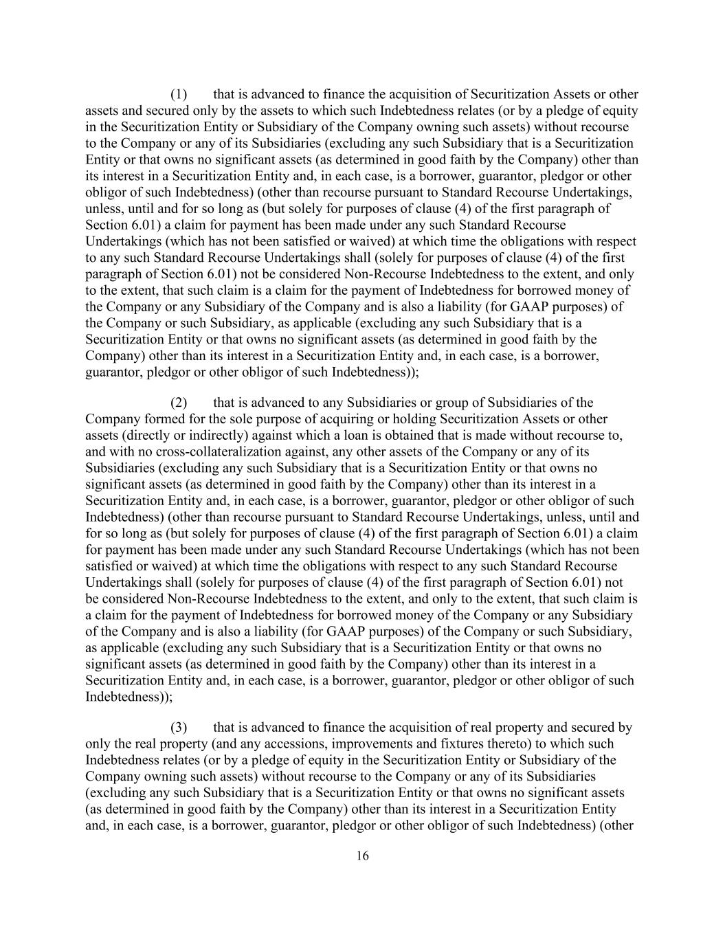 16 (1) that is advanced to finance the acquisition of Securitization Assets or other assets and secured only by the assets to which such Indebtedness relates (or by a pledge of equity in the Securitization Entity or Subsidiary of the Company owning such assets) without recourse to the Company or any of its Subsidiaries (excluding any such Subsidiary that is a Securitization Entity or that owns no significant assets (as determined in good faith by the Company) other than its interest in a Securitization Entity and, in each case, is a borrower, guarantor, pledgor or other obligor of such Indebtedness) (other than recourse pursuant to Standard Recourse Undertakings, unless, until and for so long as (but solely for purposes of clause (4) of the first paragraph of Section 6.01) a claim for payment has been made under any such Standard Recourse Undertakings (which has not been satisfied or waived) at which time the obligations with respect to any such Standard Recourse Undertakings shall (solely for purposes of clause (4) of the first paragraph of Section 6.01) not be considered Non-Recourse Indebtedness to the extent, and only to the extent, that such claim is a claim for the payment of Indebtedness for borrowed money of the Company or any Subsidiary of the Company and is also a liability (for GAAP purposes) of the Company or such Subsidiary, as applicable (excluding any such Subsidiary that is a Securitization Entity or that owns no significant assets (as determined in good faith by the Company) other than its interest in a Securitization Entity and, in each case, is a borrower, guarantor, pledgor or other obligor of such Indebtedness)); (2) that is advanced to any Subsidiaries or group of Subsidiaries of the Company formed for the sole purpose of acquiring or holding Securitization Assets or other assets (directly or indirectly) against which a loan is obtained that is made without recourse to, and with no cross-collateralization against, any other assets of the Company or any of its Subsidiaries (excluding any such Subsidiary that is a Securitization Entity or that owns no significant assets (as determined in good faith by the Company) other than its interest in a Securitization Entity and, in each case, is a borrower, guarantor, pledgor or other obligor of such Indebtedness) (other than recourse pursuant to Standard Recourse Undertakings, unless, until and for so long as (but solely for purposes of clause (4) of the first paragraph of Section 6.01) a claim for payment has been made under any such Standard Recourse Undertakings (which has not been satisfied or waived) at which time the obligations with respect to any such Standard Recourse Undertakings shall (solely for purposes of clause (4) of the first paragraph of Section 6.01) not be considered Non-Recourse Indebtedness to the extent, and only to the extent, that such claim is a claim for the payment of Indebtedness for borrowed money of the Company or any Subsidiary of the Company and is also a liability (for GAAP purposes) of the Company or such Subsidiary, as applicable (excluding any such Subsidiary that is a Securitization Entity or that owns no significant assets (as determined in good faith by the Company) other than its interest in a Securitization Entity and, in each case, is a borrower, guarantor, pledgor or other obligor of such Indebtedness)); (3) that is advanced to finance the acquisition of real property and secured by only the real property (and any accessions, improvements and fixtures thereto) to which such Indebtedness relates (or by a pledge of equity in the Securitization Entity or Subsidiary of the Company owning such assets) without recourse to the Company or any of its Subsidiaries (excluding any such Subsidiary that is a Securitization Entity or that owns no significant assets (as determined in good faith by the Company) other than its interest in a Securitization Entity and, in each case, is a borrower, guarantor, pledgor or other obligor of such Indebtedness) (other