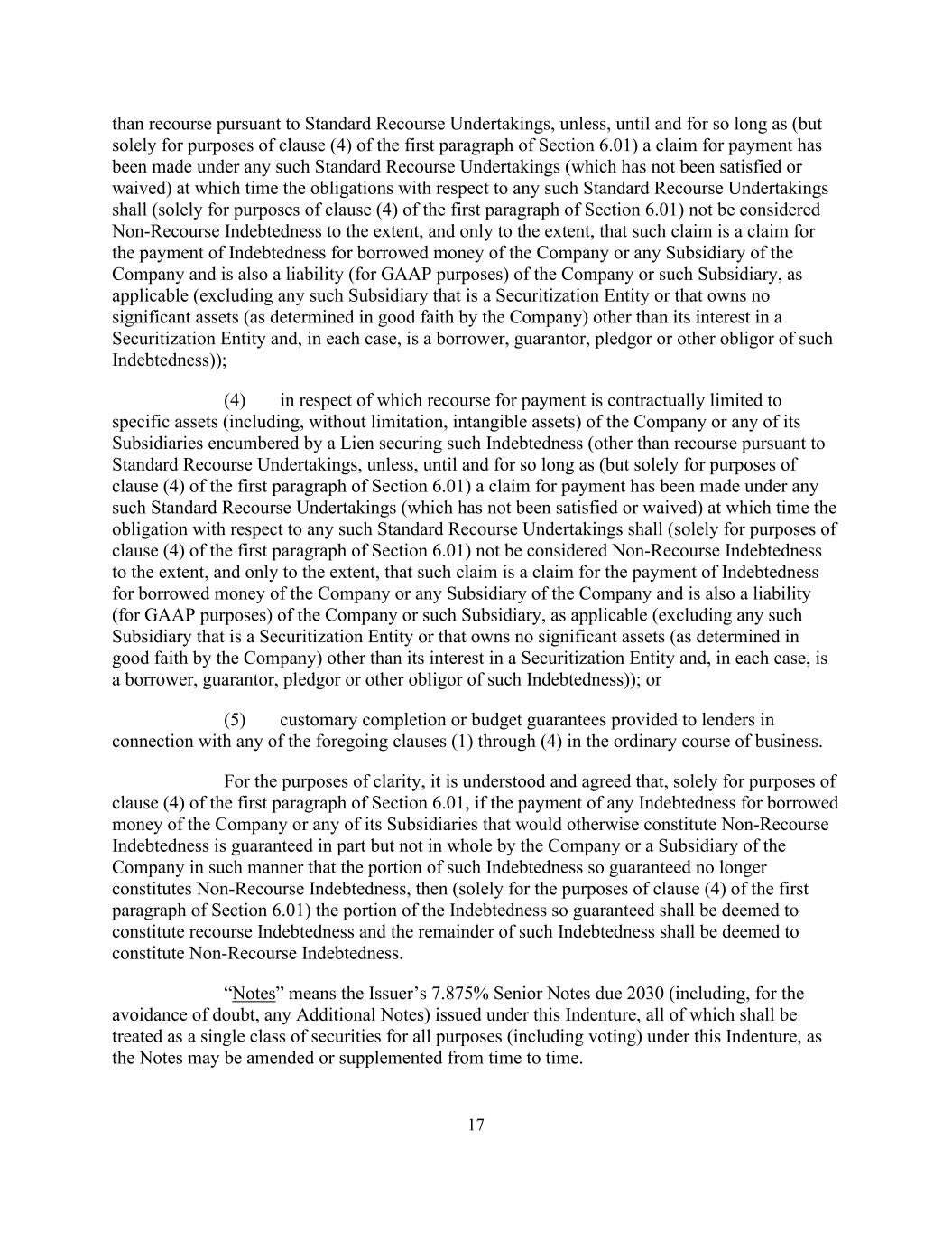 17 than recourse pursuant to Standard Recourse Undertakings, unless, until and for so long as (but solely for purposes of clause (4) of the first paragraph of Section 6.01) a claim for payment has been made under any such Standard Recourse Undertakings (which has not been satisfied or waived) at which time the obligations with respect to any such Standard Recourse Undertakings shall (solely for purposes of clause (4) of the first paragraph of Section 6.01) not be considered Non-Recourse Indebtedness to the extent, and only to the extent, that such claim is a claim for the payment of Indebtedness for borrowed money of the Company or any Subsidiary of the Company and is also a liability (for GAAP purposes) of the Company or such Subsidiary, as applicable (excluding any such Subsidiary that is a Securitization Entity or that owns no significant assets (as determined in good faith by the Company) other than its interest in a Securitization Entity and, in each case, is a borrower, guarantor, pledgor or other obligor of such Indebtedness)); (4) in respect of which recourse for payment is contractually limited to specific assets (including, without limitation, intangible assets) of the Company or any of its Subsidiaries encumbered by a Lien securing such Indebtedness (other than recourse pursuant to Standard Recourse Undertakings, unless, until and for so long as (but solely for purposes of clause (4) of the first paragraph of Section 6.01) a claim for payment has been made under any such Standard Recourse Undertakings (which has not been satisfied or waived) at which time the obligation with respect to any such Standard Recourse Undertakings shall (solely for purposes of clause (4) of the first paragraph of Section 6.01) not be considered Non-Recourse Indebtedness to the extent, and only to the extent, that such claim is a claim for the payment of Indebtedness for borrowed money of the Company or any Subsidiary of the Company and is also a liability (for GAAP purposes) of the Company or such Subsidiary, as applicable (excluding any such Subsidiary that is a Securitization Entity or that owns no significant assets (as determined in good faith by the Company) other than its interest in a Securitization Entity and, in each case, is a borrower, guarantor, pledgor or other obligor of such Indebtedness)); or (5) customary completion or budget guarantees provided to lenders in connection with any of the foregoing clauses (1) through (4) in the ordinary course of business. For the purposes of clarity, it is understood and agreed that, solely for purposes of clause (4) of the first paragraph of Section 6.01, if the payment of any Indebtedness for borrowed money of the Company or any of its Subsidiaries that would otherwise constitute Non-Recourse Indebtedness is guaranteed in part but not in whole by the Company or a Subsidiary of the Company in such manner that the portion of such Indebtedness so guaranteed no longer constitutes Non-Recourse Indebtedness, then (solely for the purposes of clause (4) of the first paragraph of Section 6.01) the portion of the Indebtedness so guaranteed shall be deemed to constitute recourse Indebtedness and the remainder of such Indebtedness shall be deemed to constitute Non-Recourse Indebtedness. “Notes” means the Issuer’s 7.875% Senior Notes due 2030 (including, for the avoidance of doubt, any Additional Notes) issued under this Indenture, all of which shall be treated as a single class of securities for all purposes (including voting) under this Indenture, as the Notes may be amended or supplemented from time to time.