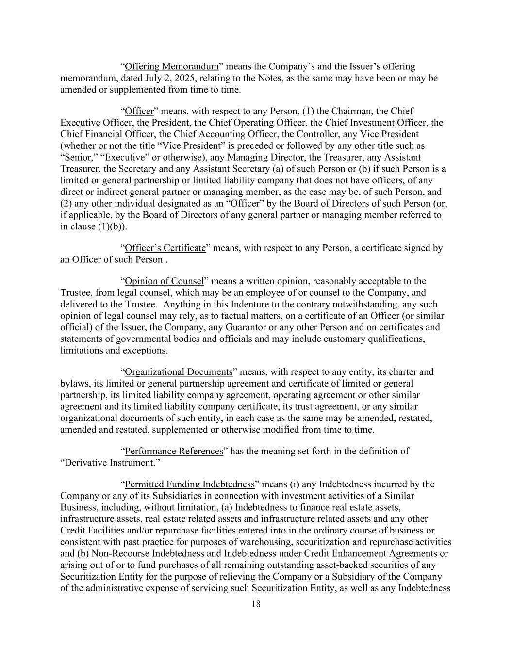 18 “Offering Memorandum” means the Company’s and the Issuer’s offering memorandum, dated July 2, 2025, relating to the Notes, as the same may have been or may be amended or supplemented from time to time. “Officer” means, with respect to any Person, (1) the Chairman, the Chief Executive Officer, the President, the Chief Operating Officer, the Chief Investment Officer, the Chief Financial Officer, the Chief Accounting Officer, the Controller, any Vice President (whether or not the title “Vice President” is preceded or followed by any other title such as “Senior,” “Executive” or otherwise), any Managing Director, the Treasurer, any Assistant Treasurer, the Secretary and any Assistant Secretary (a) of such Person or (b) if such Person is a limited or general partnership or limited liability company that does not have officers, of any direct or indirect general partner or managing member, as the case may be, of such Person, and (2) any other individual designated as an “Officer” by the Board of Directors of such Person (or, if applicable, by the Board of Directors of any general partner or managing member referred to in clause (1)(b)). “Officer’s Certificate” means, with respect to any Person, a certificate signed by an Officer of such Person . “Opinion of Counsel” means a written opinion, reasonably acceptable to the Trustee, from legal counsel, which may be an employee of or counsel to the Company, and delivered to the Trustee. Anything in this Indenture to the contrary notwithstanding, any such opinion of legal counsel may rely, as to factual matters, on a certificate of an Officer (or similar official) of the Issuer, the Company, any Guarantor or any other Person and on certificates and statements of governmental bodies and officials and may include customary qualifications, limitations and exceptions. “Organizational Documents” means, with respect to any entity, its charter and bylaws, its limited or general partnership agreement and certificate of limited or general partnership, its limited liability company agreement, operating agreement or other similar agreement and its limited liability company certificate, its trust agreement, or any similar organizational documents of such entity, in each case as the same may be amended, restated, amended and restated, supplemented or otherwise modified from time to time. “Performance References” has the meaning set forth in the definition of “Derivative Instrument.” “Permitted Funding Indebtedness” means (i) any Indebtedness incurred by the Company or any of its Subsidiaries in connection with investment activities of a Similar Business, including, without limitation, (a) Indebtedness to finance real estate assets, infrastructure assets, real estate related assets and infrastructure related assets and any other Credit Facilities and/or repurchase facilities entered into in the ordinary course of business or consistent with past practice for purposes of warehousing, securitization and repurchase activities and (b) Non-Recourse Indebtedness and Indebtedness under Credit Enhancement Agreements or arising out of or to fund purchases of all remaining outstanding asset-backed securities of any Securitization Entity for the purpose of relieving the Company or a Subsidiary of the Company of the administrative expense of servicing such Securitization Entity, as well as any Indebtedness