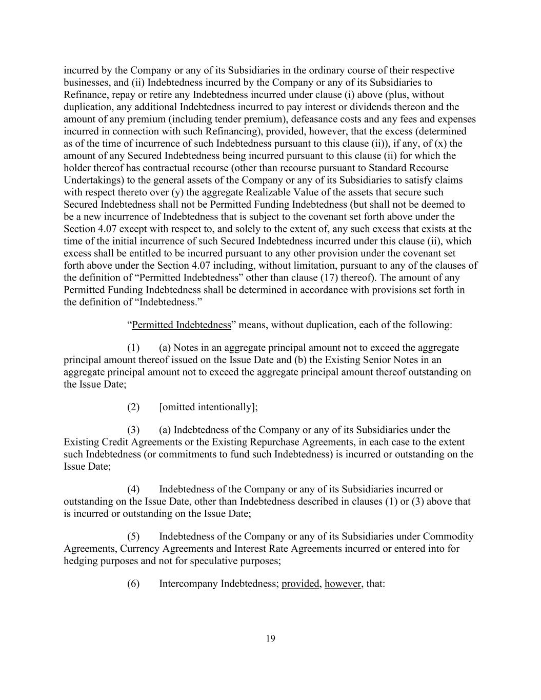 19 incurred by the Company or any of its Subsidiaries in the ordinary course of their respective businesses, and (ii) Indebtedness incurred by the Company or any of its Subsidiaries to Refinance, repay or retire any Indebtedness incurred under clause (i) above (plus, without duplication, any additional Indebtedness incurred to pay interest or dividends thereon and the amount of any premium (including tender premium), defeasance costs and any fees and expenses incurred in connection with such Refinancing), provided, however, that the excess (determined as of the time of incurrence of such Indebtedness pursuant to this clause (ii)), if any, of (x) the amount of any Secured Indebtedness being incurred pursuant to this clause (ii) for which the holder thereof has contractual recourse (other than recourse pursuant to Standard Recourse Undertakings) to the general assets of the Company or any of its Subsidiaries to satisfy claims with respect thereto over (y) the aggregate Realizable Value of the assets that secure such Secured Indebtedness shall not be Permitted Funding Indebtedness (but shall not be deemed to be a new incurrence of Indebtedness that is subject to the covenant set forth above under the Section 4.07 except with respect to, and solely to the extent of, any such excess that exists at the time of the initial incurrence of such Secured Indebtedness incurred under this clause (ii), which excess shall be entitled to be incurred pursuant to any other provision under the covenant set forth above under the Section 4.07 including, without limitation, pursuant to any of the clauses of the definition of “Permitted Indebtedness” other than clause (17) thereof). The amount of any Permitted Funding Indebtedness shall be determined in accordance with provisions set forth in the definition of “Indebtedness.” “Permitted Indebtedness” means, without duplication, each of the following: (1) (a) Notes in an aggregate principal amount not to exceed the aggregate principal amount thereof issued on the Issue Date and (b) the Existing Senior Notes in an aggregate principal amount not to exceed the aggregate principal amount thereof outstanding on the Issue Date; (2) [omitted intentionally]; (3) (a) Indebtedness of the Company or any of its Subsidiaries under the Existing Credit Agreements or the Existing Repurchase Agreements, in each case to the extent such Indebtedness (or commitments to fund such Indebtedness) is incurred or outstanding on the Issue Date; (4) Indebtedness of the Company or any of its Subsidiaries incurred or outstanding on the Issue Date, other than Indebtedness described in clauses (1) or (3) above that is incurred or outstanding on the Issue Date; (5) Indebtedness of the Company or any of its Subsidiaries under Commodity Agreements, Currency Agreements and Interest Rate Agreements incurred or entered into for hedging purposes and not for speculative purposes; (6) Intercompany Indebtedness; provided, however, that: