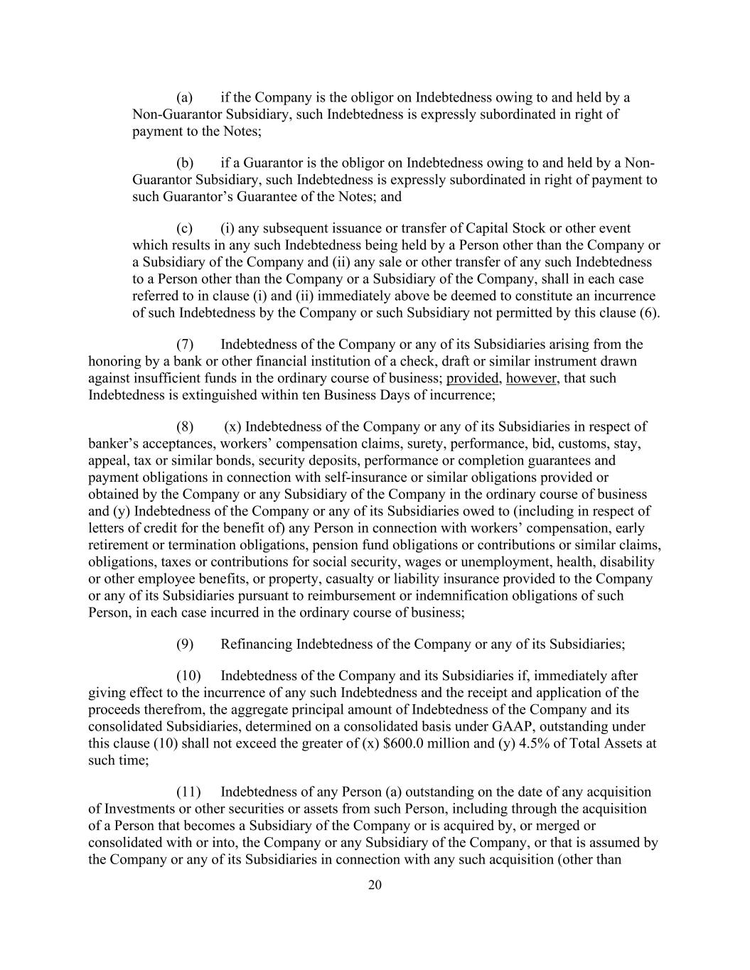 20 (a) if the Company is the obligor on Indebtedness owing to and held by a Non-Guarantor Subsidiary, such Indebtedness is expressly subordinated in right of payment to the Notes; (b) if a Guarantor is the obligor on Indebtedness owing to and held by a Non- Guarantor Subsidiary, such Indebtedness is expressly subordinated in right of payment to such Guarantor’s Guarantee of the Notes; and (c) (i) any subsequent issuance or transfer of Capital Stock or other event which results in any such Indebtedness being held by a Person other than the Company or a Subsidiary of the Company and (ii) any sale or other transfer of any such Indebtedness to a Person other than the Company or a Subsidiary of the Company, shall in each case referred to in clause (i) and (ii) immediately above be deemed to constitute an incurrence of such Indebtedness by the Company or such Subsidiary not permitted by this clause (6). (7) Indebtedness of the Company or any of its Subsidiaries arising from the honoring by a bank or other financial institution of a check, draft or similar instrument drawn against insufficient funds in the ordinary course of business; provided, however, that such Indebtedness is extinguished within ten Business Days of incurrence; (8) (x) Indebtedness of the Company or any of its Subsidiaries in respect of banker’s acceptances, workers’ compensation claims, surety, performance, bid, customs, stay, appeal, tax or similar bonds, security deposits, performance or completion guarantees and payment obligations in connection with self-insurance or similar obligations provided or obtained by the Company or any Subsidiary of the Company in the ordinary course of business and (y) Indebtedness of the Company or any of its Subsidiaries owed to (including in respect of letters of credit for the benefit of) any Person in connection with workers’ compensation, early retirement or termination obligations, pension fund obligations or contributions or similar claims, obligations, taxes or contributions for social security, wages or unemployment, health, disability or other employee benefits, or property, casualty or liability insurance provided to the Company or any of its Subsidiaries pursuant to reimbursement or indemnification obligations of such Person, in each case incurred in the ordinary course of business; (9) Refinancing Indebtedness of the Company or any of its Subsidiaries; (10) Indebtedness of the Company and its Subsidiaries if, immediately after giving effect to the incurrence of any such Indebtedness and the receipt and application of the proceeds therefrom, the aggregate principal amount of Indebtedness of the Company and its consolidated Subsidiaries, determined on a consolidated basis under GAAP, outstanding under this clause (10) shall not exceed the greater of (x) $600.0 million and (y) 4.5% of Total Assets at such time; (11) Indebtedness of any Person (a) outstanding on the date of any acquisition of Investments or other securities or assets from such Person, including through the acquisition of a Person that becomes a Subsidiary of the Company or is acquired by, or merged or consolidated with or into, the Company or any Subsidiary of the Company, or that is assumed by the Company or any of its Subsidiaries in connection with any such acquisition (other than