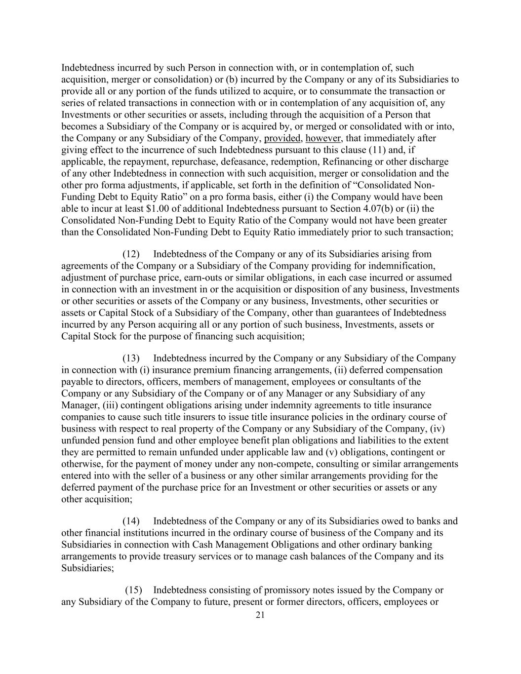 21 Indebtedness incurred by such Person in connection with, or in contemplation of, such acquisition, merger or consolidation) or (b) incurred by the Company or any of its Subsidiaries to provide all or any portion of the funds utilized to acquire, or to consummate the transaction or series of related transactions in connection with or in contemplation of any acquisition of, any Investments or other securities or assets, including through the acquisition of a Person that becomes a Subsidiary of the Company or is acquired by, or merged or consolidated with or into, the Company or any Subsidiary of the Company, provided, however, that immediately after giving effect to the incurrence of such Indebtedness pursuant to this clause (11) and, if applicable, the repayment, repurchase, defeasance, redemption, Refinancing or other discharge of any other Indebtedness in connection with such acquisition, merger or consolidation and the other pro forma adjustments, if applicable, set forth in the definition of “Consolidated Non- Funding Debt to Equity Ratio” on a pro forma basis, either (i) the Company would have been able to incur at least $1.00 of additional Indebtedness pursuant to Section 4.07(b) or (ii) the Consolidated Non-Funding Debt to Equity Ratio of the Company would not have been greater than the Consolidated Non-Funding Debt to Equity Ratio immediately prior to such transaction; (12) Indebtedness of the Company or any of its Subsidiaries arising from agreements of the Company or a Subsidiary of the Company providing for indemnification, adjustment of purchase price, earn-outs or similar obligations, in each case incurred or assumed in connection with an investment in or the acquisition or disposition of any business, Investments or other securities or assets of the Company or any business, Investments, other securities or assets or Capital Stock of a Subsidiary of the Company, other than guarantees of Indebtedness incurred by any Person acquiring all or any portion of such business, Investments, assets or Capital Stock for the purpose of financing such acquisition; (13) Indebtedness incurred by the Company or any Subsidiary of the Company in connection with (i) insurance premium financing arrangements, (ii) deferred compensation payable to directors, officers, members of management, employees or consultants of the Company or any Subsidiary of the Company or of any Manager or any Subsidiary of any Manager, (iii) contingent obligations arising under indemnity agreements to title insurance companies to cause such title insurers to issue title insurance policies in the ordinary course of business with respect to real property of the Company or any Subsidiary of the Company, (iv) unfunded pension fund and other employee benefit plan obligations and liabilities to the extent they are permitted to remain unfunded under applicable law and (v) obligations, contingent or otherwise, for the payment of money under any non-compete, consulting or similar arrangements entered into with the seller of a business or any other similar arrangements providing for the deferred payment of the purchase price for an Investment or other securities or assets or any other acquisition; (14) Indebtedness of the Company or any of its Subsidiaries owed to banks and other financial institutions incurred in the ordinary course of business of the Company and its Subsidiaries in connection with Cash Management Obligations and other ordinary banking arrangements to provide treasury services or to manage cash balances of the Company and its Subsidiaries; (15) Indebtedness consisting of promissory notes issued by the Company or any Subsidiary of the Company to future, present or former directors, officers, employees or