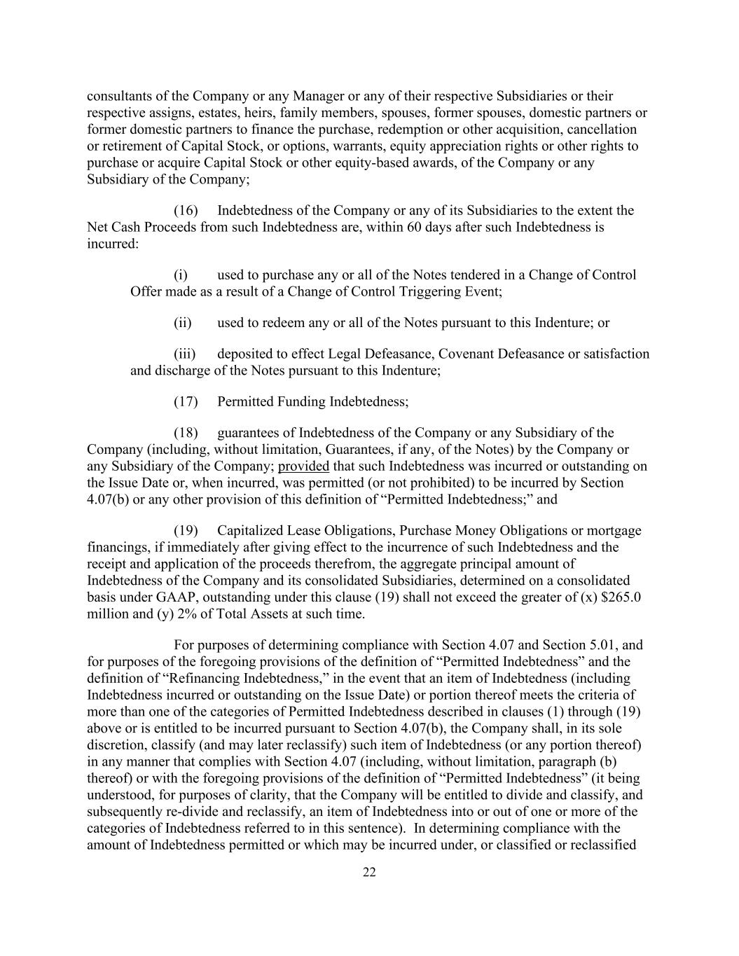 22 consultants of the Company or any Manager or any of their respective Subsidiaries or their respective assigns, estates, heirs, family members, spouses, former spouses, domestic partners or former domestic partners to finance the purchase, redemption or other acquisition, cancellation or retirement of Capital Stock, or options, warrants, equity appreciation rights or other rights to purchase or acquire Capital Stock or other equity-based awards, of the Company or any Subsidiary of the Company; (16) Indebtedness of the Company or any of its Subsidiaries to the extent the Net Cash Proceeds from such Indebtedness are, within 60 days after such Indebtedness is incurred: (i) used to purchase any or all of the Notes tendered in a Change of Control Offer made as a result of a Change of Control Triggering Event; (ii) used to redeem any or all of the Notes pursuant to this Indenture; or (iii) deposited to effect Legal Defeasance, Covenant Defeasance or satisfaction and discharge of the Notes pursuant to this Indenture; (17) Permitted Funding Indebtedness; (18) guarantees of Indebtedness of the Company or any Subsidiary of the Company (including, without limitation, Guarantees, if any, of the Notes) by the Company or any Subsidiary of the Company; provided that such Indebtedness was incurred or outstanding on the Issue Date or, when incurred, was permitted (or not prohibited) to be incurred by Section 4.07(b) or any other provision of this definition of “Permitted Indebtedness;” and (19) Capitalized Lease Obligations, Purchase Money Obligations or mortgage financings, if immediately after giving effect to the incurrence of such Indebtedness and the receipt and application of the proceeds therefrom, the aggregate principal amount of Indebtedness of the Company and its consolidated Subsidiaries, determined on a consolidated basis under GAAP, outstanding under this clause (19) shall not exceed the greater of (x) $265.0 million and (y) 2% of Total Assets at such time. For purposes of determining compliance with Section 4.07 and Section 5.01, and for purposes of the foregoing provisions of the definition of “Permitted Indebtedness” and the definition of “Refinancing Indebtedness,” in the event that an item of Indebtedness (including Indebtedness incurred or outstanding on the Issue Date) or portion thereof meets the criteria of more than one of the categories of Permitted Indebtedness described in clauses (1) through (19) above or is entitled to be incurred pursuant to Section 4.07(b), the Company shall, in its sole discretion, classify (and may later reclassify) such item of Indebtedness (or any portion thereof) in any manner that complies with Section 4.07 (including, without limitation, paragraph (b) thereof) or with the foregoing provisions of the definition of “Permitted Indebtedness” (it being understood, for purposes of clarity, that the Company will be entitled to divide and classify, and subsequently re-divide and reclassify, an item of Indebtedness into or out of one or more of the categories of Indebtedness referred to in this sentence). In determining compliance with the amount of Indebtedness permitted or which may be incurred under, or classified or reclassified