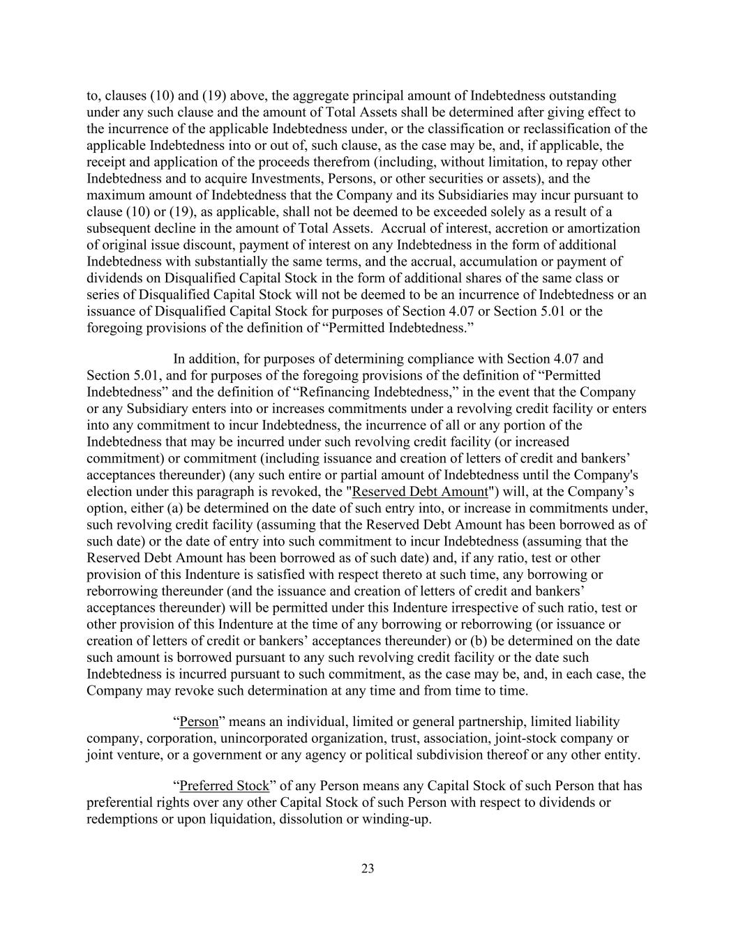 23 to, clauses (10) and (19) above, the aggregate principal amount of Indebtedness outstanding under any such clause and the amount of Total Assets shall be determined after giving effect to the incurrence of the applicable Indebtedness under, or the classification or reclassification of the applicable Indebtedness into or out of, such clause, as the case may be, and, if applicable, the receipt and application of the proceeds therefrom (including, without limitation, to repay other Indebtedness and to acquire Investments, Persons, or other securities or assets), and the maximum amount of Indebtedness that the Company and its Subsidiaries may incur pursuant to clause (10) or (19), as applicable, shall not be deemed to be exceeded solely as a result of a subsequent decline in the amount of Total Assets. Accrual of interest, accretion or amortization of original issue discount, payment of interest on any Indebtedness in the form of additional Indebtedness with substantially the same terms, and the accrual, accumulation or payment of dividends on Disqualified Capital Stock in the form of additional shares of the same class or series of Disqualified Capital Stock will not be deemed to be an incurrence of Indebtedness or an issuance of Disqualified Capital Stock for purposes of Section 4.07 or Section 5.01 or the foregoing provisions of the definition of “Permitted Indebtedness.” In addition, for purposes of determining compliance with Section 4.07 and Section 5.01, and for purposes of the foregoing provisions of the definition of “Permitted Indebtedness” and the definition of “Refinancing Indebtedness,” in the event that the Company or any Subsidiary enters into or increases commitments under a revolving credit facility or enters into any commitment to incur Indebtedness, the incurrence of all or any portion of the Indebtedness that may be incurred under such revolving credit facility (or increased commitment) or commitment (including issuance and creation of letters of credit and bankers’ acceptances thereunder) (any such entire or partial amount of Indebtedness until the Company's election under this paragraph is revoked, the "Reserved Debt Amount") will, at the Company’s option, either (a) be determined on the date of such entry into, or increase in commitments under, such revolving credit facility (assuming that the Reserved Debt Amount has been borrowed as of such date) or the date of entry into such commitment to incur Indebtedness (assuming that the Reserved Debt Amount has been borrowed as of such date) and, if any ratio, test or other provision of this Indenture is satisfied with respect thereto at such time, any borrowing or reborrowing thereunder (and the issuance and creation of letters of credit and bankers’ acceptances thereunder) will be permitted under this Indenture irrespective of such ratio, test or other provision of this Indenture at the time of any borrowing or reborrowing (or issuance or creation of letters of credit or bankers’ acceptances thereunder) or (b) be determined on the date such amount is borrowed pursuant to any such revolving credit facility or the date such Indebtedness is incurred pursuant to such commitment, as the case may be, and, in each case, the Company may revoke such determination at any time and from time to time. “Person” means an individual, limited or general partnership, limited liability company, corporation, unincorporated organization, trust, association, joint-stock company or joint venture, or a government or any agency or political subdivision thereof or any other entity. “Preferred Stock” of any Person means any Capital Stock of such Person that has preferential rights over any other Capital Stock of such Person with respect to dividends or redemptions or upon liquidation, dissolution or winding-up.