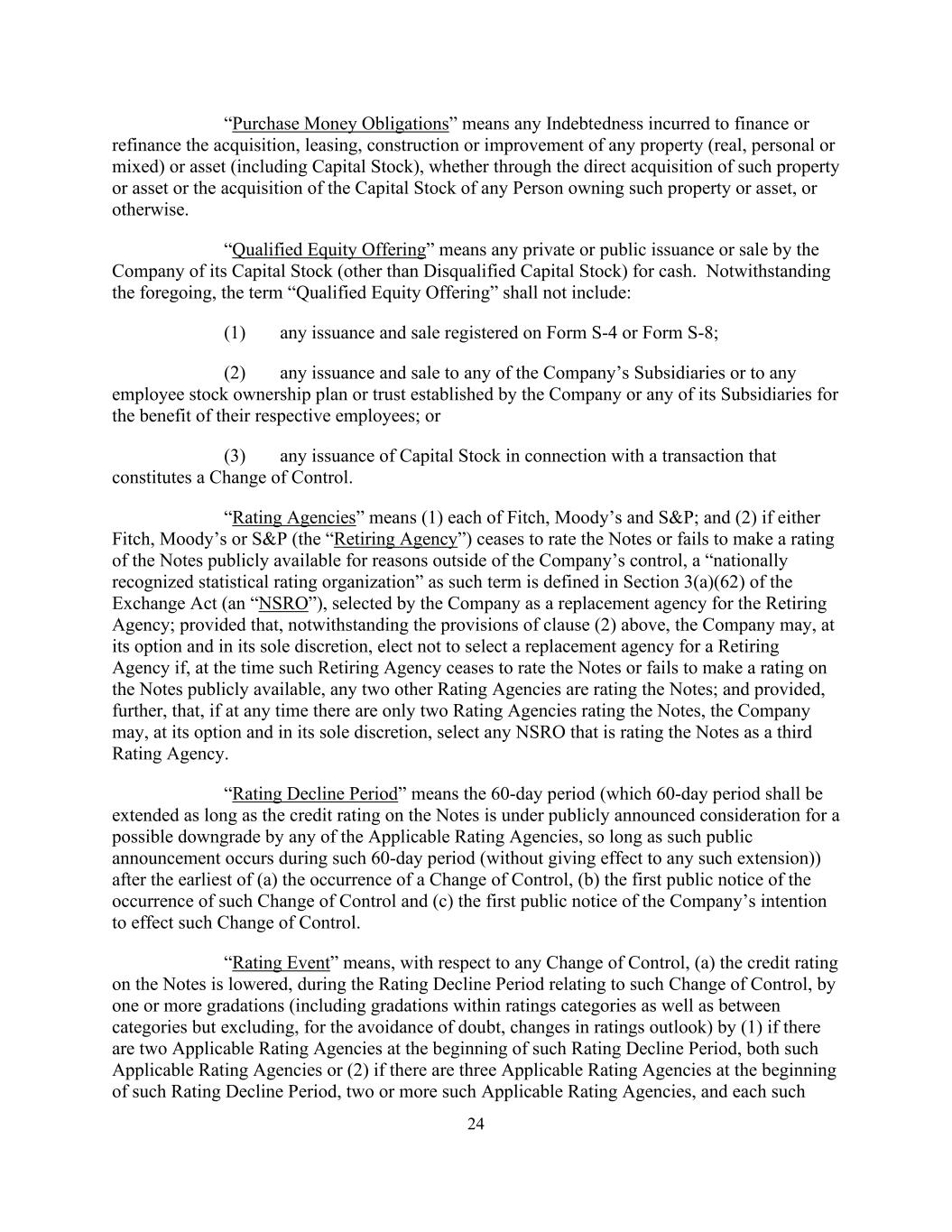 24 “Purchase Money Obligations” means any Indebtedness incurred to finance or refinance the acquisition, leasing, construction or improvement of any property (real, personal or mixed) or asset (including Capital Stock), whether through the direct acquisition of such property or asset or the acquisition of the Capital Stock of any Person owning such property or asset, or otherwise. “Qualified Equity Offering” means any private or public issuance or sale by the Company of its Capital Stock (other than Disqualified Capital Stock) for cash. Notwithstanding the foregoing, the term “Qualified Equity Offering” shall not include: (1) any issuance and sale registered on Form S-4 or Form S-8; (2) any issuance and sale to any of the Company’s Subsidiaries or to any employee stock ownership plan or trust established by the Company or any of its Subsidiaries for the benefit of their respective employees; or (3) any issuance of Capital Stock in connection with a transaction that constitutes a Change of Control. “Rating Agencies” means (1) each of Fitch, Moody’s and S&P; and (2) if either Fitch, Moody’s or S&P (the “Retiring Agency”) ceases to rate the Notes or fails to make a rating of the Notes publicly available for reasons outside of the Company’s control, a “nationally recognized statistical rating organization” as such term is defined in Section 3(a)(62) of the Exchange Act (an “NSRO”), selected by the Company as a replacement agency for the Retiring Agency; provided that, notwithstanding the provisions of clause (2) above, the Company may, at its option and in its sole discretion, elect not to select a replacement agency for a Retiring Agency if, at the time such Retiring Agency ceases to rate the Notes or fails to make a rating on the Notes publicly available, any two other Rating Agencies are rating the Notes; and provided, further, that, if at any time there are only two Rating Agencies rating the Notes, the Company may, at its option and in its sole discretion, select any NSRO that is rating the Notes as a third Rating Agency. “Rating Decline Period” means the 60-day period (which 60-day period shall be extended as long as the credit rating on the Notes is under publicly announced consideration for a possible downgrade by any of the Applicable Rating Agencies, so long as such public announcement occurs during such 60-day period (without giving effect to any such extension)) after the earliest of (a) the occurrence of a Change of Control, (b) the first public notice of the occurrence of such Change of Control and (c) the first public notice of the Company’s intention to effect such Change of Control. “Rating Event” means, with respect to any Change of Control, (a) the credit rating on the Notes is lowered, during the Rating Decline Period relating to such Change of Control, by one or more gradations (including gradations within ratings categories as well as between categories but excluding, for the avoidance of doubt, changes in ratings outlook) by (1) if there are two Applicable Rating Agencies at the beginning of such Rating Decline Period, both such Applicable Rating Agencies or (2) if there are three Applicable Rating Agencies at the beginning of such Rating Decline Period, two or more such Applicable Rating Agencies, and each such