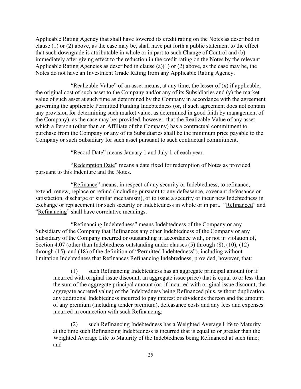 25 Applicable Rating Agency that shall have lowered its credit rating on the Notes as described in clause (1) or (2) above, as the case may be, shall have put forth a public statement to the effect that such downgrade is attributable in whole or in part to such Change of Control and (b) immediately after giving effect to the reduction in the credit rating on the Notes by the relevant Applicable Rating Agencies as described in clause (a)(1) or (2) above, as the case may be, the Notes do not have an Investment Grade Rating from any Applicable Rating Agency. “Realizable Value” of an asset means, at any time, the lesser of (x) if applicable, the original cost of such asset to the Company and/or any of its Subsidiaries and (y) the market value of such asset at such time as determined by the Company in accordance with the agreement governing the applicable Permitted Funding Indebtedness (or, if such agreement does not contain any provision for determining such market value, as determined in good faith by management of the Company), as the case may be; provided, however, that the Realizable Value of any asset which a Person (other than an Affiliate of the Company) has a contractual commitment to purchase from the Company or any of its Subsidiaries shall be the minimum price payable to the Company or such Subsidiary for such asset pursuant to such contractual commitment. “Record Date” means January 1 and July 1 of each year. “Redemption Date” means a date fixed for redemption of Notes as provided pursuant to this Indenture and the Notes. “Refinance” means, in respect of any security or Indebtedness, to refinance, extend, renew, replace or refund (including pursuant to any defeasance, covenant defeasance or satisfaction, discharge or similar mechanism), or to issue a security or incur new Indebtedness in exchange or replacement for such security or Indebtedness in whole or in part. “Refinanced” and “Refinancing” shall have correlative meanings. “Refinancing Indebtedness” means Indebtedness of the Company or any Subsidiary of the Company that Refinances any other Indebtedness of the Company or any Subsidiary of the Company incurred or outstanding in accordance with, or not in violation of, Section 4.07 (other than Indebtedness outstanding under clauses (5) through (8), (10), (12) through (15), and (18) of the definition of “Permitted Indebtedness”), including without limitation Indebtedness that Refinances Refinancing Indebtedness; provided, however, that: (1) such Refinancing Indebtedness has an aggregate principal amount (or if incurred with original issue discount, an aggregate issue price) that is equal to or less than the sum of the aggregate principal amount (or, if incurred with original issue discount, the aggregate accreted value) of the Indebtedness being Refinanced plus, without duplication, any additional Indebtedness incurred to pay interest or dividends thereon and the amount of any premium (including tender premium), defeasance costs and any fees and expenses incurred in connection with such Refinancing; (2) such Refinancing Indebtedness has a Weighted Average Life to Maturity at the time such Refinancing Indebtedness is incurred that is equal to or greater than the Weighted Average Life to Maturity of the Indebtedness being Refinanced at such time; and