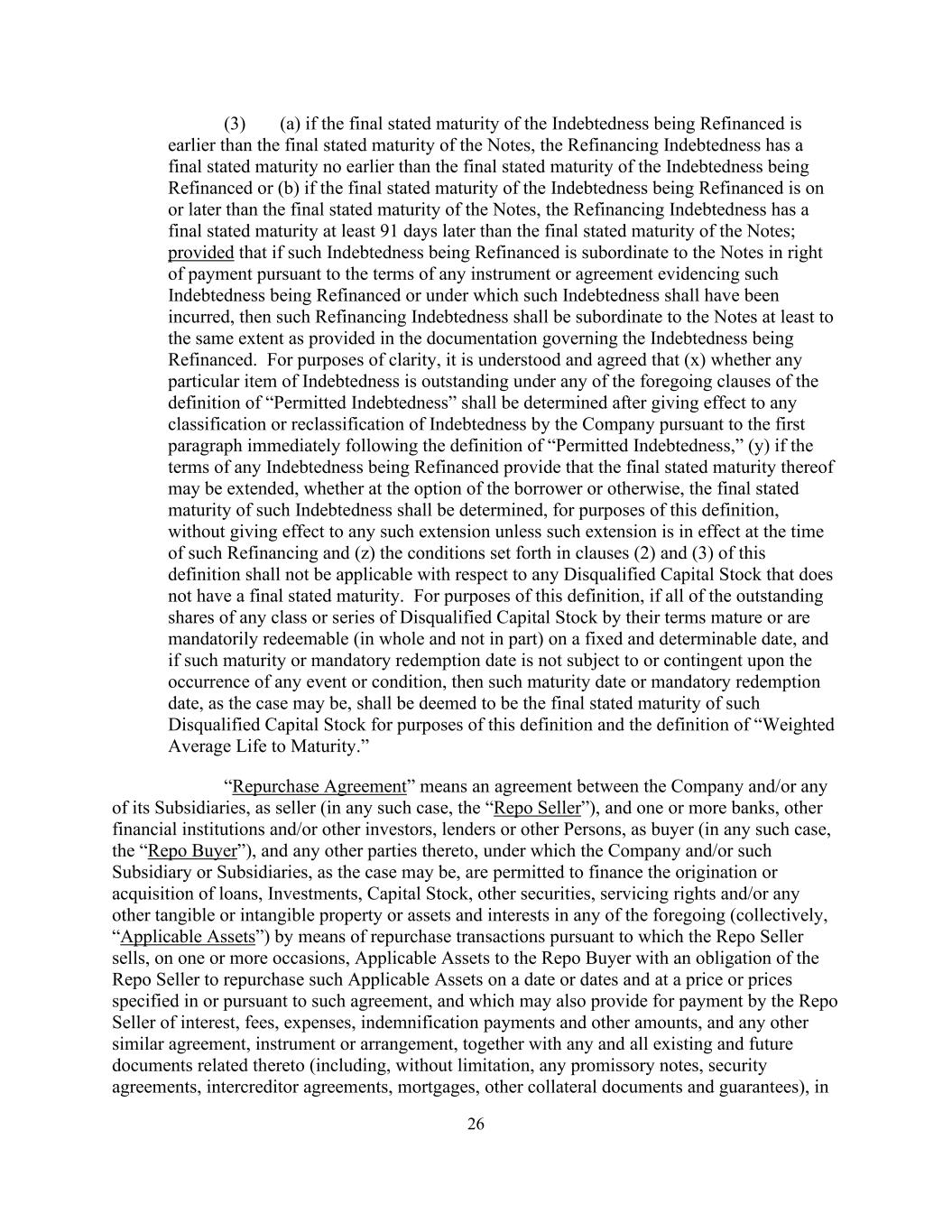 26 (3) (a) if the final stated maturity of the Indebtedness being Refinanced is earlier than the final stated maturity of the Notes, the Refinancing Indebtedness has a final stated maturity no earlier than the final stated maturity of the Indebtedness being Refinanced or (b) if the final stated maturity of the Indebtedness being Refinanced is on or later than the final stated maturity of the Notes, the Refinancing Indebtedness has a final stated maturity at least 91 days later than the final stated maturity of the Notes; provided that if such Indebtedness being Refinanced is subordinate to the Notes in right of payment pursuant to the terms of any instrument or agreement evidencing such Indebtedness being Refinanced or under which such Indebtedness shall have been incurred, then such Refinancing Indebtedness shall be subordinate to the Notes at least to the same extent as provided in the documentation governing the Indebtedness being Refinanced. For purposes of clarity, it is understood and agreed that (x) whether any particular item of Indebtedness is outstanding under any of the foregoing clauses of the definition of “Permitted Indebtedness” shall be determined after giving effect to any classification or reclassification of Indebtedness by the Company pursuant to the first paragraph immediately following the definition of “Permitted Indebtedness,” (y) if the terms of any Indebtedness being Refinanced provide that the final stated maturity thereof may be extended, whether at the option of the borrower or otherwise, the final stated maturity of such Indebtedness shall be determined, for purposes of this definition, without giving effect to any such extension unless such extension is in effect at the time of such Refinancing and (z) the conditions set forth in clauses (2) and (3) of this definition shall not be applicable with respect to any Disqualified Capital Stock that does not have a final stated maturity. For purposes of this definition, if all of the outstanding shares of any class or series of Disqualified Capital Stock by their terms mature or are mandatorily redeemable (in whole and not in part) on a fixed and determinable date, and if such maturity or mandatory redemption date is not subject to or contingent upon the occurrence of any event or condition, then such maturity date or mandatory redemption date, as the case may be, shall be deemed to be the final stated maturity of such Disqualified Capital Stock for purposes of this definition and the definition of “Weighted Average Life to Maturity.” “Repurchase Agreement” means an agreement between the Company and/or any of its Subsidiaries, as seller (in any such case, the “Repo Seller”), and one or more banks, other financial institutions and/or other investors, lenders or other Persons, as buyer (in any such case, the “Repo Buyer”), and any other parties thereto, under which the Company and/or such Subsidiary or Subsidiaries, as the case may be, are permitted to finance the origination or acquisition of loans, Investments, Capital Stock, other securities, servicing rights and/or any other tangible or intangible property or assets and interests in any of the foregoing (collectively, “Applicable Assets”) by means of repurchase transactions pursuant to which the Repo Seller sells, on one or more occasions, Applicable Assets to the Repo Buyer with an obligation of the Repo Seller to repurchase such Applicable Assets on a date or dates and at a price or prices specified in or pursuant to such agreement, and which may also provide for payment by the Repo Seller of interest, fees, expenses, indemnification payments and other amounts, and any other similar agreement, instrument or arrangement, together with any and all existing and future documents related thereto (including, without limitation, any promissory notes, security agreements, intercreditor agreements, mortgages, other collateral documents and guarantees), in