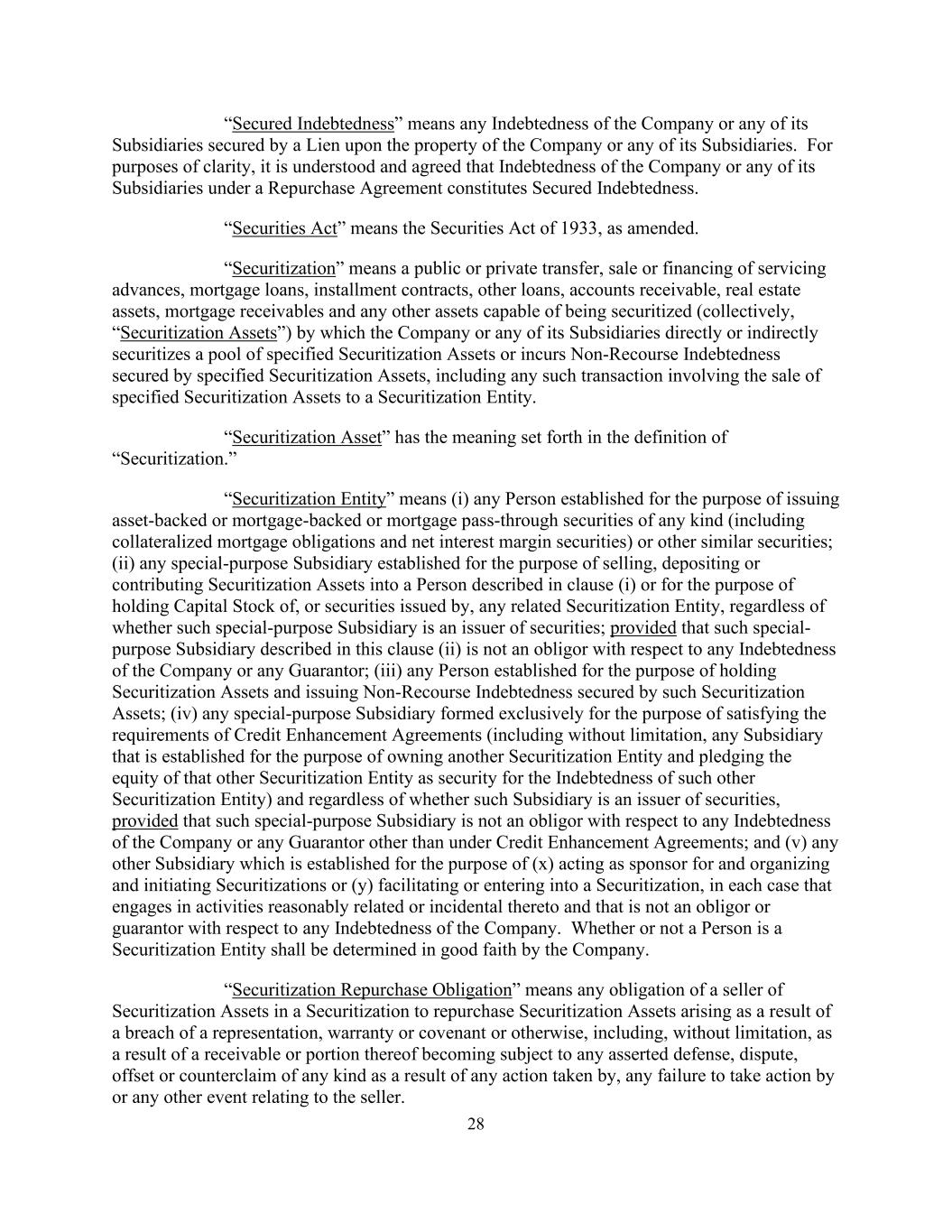 28 “Secured Indebtedness” means any Indebtedness of the Company or any of its Subsidiaries secured by a Lien upon the property of the Company or any of its Subsidiaries. For purposes of clarity, it is understood and agreed that Indebtedness of the Company or any of its Subsidiaries under a Repurchase Agreement constitutes Secured Indebtedness. “Securities Act” means the Securities Act of 1933, as amended. “Securitization” means a public or private transfer, sale or financing of servicing advances, mortgage loans, installment contracts, other loans, accounts receivable, real estate assets, mortgage receivables and any other assets capable of being securitized (collectively, “Securitization Assets”) by which the Company or any of its Subsidiaries directly or indirectly securitizes a pool of specified Securitization Assets or incurs Non-Recourse Indebtedness secured by specified Securitization Assets, including any such transaction involving the sale of specified Securitization Assets to a Securitization Entity. “Securitization Asset” has the meaning set forth in the definition of “Securitization.” “Securitization Entity” means (i) any Person established for the purpose of issuing asset-backed or mortgage-backed or mortgage pass-through securities of any kind (including collateralized mortgage obligations and net interest margin securities) or other similar securities; (ii) any special-purpose Subsidiary established for the purpose of selling, depositing or contributing Securitization Assets into a Person described in clause (i) or for the purpose of holding Capital Stock of, or securities issued by, any related Securitization Entity, regardless of whether such special-purpose Subsidiary is an issuer of securities; provided that such special- purpose Subsidiary described in this clause (ii) is not an obligor with respect to any Indebtedness of the Company or any Guarantor; (iii) any Person established for the purpose of holding Securitization Assets and issuing Non-Recourse Indebtedness secured by such Securitization Assets; (iv) any special-purpose Subsidiary formed exclusively for the purpose of satisfying the requirements of Credit Enhancement Agreements (including without limitation, any Subsidiary that is established for the purpose of owning another Securitization Entity and pledging the equity of that other Securitization Entity as security for the Indebtedness of such other Securitization Entity) and regardless of whether such Subsidiary is an issuer of securities, provided that such special-purpose Subsidiary is not an obligor with respect to any Indebtedness of the Company or any Guarantor other than under Credit Enhancement Agreements; and (v) any other Subsidiary which is established for the purpose of (x) acting as sponsor for and organizing and initiating Securitizations or (y) facilitating or entering into a Securitization, in each case that engages in activities reasonably related or incidental thereto and that is not an obligor or guarantor with respect to any Indebtedness of the Company. Whether or not a Person is a Securitization Entity shall be determined in good faith by the Company. “Securitization Repurchase Obligation” means any obligation of a seller of Securitization Assets in a Securitization to repurchase Securitization Assets arising as a result of a breach of a representation, warranty or covenant or otherwise, including, without limitation, as a result of a receivable or portion thereof becoming subject to any asserted defense, dispute, offset or counterclaim of any kind as a result of any action taken by, any failure to take action by or any other event relating to the seller.