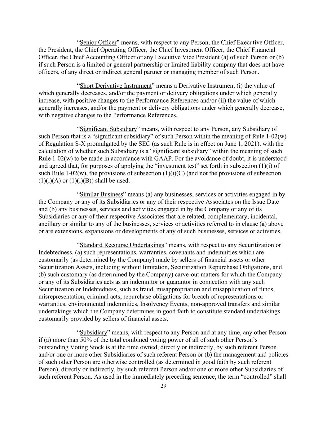 29 “Senior Officer” means, with respect to any Person, the Chief Executive Officer, the President, the Chief Operating Officer, the Chief Investment Officer, the Chief Financial Officer, the Chief Accounting Officer or any Executive Vice President (a) of such Person or (b) if such Person is a limited or general partnership or limited liability company that does not have officers, of any direct or indirect general partner or managing member of such Person. “Short Derivative Instrument” means a Derivative Instrument (i) the value of which generally decreases, and/or the payment or delivery obligations under which generally increase, with positive changes to the Performance References and/or (ii) the value of which generally increases, and/or the payment or delivery obligations under which generally decrease, with negative changes to the Performance References. “Significant Subsidiary” means, with respect to any Person, any Subsidiary of such Person that is a “significant subsidiary” of such Person within the meaning of Rule 1-02(w) of Regulation S-X promulgated by the SEC (as such Rule is in effect on June 1, 2021), with the calculation of whether such Subsidiary is a “significant subsidiary” within the meaning of such Rule 1-02(w) to be made in accordance with GAAP. For the avoidance of doubt, it is understood and agreed that, for purposes of applying the “investment test” set forth in subsection (1)(i) of such Rule 1-02(w), the provisions of subsection (1)(i)(C) (and not the provisions of subsection (1)(i)(A) or (1)(i)(B)) shall be used. “Similar Business” means (a) any businesses, services or activities engaged in by the Company or any of its Subsidiaries or any of their respective Associates on the Issue Date and (b) any businesses, services and activities engaged in by the Company or any of its Subsidiaries or any of their respective Associates that are related, complementary, incidental, ancillary or similar to any of the businesses, services or activities referred to in clause (a) above or are extensions, expansions or developments of any of such businesses, services or activities. “Standard Recourse Undertakings” means, with respect to any Securitization or Indebtedness, (a) such representations, warranties, covenants and indemnities which are customarily (as determined by the Company) made by sellers of financial assets or other Securitization Assets, including without limitation, Securitization Repurchase Obligations, and (b) such customary (as determined by the Company) carve-out matters for which the Company or any of its Subsidiaries acts as an indemnitor or guarantor in connection with any such Securitization or Indebtedness, such as fraud, misappropriation and misapplication of funds, misrepresentation, criminal acts, repurchase obligations for breach of representations or warranties, environmental indemnities, Insolvency Events, non-approved transfers and similar undertakings which the Company determines in good faith to constitute standard undertakings customarily provided by sellers of financial assets. “Subsidiary” means, with respect to any Person and at any time, any other Person if (a) more than 50% of the total combined voting power of all of such other Person’s outstanding Voting Stock is at the time owned, directly or indirectly, by such referent Person and/or one or more other Subsidiaries of such referent Person or (b) the management and policies of such other Person are otherwise controlled (as determined in good faith by such referent Person), directly or indirectly, by such referent Person and/or one or more other Subsidiaries of such referent Person. As used in the immediately preceding sentence, the term “controlled” shall