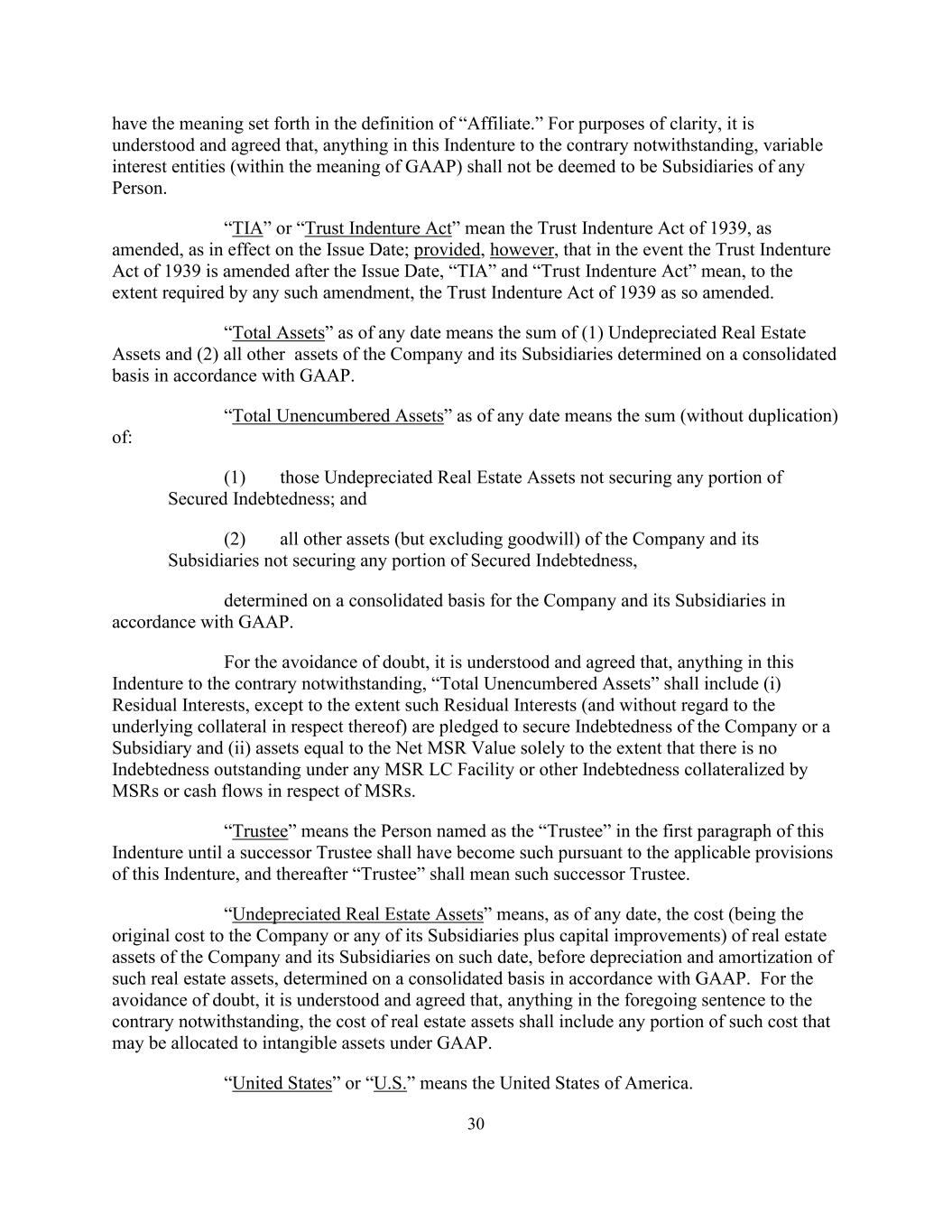 30 have the meaning set forth in the definition of “Affiliate.” For purposes of clarity, it is understood and agreed that, anything in this Indenture to the contrary notwithstanding, variable interest entities (within the meaning of GAAP) shall not be deemed to be Subsidiaries of any Person. “TIA” or “Trust Indenture Act” mean the Trust Indenture Act of 1939, as amended, as in effect on the Issue Date; provided, however, that in the event the Trust Indenture Act of 1939 is amended after the Issue Date, “TIA” and “Trust Indenture Act” mean, to the extent required by any such amendment, the Trust Indenture Act of 1939 as so amended. “Total Assets” as of any date means the sum of (1) Undepreciated Real Estate Assets and (2) all other assets of the Company and its Subsidiaries determined on a consolidated basis in accordance with GAAP. “Total Unencumbered Assets” as of any date means the sum (without duplication) of: (1) those Undepreciated Real Estate Assets not securing any portion of Secured Indebtedness; and (2) all other assets (but excluding goodwill) of the Company and its Subsidiaries not securing any portion of Secured Indebtedness, determined on a consolidated basis for the Company and its Subsidiaries in accordance with GAAP. For the avoidance of doubt, it is understood and agreed that, anything in this Indenture to the contrary notwithstanding, “Total Unencumbered Assets” shall include (i) Residual Interests, except to the extent such Residual Interests (and without regard to the underlying collateral in respect thereof) are pledged to secure Indebtedness of the Company or a Subsidiary and (ii) assets equal to the Net MSR Value solely to the extent that there is no Indebtedness outstanding under any MSR LC Facility or other Indebtedness collateralized by MSRs or cash flows in respect of MSRs. “Trustee” means the Person named as the “Trustee” in the first paragraph of this Indenture until a successor Trustee shall have become such pursuant to the applicable provisions of this Indenture, and thereafter “Trustee” shall mean such successor Trustee. “Undepreciated Real Estate Assets” means, as of any date, the cost (being the original cost to the Company or any of its Subsidiaries plus capital improvements) of real estate assets of the Company and its Subsidiaries on such date, before depreciation and amortization of such real estate assets, determined on a consolidated basis in accordance with GAAP. For the avoidance of doubt, it is understood and agreed that, anything in the foregoing sentence to the contrary notwithstanding, the cost of real estate assets shall include any portion of such cost that may be allocated to intangible assets under GAAP. “United States” or “U.S.” means the United States of America.