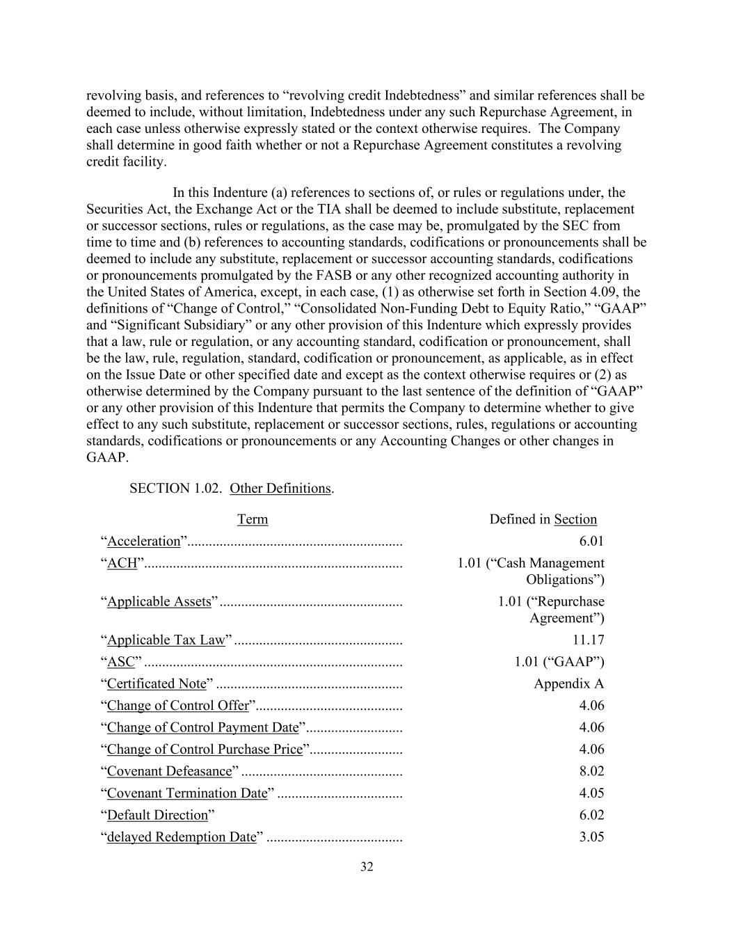 32 revolving basis, and references to “revolving credit Indebtedness” and similar references shall be deemed to include, without limitation, Indebtedness under any such Repurchase Agreement, in each case unless otherwise expressly stated or the context otherwise requires. The Company shall determine in good faith whether or not a Repurchase Agreement constitutes a revolving credit facility. In this Indenture (a) references to sections of, or rules or regulations under, the Securities Act, the Exchange Act or the TIA shall be deemed to include substitute, replacement or successor sections, rules or regulations, as the case may be, promulgated by the SEC from time to time and (b) references to accounting standards, codifications or pronouncements shall be deemed to include any substitute, replacement or successor accounting standards, codifications or pronouncements promulgated by the FASB or any other recognized accounting authority in the United States of America, except, in each case, (1) as otherwise set forth in Section 4.09, the definitions of “Change of Control,” “Consolidated Non-Funding Debt to Equity Ratio,” “GAAP” and “Significant Subsidiary” or any other provision of this Indenture which expressly provides that a law, rule or regulation, or any accounting standard, codification or pronouncement, shall be the law, rule, regulation, standard, codification or pronouncement, as applicable, as in effect on the Issue Date or other specified date and except as the context otherwise requires or (2) as otherwise determined by the Company pursuant to the last sentence of the definition of “GAAP” or any other provision of this Indenture that permits the Company to determine whether to give effect to any such substitute, replacement or successor sections, rules, regulations or accounting standards, codifications or pronouncements or any Accounting Changes or other changes in GAAP. SECTION 1.02. Other Definitions. Term Defined in Section “Acceleration”............................................................ 6.01 “ACH”........................................................................ 1.01 (“Cash Management Obligations”) “Applicable Assets” ................................................... 1.01 (“Repurchase Agreement”) “Applicable Tax Law” ............................................... 11.17 “ASC” ........................................................................ 1.01 (“GAAP”) “Certificated Note” .................................................... Appendix A “Change of Control Offer”......................................... 4.06 “Change of Control Payment Date” ........................... 4.06 “Change of Control Purchase Price”.......................... 4.06 “Covenant Defeasance” ............................................. 8.02 “Covenant Termination Date” ................................... 4.05 “Default Direction” 6.02 “delayed Redemption Date” ...................................... 3.05
