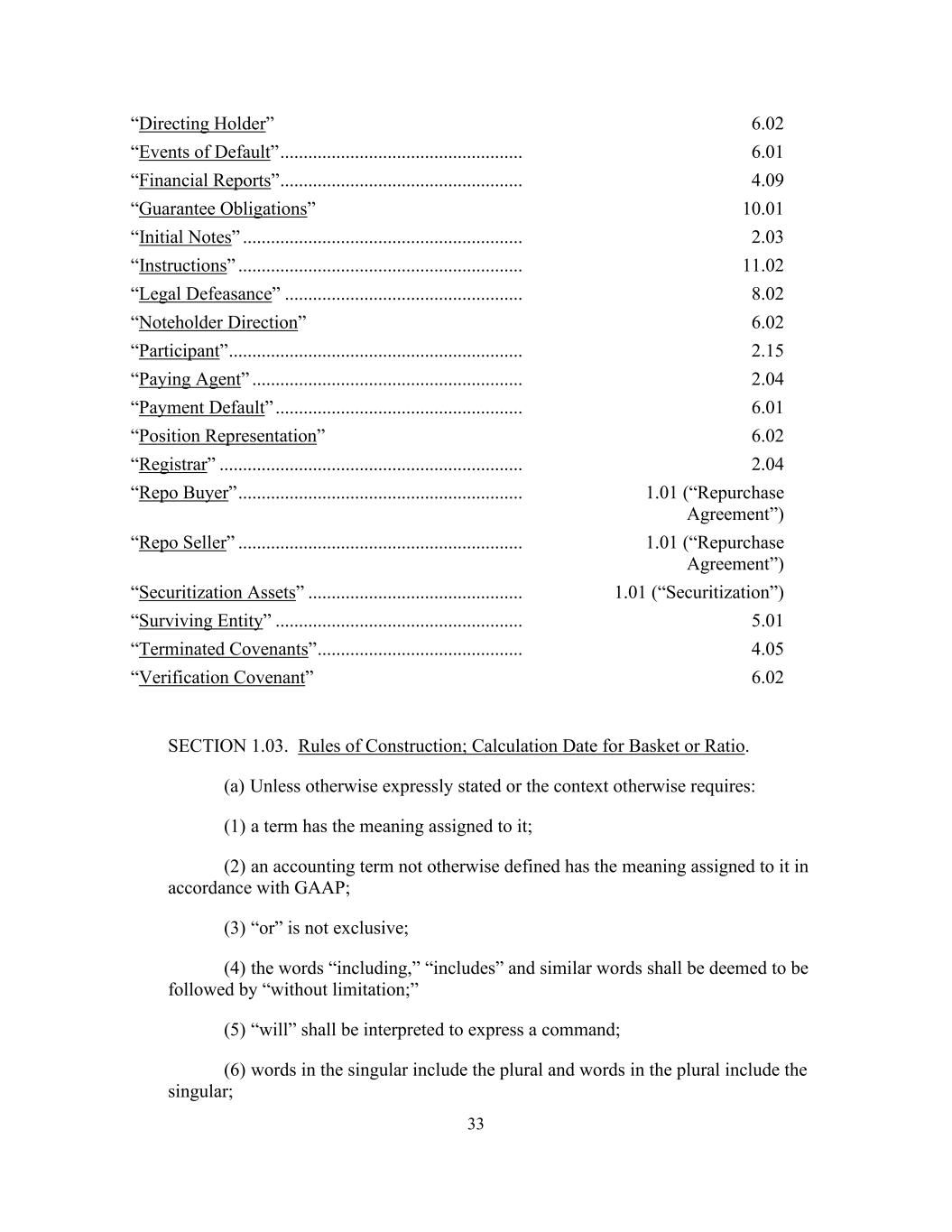 33 “Directing Holder” 6.02 “Events of Default” .................................................... 6.01 “Financial Reports” .................................................... 4.09 “Guarantee Obligations” 10.01 “Initial Notes” ............................................................ 2.03 “Instructions” ............................................................. 11.02 “Legal Defeasance” ................................................... 8.02 “Noteholder Direction” 6.02 “Participant” ............................................................... 2.15 “Paying Agent” .......................................................... 2.04 “Payment Default” ..................................................... 6.01 “Position Representation” 6.02 “Registrar” ................................................................. 2.04 “Repo Buyer” ............................................................. 1.01 (“Repurchase Agreement”) “Repo Seller” ............................................................. 1.01 (“Repurchase Agreement”) “Securitization Assets” .............................................. 1.01 (“Securitization”) “Surviving Entity” ..................................................... 5.01 “Terminated Covenants” ............................................ 4.05 “Verification Covenant” 6.02 SECTION 1.03. Rules of Construction; Calculation Date for Basket or Ratio. (a) Unless otherwise expressly stated or the context otherwise requires: (1) a term has the meaning assigned to it; (2) an accounting term not otherwise defined has the meaning assigned to it in accordance with GAAP; (3) “or” is not exclusive; (4) the words “including,” “includes” and similar words shall be deemed to be followed by “without limitation;” (5) “will” shall be interpreted to express a command; (6) words in the singular include the plural and words in the plural include the singular;