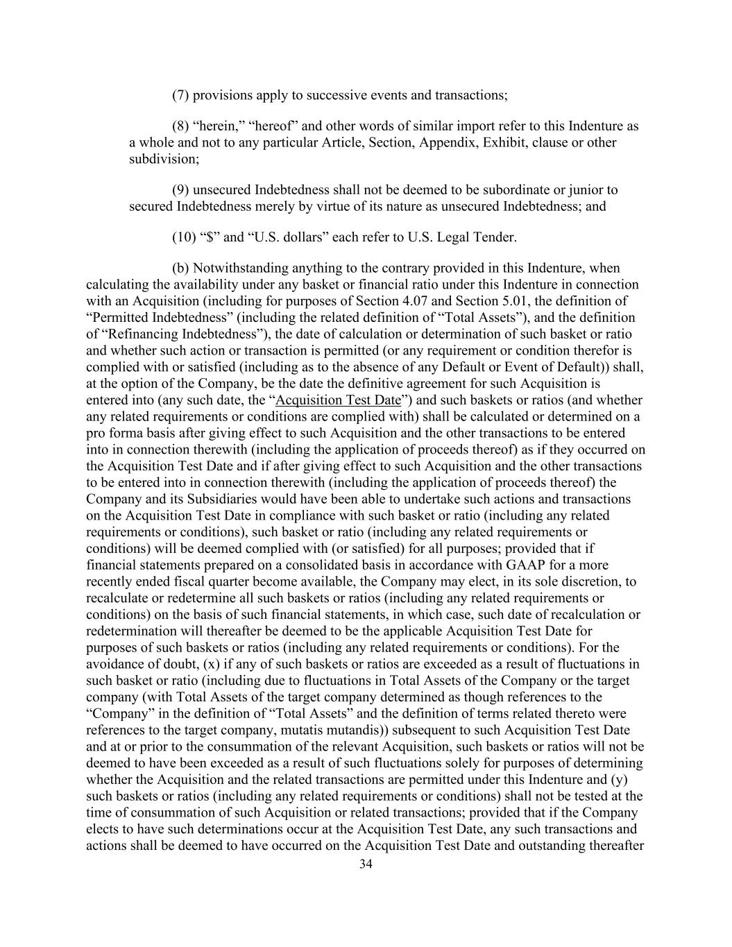 34 (7) provisions apply to successive events and transactions; (8) “herein,” “hereof” and other words of similar import refer to this Indenture as a whole and not to any particular Article, Section, Appendix, Exhibit, clause or other subdivision; (9) unsecured Indebtedness shall not be deemed to be subordinate or junior to secured Indebtedness merely by virtue of its nature as unsecured Indebtedness; and (10) “$” and “U.S. dollars” each refer to U.S. Legal Tender. (b) Notwithstanding anything to the contrary provided in this Indenture, when calculating the availability under any basket or financial ratio under this Indenture in connection with an Acquisition (including for purposes of Section 4.07 and Section 5.01, the definition of “Permitted Indebtedness” (including the related definition of “Total Assets”), and the definition of “Refinancing Indebtedness”), the date of calculation or determination of such basket or ratio and whether such action or transaction is permitted (or any requirement or condition therefor is complied with or satisfied (including as to the absence of any Default or Event of Default)) shall, at the option of the Company, be the date the definitive agreement for such Acquisition is entered into (any such date, the “Acquisition Test Date”) and such baskets or ratios (and whether any related requirements or conditions are complied with) shall be calculated or determined on a pro forma basis after giving effect to such Acquisition and the other transactions to be entered into in connection therewith (including the application of proceeds thereof) as if they occurred on the Acquisition Test Date and if after giving effect to such Acquisition and the other transactions to be entered into in connection therewith (including the application of proceeds thereof) the Company and its Subsidiaries would have been able to undertake such actions and transactions on the Acquisition Test Date in compliance with such basket or ratio (including any related requirements or conditions), such basket or ratio (including any related requirements or conditions) will be deemed complied with (or satisfied) for all purposes; provided that if financial statements prepared on a consolidated basis in accordance with GAAP for a more recently ended fiscal quarter become available, the Company may elect, in its sole discretion, to recalculate or redetermine all such baskets or ratios (including any related requirements or conditions) on the basis of such financial statements, in which case, such date of recalculation or redetermination will thereafter be deemed to be the applicable Acquisition Test Date for purposes of such baskets or ratios (including any related requirements or conditions). For the avoidance of doubt, (x) if any of such baskets or ratios are exceeded as a result of fluctuations in such basket or ratio (including due to fluctuations in Total Assets of the Company or the target company (with Total Assets of the target company determined as though references to the “Company” in the definition of “Total Assets” and the definition of terms related thereto were references to the target company, mutatis mutandis)) subsequent to such Acquisition Test Date and at or prior to the consummation of the relevant Acquisition, such baskets or ratios will not be deemed to have been exceeded as a result of such fluctuations solely for purposes of determining whether the Acquisition and the related transactions are permitted under this Indenture and (y) such baskets or ratios (including any related requirements or conditions) shall not be tested at the time of consummation of such Acquisition or related transactions; provided that if the Company elects to have such determinations occur at the Acquisition Test Date, any such transactions and actions shall be deemed to have occurred on the Acquisition Test Date and outstanding thereafter