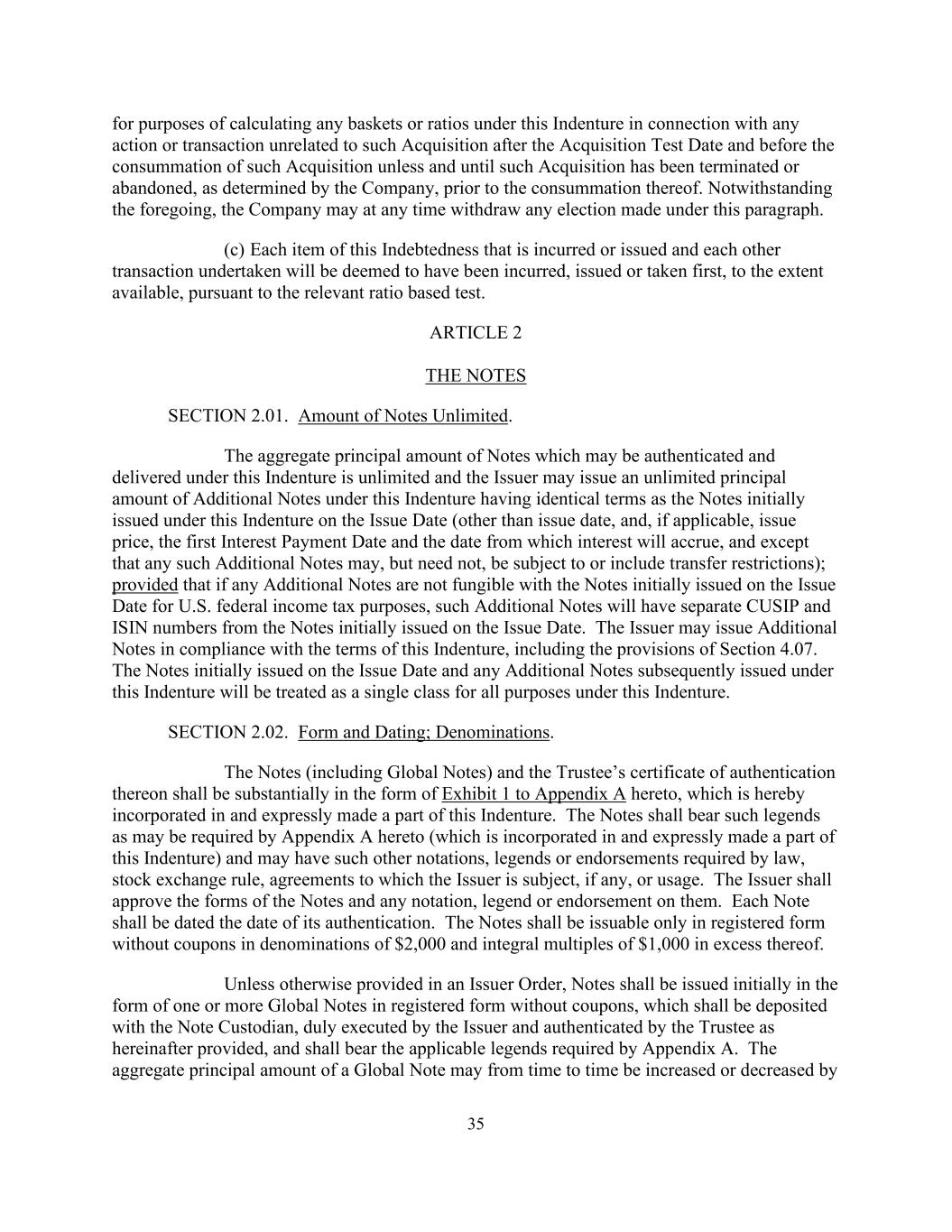35 for purposes of calculating any baskets or ratios under this Indenture in connection with any action or transaction unrelated to such Acquisition after the Acquisition Test Date and before the consummation of such Acquisition unless and until such Acquisition has been terminated or abandoned, as determined by the Company, prior to the consummation thereof. Notwithstanding the foregoing, the Company may at any time withdraw any election made under this paragraph. (c) Each item of this Indebtedness that is incurred or issued and each other transaction undertaken will be deemed to have been incurred, issued or taken first, to the extent available, pursuant to the relevant ratio based test. ARTICLE 2 THE NOTES SECTION 2.01. Amount of Notes Unlimited. The aggregate principal amount of Notes which may be authenticated and delivered under this Indenture is unlimited and the Issuer may issue an unlimited principal amount of Additional Notes under this Indenture having identical terms as the Notes initially issued under this Indenture on the Issue Date (other than issue date, and, if applicable, issue price, the first Interest Payment Date and the date from which interest will accrue, and except that any such Additional Notes may, but need not, be subject to or include transfer restrictions); provided that if any Additional Notes are not fungible with the Notes initially issued on the Issue Date for U.S. federal income tax purposes, such Additional Notes will have separate CUSIP and ISIN numbers from the Notes initially issued on the Issue Date. The Issuer may issue Additional Notes in compliance with the terms of this Indenture, including the provisions of Section 4.07. The Notes initially issued on the Issue Date and any Additional Notes subsequently issued under this Indenture will be treated as a single class for all purposes under this Indenture. SECTION 2.02. Form and Dating; Denominations. The Notes (including Global Notes) and the Trustee’s certificate of authentication thereon shall be substantially in the form of Exhibit 1 to Appendix A hereto, which is hereby incorporated in and expressly made a part of this Indenture. The Notes shall bear such legends as may be required by Appendix A hereto (which is incorporated in and expressly made a part of this Indenture) and may have such other notations, legends or endorsements required by law, stock exchange rule, agreements to which the Issuer is subject, if any, or usage. The Issuer shall approve the forms of the Notes and any notation, legend or endorsement on them. Each Note shall be dated the date of its authentication. The Notes shall be issuable only in registered form without coupons in denominations of $2,000 and integral multiples of $1,000 in excess thereof. Unless otherwise provided in an Issuer Order, Notes shall be issued initially in the form of one or more Global Notes in registered form without coupons, which shall be deposited with the Note Custodian, duly executed by the Issuer and authenticated by the Trustee as hereinafter provided, and shall bear the applicable legends required by Appendix A. The aggregate principal amount of a Global Note may from time to time be increased or decreased by