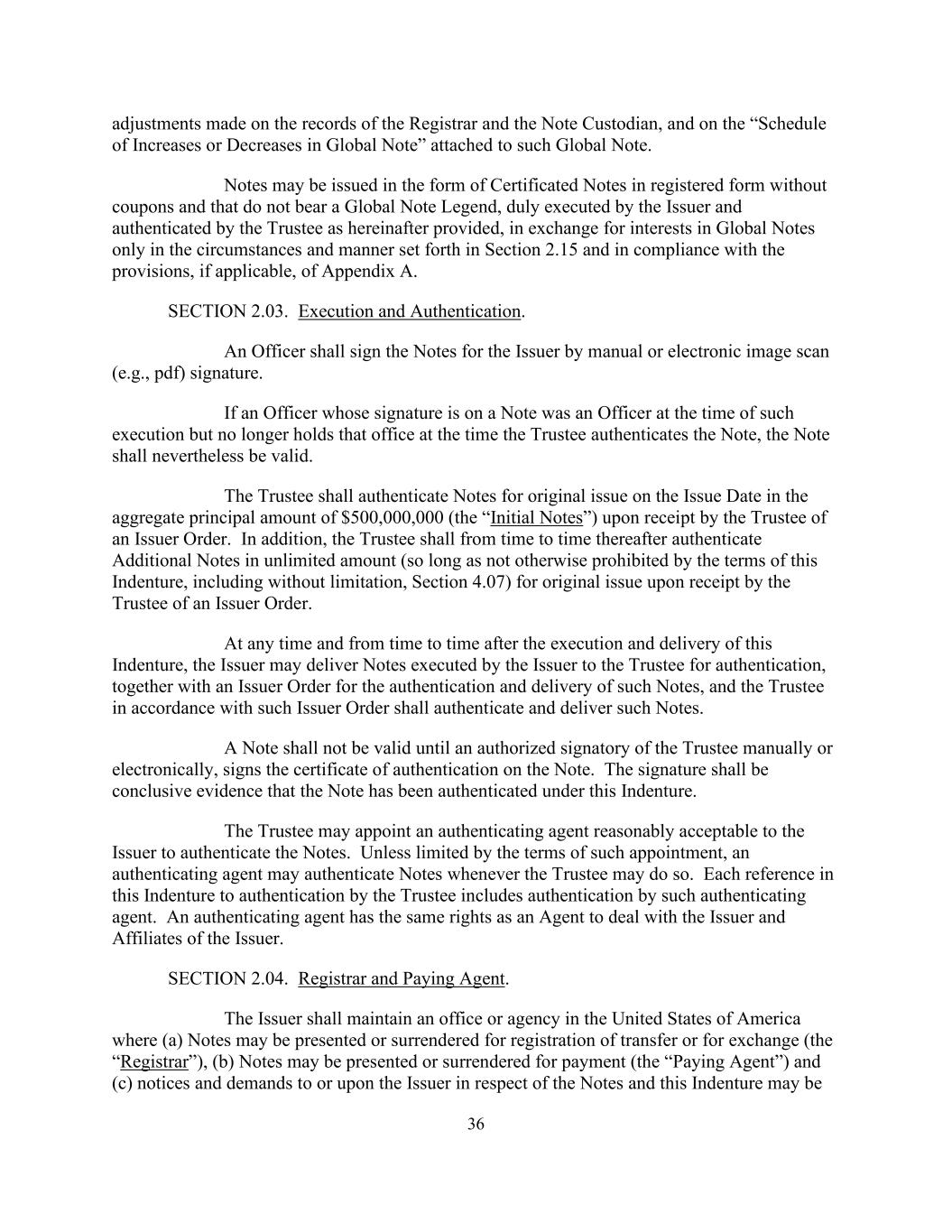 36 adjustments made on the records of the Registrar and the Note Custodian, and on the “Schedule of Increases or Decreases in Global Note” attached to such Global Note. Notes may be issued in the form of Certificated Notes in registered form without coupons and that do not bear a Global Note Legend, duly executed by the Issuer and authenticated by the Trustee as hereinafter provided, in exchange for interests in Global Notes only in the circumstances and manner set forth in Section 2.15 and in compliance with the provisions, if applicable, of Appendix A. SECTION 2.03. Execution and Authentication. An Officer shall sign the Notes for the Issuer by manual or electronic image scan (e.g., pdf) signature. If an Officer whose signature is on a Note was an Officer at the time of such execution but no longer holds that office at the time the Trustee authenticates the Note, the Note shall nevertheless be valid. The Trustee shall authenticate Notes for original issue on the Issue Date in the aggregate principal amount of $500,000,000 (the “Initial Notes”) upon receipt by the Trustee of an Issuer Order. In addition, the Trustee shall from time to time thereafter authenticate Additional Notes in unlimited amount (so long as not otherwise prohibited by the terms of this Indenture, including without limitation, Section 4.07) for original issue upon receipt by the Trustee of an Issuer Order. At any time and from time to time after the execution and delivery of this Indenture, the Issuer may deliver Notes executed by the Issuer to the Trustee for authentication, together with an Issuer Order for the authentication and delivery of such Notes, and the Trustee in accordance with such Issuer Order shall authenticate and deliver such Notes. A Note shall not be valid until an authorized signatory of the Trustee manually or electronically, signs the certificate of authentication on the Note. The signature shall be conclusive evidence that the Note has been authenticated under this Indenture. The Trustee may appoint an authenticating agent reasonably acceptable to the Issuer to authenticate the Notes. Unless limited by the terms of such appointment, an authenticating agent may authenticate Notes whenever the Trustee may do so. Each reference in this Indenture to authentication by the Trustee includes authentication by such authenticating agent. An authenticating agent has the same rights as an Agent to deal with the Issuer and Affiliates of the Issuer. SECTION 2.04. Registrar and Paying Agent. The Issuer shall maintain an office or agency in the United States of America where (a) Notes may be presented or surrendered for registration of transfer or for exchange (the “Registrar”), (b) Notes may be presented or surrendered for payment (the “Paying Agent”) and (c) notices and demands to or upon the Issuer in respect of the Notes and this Indenture may be