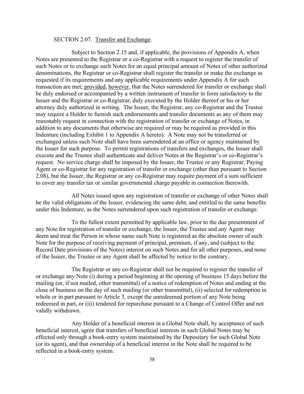 38 SECTION 2.07. Transfer and Exchange. Subject to Section 2.15 and, if applicable, the provisions of Appendix A, when Notes are presented to the Registrar or a co-Registrar with a request to register the transfer of such Notes or to exchange such Notes for an equal principal amount of Notes of other authorized denominations, the Registrar or co-Registrar shall register the transfer or make the exchange as requested if its requirements and any applicable requirements under Appendix A for such transaction are met; provided, however, that the Notes surrendered for transfer or exchange shall be duly endorsed or accompanied by a written instrument of transfer in form satisfactory to the Issuer and the Registrar or co-Registrar, duly executed by the Holder thereof or his or her attorney duly authorized in writing. The Issuer, the Registrar, any co-Registrar and the Trustee may require a Holder to furnish such endorsements and transfer documents as any of them may reasonably request in connection with the registration of transfer or exchange of Notes, in addition to any documents that otherwise are required or may be required as provided in this Indenture (including Exhibit 1 to Appendix A hereto). A Note may not be transferred or exchanged unless such Note shall have been surrendered at an office or agency maintained by the Issuer for such purpose. To permit registrations of transfers and exchanges, the Issuer shall execute and the Trustee shall authenticate and deliver Notes at the Registrar’s or co-Registrar’s request. No service charge shall be imposed by the Issuer, the Trustee or any Registrar, Paying Agent or co-Registrar for any registration of transfer or exchange (other than pursuant to Section 2.08), but the Issuer, the Registrar or any co-Registrar may require payment of a sum sufficient to cover any transfer tax or similar governmental charge payable in connection therewith. All Notes issued upon any registration of transfer or exchange of other Notes shall be the valid obligations of the Issuer, evidencing the same debt, and entitled to the same benefits under this Indenture, as the Notes surrendered upon such registration of transfer or exchange. To the fullest extent permitted by applicable law, prior to the due presentment of any Note for registration of transfer or exchange, the Issuer, the Trustee and any Agent may deem and treat the Person in whose name such Note is registered as the absolute owner of such Note for the purpose of receiving payment of principal, premium, if any, and (subject to the Record Date provisions of the Notes) interest on such Notes and for all other purposes, and none of the Issuer, the Trustee or any Agent shall be affected by notice to the contrary. The Registrar or any co-Registrar shall not be required to register the transfer of or exchange any Note (i) during a period beginning at the opening of business 15 days before the mailing (or, if not mailed, other transmittal) of a notice of redemption of Notes and ending at the close of business on the day of such mailing (or other transmittal), (ii) selected for redemption in whole or in part pursuant to Article 3, except the unredeemed portion of any Note being redeemed in part, or (iii) tendered for repurchase pursuant to a Change of Control Offer and not validly withdrawn. Any Holder of a beneficial interest in a Global Note shall, by acceptance of such beneficial interest, agree that transfers of beneficial interests in such Global Notes may be effected only through a book-entry system maintained by the Depositary for such Global Note (or its agent), and that ownership of a beneficial interest in the Note shall be required to be reflected in a book-entry system.