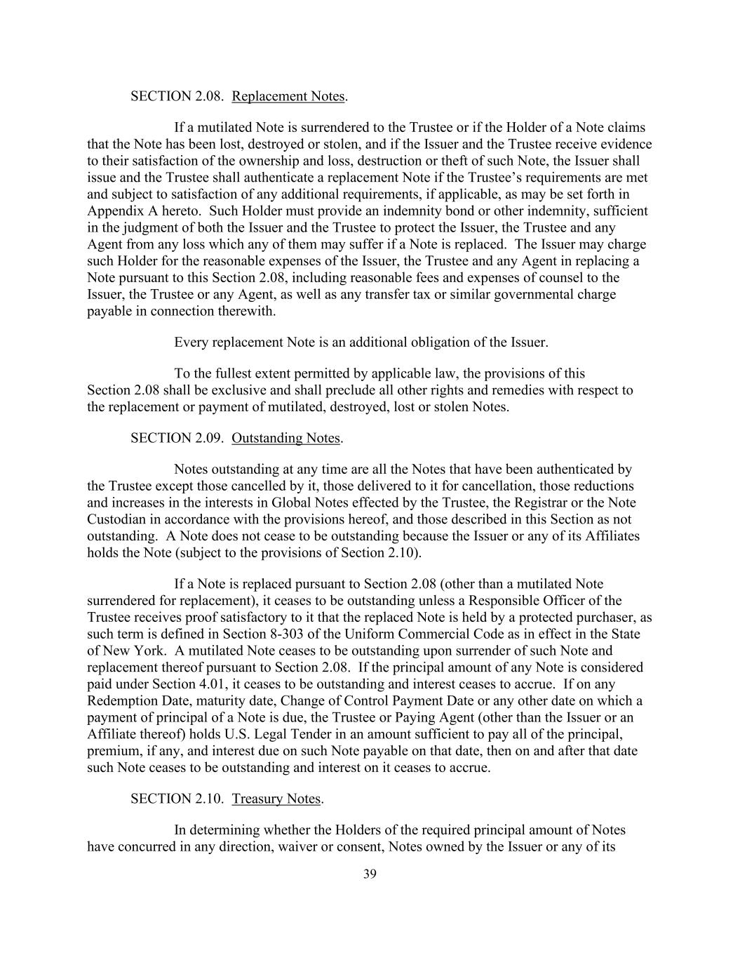39 SECTION 2.08. Replacement Notes. If a mutilated Note is surrendered to the Trustee or if the Holder of a Note claims that the Note has been lost, destroyed or stolen, and if the Issuer and the Trustee receive evidence to their satisfaction of the ownership and loss, destruction or theft of such Note, the Issuer shall issue and the Trustee shall authenticate a replacement Note if the Trustee’s requirements are met and subject to satisfaction of any additional requirements, if applicable, as may be set forth in Appendix A hereto. Such Holder must provide an indemnity bond or other indemnity, sufficient in the judgment of both the Issuer and the Trustee to protect the Issuer, the Trustee and any Agent from any loss which any of them may suffer if a Note is replaced. The Issuer may charge such Holder for the reasonable expenses of the Issuer, the Trustee and any Agent in replacing a Note pursuant to this Section 2.08, including reasonable fees and expenses of counsel to the Issuer, the Trustee or any Agent, as well as any transfer tax or similar governmental charge payable in connection therewith. Every replacement Note is an additional obligation of the Issuer. To the fullest extent permitted by applicable law, the provisions of this Section 2.08 shall be exclusive and shall preclude all other rights and remedies with respect to the replacement or payment of mutilated, destroyed, lost or stolen Notes. SECTION 2.09. Outstanding Notes. Notes outstanding at any time are all the Notes that have been authenticated by the Trustee except those cancelled by it, those delivered to it for cancellation, those reductions and increases in the interests in Global Notes effected by the Trustee, the Registrar or the Note Custodian in accordance with the provisions hereof, and those described in this Section as not outstanding. A Note does not cease to be outstanding because the Issuer or any of its Affiliates holds the Note (subject to the provisions of Section 2.10). If a Note is replaced pursuant to Section 2.08 (other than a mutilated Note surrendered for replacement), it ceases to be outstanding unless a Responsible Officer of the Trustee receives proof satisfactory to it that the replaced Note is held by a protected purchaser, as such term is defined in Section 8-303 of the Uniform Commercial Code as in effect in the State of New York. A mutilated Note ceases to be outstanding upon surrender of such Note and replacement thereof pursuant to Section 2.08. If the principal amount of any Note is considered paid under Section 4.01, it ceases to be outstanding and interest ceases to accrue. If on any Redemption Date, maturity date, Change of Control Payment Date or any other date on which a payment of principal of a Note is due, the Trustee or Paying Agent (other than the Issuer or an Affiliate thereof) holds U.S. Legal Tender in an amount sufficient to pay all of the principal, premium, if any, and interest due on such Note payable on that date, then on and after that date such Note ceases to be outstanding and interest on it ceases to accrue. SECTION 2.10. Treasury Notes. In determining whether the Holders of the required principal amount of Notes have concurred in any direction, waiver or consent, Notes owned by the Issuer or any of its