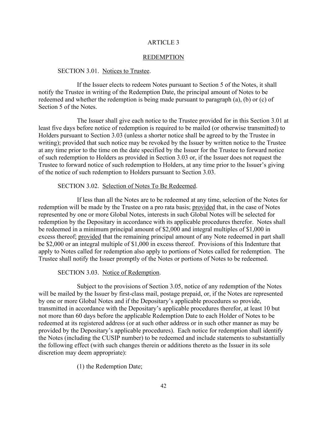 42 ARTICLE 3 REDEMPTION SECTION 3.01. Notices to Trustee. If the Issuer elects to redeem Notes pursuant to Section 5 of the Notes, it shall notify the Trustee in writing of the Redemption Date, the principal amount of Notes to be redeemed and whether the redemption is being made pursuant to paragraph (a), (b) or (c) of Section 5 of the Notes. The Issuer shall give each notice to the Trustee provided for in this Section 3.01 at least five days before notice of redemption is required to be mailed (or otherwise transmitted) to Holders pursuant to Section 3.03 (unless a shorter notice shall be agreed to by the Trustee in writing); provided that such notice may be revoked by the Issuer by written notice to the Trustee at any time prior to the time on the date specified by the Issuer for the Trustee to forward notice of such redemption to Holders as provided in Section 3.03 or, if the Issuer does not request the Trustee to forward notice of such redemption to Holders, at any time prior to the Issuer’s giving of the notice of such redemption to Holders pursuant to Section 3.03. SECTION 3.02. Selection of Notes To Be Redeemed. If less than all the Notes are to be redeemed at any time, selection of the Notes for redemption will be made by the Trustee on a pro rata basis; provided that, in the case of Notes represented by one or more Global Notes, interests in such Global Notes will be selected for redemption by the Depositary in accordance with its applicable procedures therefor. Notes shall be redeemed in a minimum principal amount of $2,000 and integral multiples of $1,000 in excess thereof; provided that the remaining principal amount of any Note redeemed in part shall be $2,000 or an integral multiple of $1,000 in excess thereof. Provisions of this Indenture that apply to Notes called for redemption also apply to portions of Notes called for redemption. The Trustee shall notify the Issuer promptly of the Notes or portions of Notes to be redeemed. SECTION 3.03. Notice of Redemption. Subject to the provisions of Section 3.05, notice of any redemption of the Notes will be mailed by the Issuer by first-class mail, postage prepaid, or, if the Notes are represented by one or more Global Notes and if the Depositary’s applicable procedures so provide, transmitted in accordance with the Depositary’s applicable procedures therefor, at least 10 but not more than 60 days before the applicable Redemption Date to each Holder of Notes to be redeemed at its registered address (or at such other address or in such other manner as may be provided by the Depositary’s applicable procedures). Each notice for redemption shall identify the Notes (including the CUSIP number) to be redeemed and include statements to substantially the following effect (with such changes therein or additions thereto as the Issuer in its sole discretion may deem appropriate): (1) the Redemption Date;