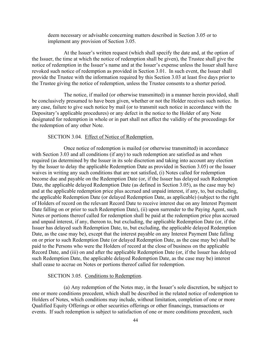 44 deem necessary or advisable concerning matters described in Section 3.05 or to implement any provision of Section 3.05. At the Issuer’s written request (which shall specify the date and, at the option of the Issuer, the time at which the notice of redemption shall be given), the Trustee shall give the notice of redemption in the Issuer’s name and at the Issuer’s expense unless the Issuer shall have revoked such notice of redemption as provided in Section 3.01. In such event, the Issuer shall provide the Trustee with the information required by this Section 3.03 at least five days prior to the Trustee giving the notice of redemption, unless the Trustee consents to a shorter period. The notice, if mailed (or otherwise transmitted) in a manner herein provided, shall be conclusively presumed to have been given, whether or not the Holder receives such notice. In any case, failure to give such notice by mail (or to transmit such notice in accordance with the Depositary’s applicable procedures) or any defect in the notice to the Holder of any Note designated for redemption in whole or in part shall not affect the validity of the proceedings for the redemption of any other Note. SECTION 3.04. Effect of Notice of Redemption. Once notice of redemption is mailed (or otherwise transmitted) in accordance with Section 3.03 and all conditions (if any) to such redemption are satisfied as and when required (as determined by the Issuer in its sole discretion and taking into account any election by the Issuer to delay the applicable Redemption Date as provided in Section 3.05) or the Issuer waives in writing any such conditions that are not satisfied, (i) Notes called for redemption become due and payable on the Redemption Date (or, if the Issuer has delayed such Redemption Date, the applicable delayed Redemption Date (as defined in Section 3.05), as the case may be) and at the applicable redemption price plus accrued and unpaid interest, if any, to, but excluding, the applicable Redemption Date (or delayed Redemption Date, as applicable) (subject to the right of Holders of record on the relevant Record Date to receive interest due on any Interest Payment Date falling on or prior to such Redemption Date), (ii) upon surrender to the Paying Agent, such Notes or portions thereof called for redemption shall be paid at the redemption price plus accrued and unpaid interest, if any, thereon to, but excluding, the applicable Redemption Date (or, if the Issuer has delayed such Redemption Date, to, but excluding, the applicable delayed Redemption Date, as the case may be), except that the interest payable on any Interest Payment Date falling on or prior to such Redemption Date (or delayed Redemption Date, as the case may be) shall be paid to the Persons who were the Holders of record at the close of business on the applicable Record Date, and (iii) on and after the applicable Redemption Date (or, if the Issuer has delayed such Redemption Date, the applicable delayed Redemption Date, as the case may be) interest shall cease to accrue on Notes or portions thereof called for redemption. SECTION 3.05. Conditions to Redemption. (a) Any redemption of the Notes may, in the Issuer’s sole discretion, be subject to one or more conditions precedent, which shall be described in the related notice of redemption to Holders of Notes, which conditions may include, without limitation, completion of one or more Qualified Equity Offerings or other securities offerings or other financings, transactions or events. If such redemption is subject to satisfaction of one or more conditions precedent, such
