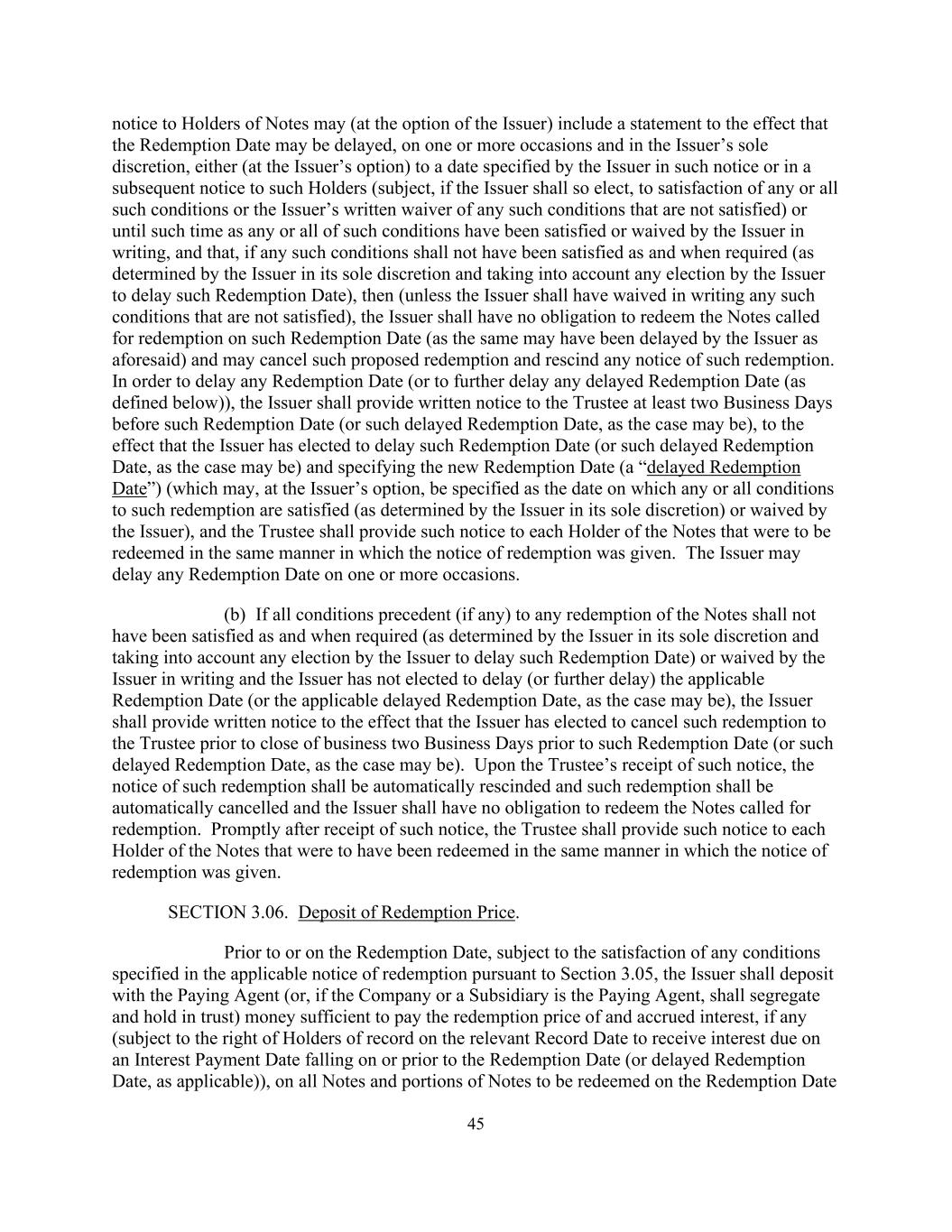 45 notice to Holders of Notes may (at the option of the Issuer) include a statement to the effect that the Redemption Date may be delayed, on one or more occasions and in the Issuer’s sole discretion, either (at the Issuer’s option) to a date specified by the Issuer in such notice or in a subsequent notice to such Holders (subject, if the Issuer shall so elect, to satisfaction of any or all such conditions or the Issuer’s written waiver of any such conditions that are not satisfied) or until such time as any or all of such conditions have been satisfied or waived by the Issuer in writing, and that, if any such conditions shall not have been satisfied as and when required (as determined by the Issuer in its sole discretion and taking into account any election by the Issuer to delay such Redemption Date), then (unless the Issuer shall have waived in writing any such conditions that are not satisfied), the Issuer shall have no obligation to redeem the Notes called for redemption on such Redemption Date (as the same may have been delayed by the Issuer as aforesaid) and may cancel such proposed redemption and rescind any notice of such redemption. In order to delay any Redemption Date (or to further delay any delayed Redemption Date (as defined below)), the Issuer shall provide written notice to the Trustee at least two Business Days before such Redemption Date (or such delayed Redemption Date, as the case may be), to the effect that the Issuer has elected to delay such Redemption Date (or such delayed Redemption Date, as the case may be) and specifying the new Redemption Date (a “delayed Redemption Date”) (which may, at the Issuer’s option, be specified as the date on which any or all conditions to such redemption are satisfied (as determined by the Issuer in its sole discretion) or waived by the Issuer), and the Trustee shall provide such notice to each Holder of the Notes that were to be redeemed in the same manner in which the notice of redemption was given. The Issuer may delay any Redemption Date on one or more occasions. (b) If all conditions precedent (if any) to any redemption of the Notes shall not have been satisfied as and when required (as determined by the Issuer in its sole discretion and taking into account any election by the Issuer to delay such Redemption Date) or waived by the Issuer in writing and the Issuer has not elected to delay (or further delay) the applicable Redemption Date (or the applicable delayed Redemption Date, as the case may be), the Issuer shall provide written notice to the effect that the Issuer has elected to cancel such redemption to the Trustee prior to close of business two Business Days prior to such Redemption Date (or such delayed Redemption Date, as the case may be). Upon the Trustee’s receipt of such notice, the notice of such redemption shall be automatically rescinded and such redemption shall be automatically cancelled and the Issuer shall have no obligation to redeem the Notes called for redemption. Promptly after receipt of such notice, the Trustee shall provide such notice to each Holder of the Notes that were to have been redeemed in the same manner in which the notice of redemption was given. SECTION 3.06. Deposit of Redemption Price. Prior to or on the Redemption Date, subject to the satisfaction of any conditions specified in the applicable notice of redemption pursuant to Section 3.05, the Issuer shall deposit with the Paying Agent (or, if the Company or a Subsidiary is the Paying Agent, shall segregate and hold in trust) money sufficient to pay the redemption price of and accrued interest, if any (subject to the right of Holders of record on the relevant Record Date to receive interest due on an Interest Payment Date falling on or prior to the Redemption Date (or delayed Redemption Date, as applicable)), on all Notes and portions of Notes to be redeemed on the Redemption Date