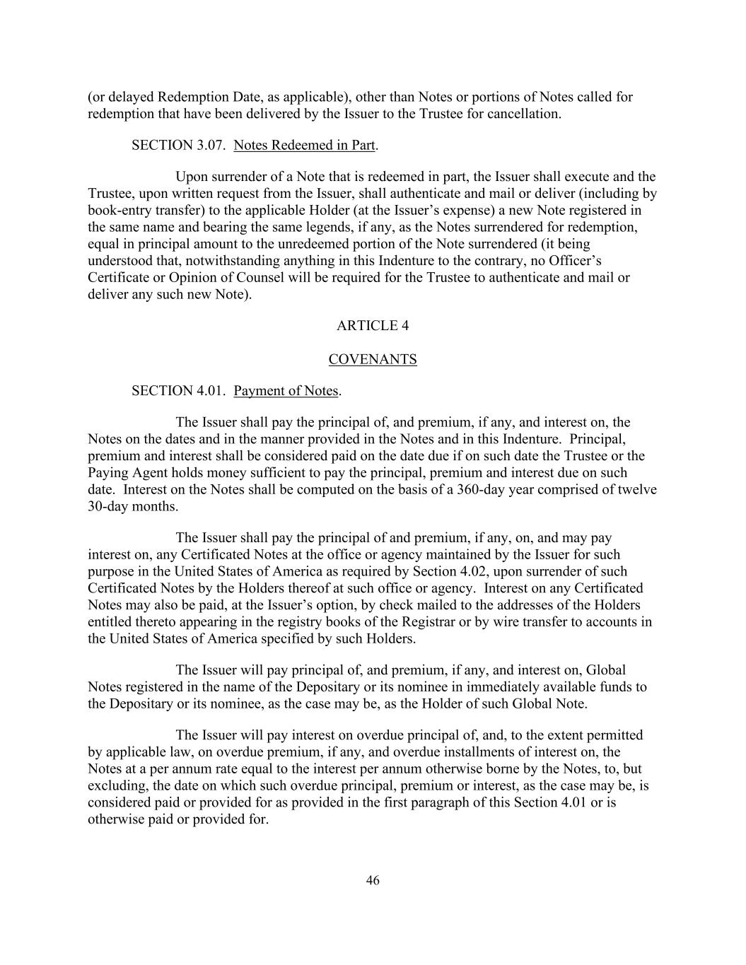 46 (or delayed Redemption Date, as applicable), other than Notes or portions of Notes called for redemption that have been delivered by the Issuer to the Trustee for cancellation. SECTION 3.07. Notes Redeemed in Part. Upon surrender of a Note that is redeemed in part, the Issuer shall execute and the Trustee, upon written request from the Issuer, shall authenticate and mail or deliver (including by book-entry transfer) to the applicable Holder (at the Issuer’s expense) a new Note registered in the same name and bearing the same legends, if any, as the Notes surrendered for redemption, equal in principal amount to the unredeemed portion of the Note surrendered (it being understood that, notwithstanding anything in this Indenture to the contrary, no Officer’s Certificate or Opinion of Counsel will be required for the Trustee to authenticate and mail or deliver any such new Note). ARTICLE 4 COVENANTS SECTION 4.01. Payment of Notes. The Issuer shall pay the principal of, and premium, if any, and interest on, the Notes on the dates and in the manner provided in the Notes and in this Indenture. Principal, premium and interest shall be considered paid on the date due if on such date the Trustee or the Paying Agent holds money sufficient to pay the principal, premium and interest due on such date. Interest on the Notes shall be computed on the basis of a 360-day year comprised of twelve 30-day months. The Issuer shall pay the principal of and premium, if any, on, and may pay interest on, any Certificated Notes at the office or agency maintained by the Issuer for such purpose in the United States of America as required by Section 4.02, upon surrender of such Certificated Notes by the Holders thereof at such office or agency. Interest on any Certificated Notes may also be paid, at the Issuer’s option, by check mailed to the addresses of the Holders entitled thereto appearing in the registry books of the Registrar or by wire transfer to accounts in the United States of America specified by such Holders. The Issuer will pay principal of, and premium, if any, and interest on, Global Notes registered in the name of the Depositary or its nominee in immediately available funds to the Depositary or its nominee, as the case may be, as the Holder of such Global Note. The Issuer will pay interest on overdue principal of, and, to the extent permitted by applicable law, on overdue premium, if any, and overdue installments of interest on, the Notes at a per annum rate equal to the interest per annum otherwise borne by the Notes, to, but excluding, the date on which such overdue principal, premium or interest, as the case may be, is considered paid or provided for as provided in the first paragraph of this Section 4.01 or is otherwise paid or provided for.