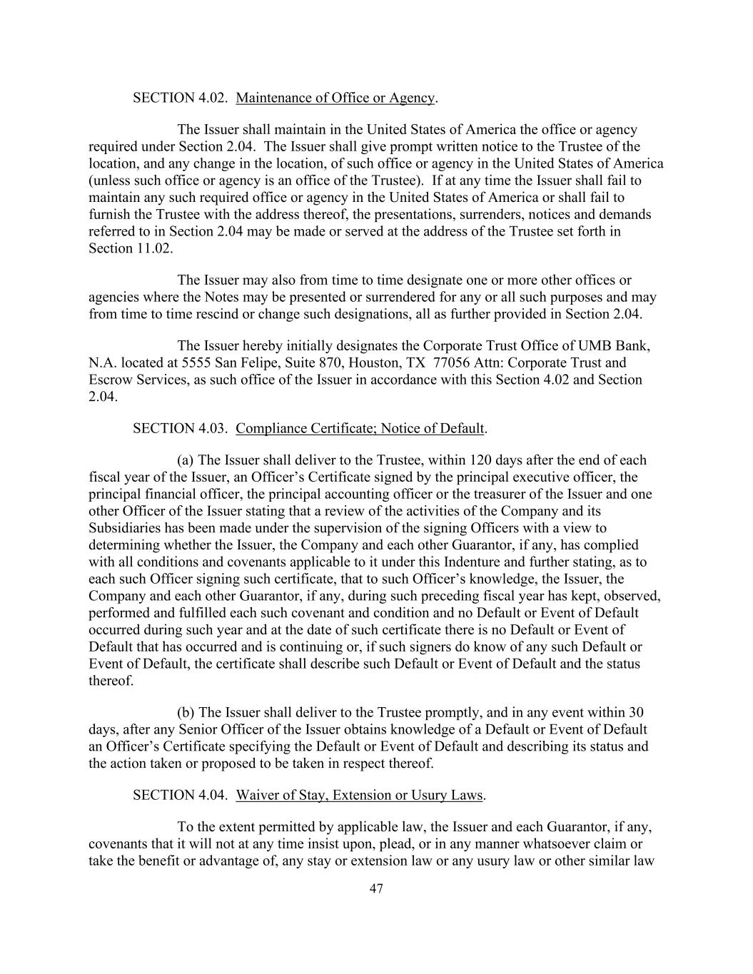 47 SECTION 4.02. Maintenance of Office or Agency. The Issuer shall maintain in the United States of America the office or agency required under Section 2.04. The Issuer shall give prompt written notice to the Trustee of the location, and any change in the location, of such office or agency in the United States of America (unless such office or agency is an office of the Trustee). If at any time the Issuer shall fail to maintain any such required office or agency in the United States of America or shall fail to furnish the Trustee with the address thereof, the presentations, surrenders, notices and demands referred to in Section 2.04 may be made or served at the address of the Trustee set forth in Section 11.02. The Issuer may also from time to time designate one or more other offices or agencies where the Notes may be presented or surrendered for any or all such purposes and may from time to time rescind or change such designations, all as further provided in Section 2.04. The Issuer hereby initially designates the Corporate Trust Office of UMB Bank, N.A. located at 5555 San Felipe, Suite 870, Houston, TX 77056 Attn: Corporate Trust and Escrow Services, as such office of the Issuer in accordance with this Section 4.02 and Section 2.04. SECTION 4.03. Compliance Certificate; Notice of Default. (a) The Issuer shall deliver to the Trustee, within 120 days after the end of each fiscal year of the Issuer, an Officer’s Certificate signed by the principal executive officer, the principal financial officer, the principal accounting officer or the treasurer of the Issuer and one other Officer of the Issuer stating that a review of the activities of the Company and its Subsidiaries has been made under the supervision of the signing Officers with a view to determining whether the Issuer, the Company and each other Guarantor, if any, has complied with all conditions and covenants applicable to it under this Indenture and further stating, as to each such Officer signing such certificate, that to such Officer’s knowledge, the Issuer, the Company and each other Guarantor, if any, during such preceding fiscal year has kept, observed, performed and fulfilled each such covenant and condition and no Default or Event of Default occurred during such year and at the date of such certificate there is no Default or Event of Default that has occurred and is continuing or, if such signers do know of any such Default or Event of Default, the certificate shall describe such Default or Event of Default and the status thereof. (b) The Issuer shall deliver to the Trustee promptly, and in any event within 30 days, after any Senior Officer of the Issuer obtains knowledge of a Default or Event of Default an Officer’s Certificate specifying the Default or Event of Default and describing its status and the action taken or proposed to be taken in respect thereof. SECTION 4.04. Waiver of Stay, Extension or Usury Laws. To the extent permitted by applicable law, the Issuer and each Guarantor, if any, covenants that it will not at any time insist upon, plead, or in any manner whatsoever claim or take the benefit or advantage of, any stay or extension law or any usury law or other similar law