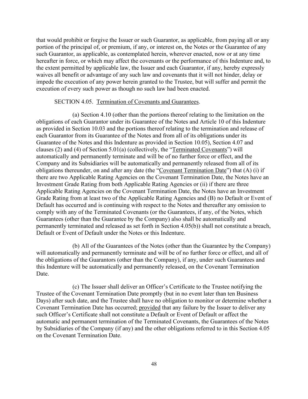 48 that would prohibit or forgive the Issuer or such Guarantor, as applicable, from paying all or any portion of the principal of, or premium, if any, or interest on, the Notes or the Guarantee of any such Guarantor, as applicable, as contemplated herein, wherever enacted, now or at any time hereafter in force, or which may affect the covenants or the performance of this Indenture and, to the extent permitted by applicable law, the Issuer and each Guarantor, if any, hereby expressly waives all benefit or advantage of any such law and covenants that it will not hinder, delay or impede the execution of any power herein granted to the Trustee, but will suffer and permit the execution of every such power as though no such law had been enacted. SECTION 4.05. Termination of Covenants and Guarantees. (a) Section 4.10 (other than the portions thereof relating to the limitation on the obligations of each Guarantor under its Guarantee of the Notes and Article 10 of this Indenture as provided in Section 10.03 and the portions thereof relating to the termination and release of each Guarantor from its Guarantee of the Notes and from all of its obligations under its Guarantee of the Notes and this Indenture as provided in Section 10.05), Section 4.07 and clauses (2) and (4) of Section 5.01(a) (collectively, the “Terminated Covenants”) will automatically and permanently terminate and will be of no further force or effect, and the Company and its Subsidiaries will be automatically and permanently released from all of its obligations thereunder, on and after any date (the “Covenant Termination Date”) that (A) (i) if there are two Applicable Rating Agencies on the Covenant Termination Date, the Notes have an Investment Grade Rating from both Applicable Rating Agencies or (ii) if there are three Applicable Rating Agencies on the Covenant Termination Date, the Notes have an Investment Grade Rating from at least two of the Applicable Rating Agencies and (B) no Default or Event of Default has occurred and is continuing with respect to the Notes and thereafter any omission to comply with any of the Terminated Covenants (or the Guarantees, if any, of the Notes, which Guarantees (other than the Guarantee by the Company) also shall be automatically and permanently terminated and released as set forth in Section 4.05(b)) shall not constitute a breach, Default or Event of Default under the Notes or this Indenture. (b) All of the Guarantees of the Notes (other than the Guarantee by the Company) will automatically and permanently terminate and will be of no further force or effect, and all of the obligations of the Guarantors (other than the Company), if any, under such Guarantees and this Indenture will be automatically and permanently released, on the Covenant Termination Date. (c) The Issuer shall deliver an Officer’s Certificate to the Trustee notifying the Trustee of the Covenant Termination Date promptly (but in no event later than ten Business Days) after such date, and the Trustee shall have no obligation to monitor or determine whether a Covenant Termination Date has occurred; provided that any failure by the Issuer to deliver any such Officer’s Certificate shall not constitute a Default or Event of Default or affect the automatic and permanent termination of the Terminated Covenants, the Guarantees of the Notes by Subsidiaries of the Company (if any) and the other obligations referred to in this Section 4.05 on the Covenant Termination Date.
