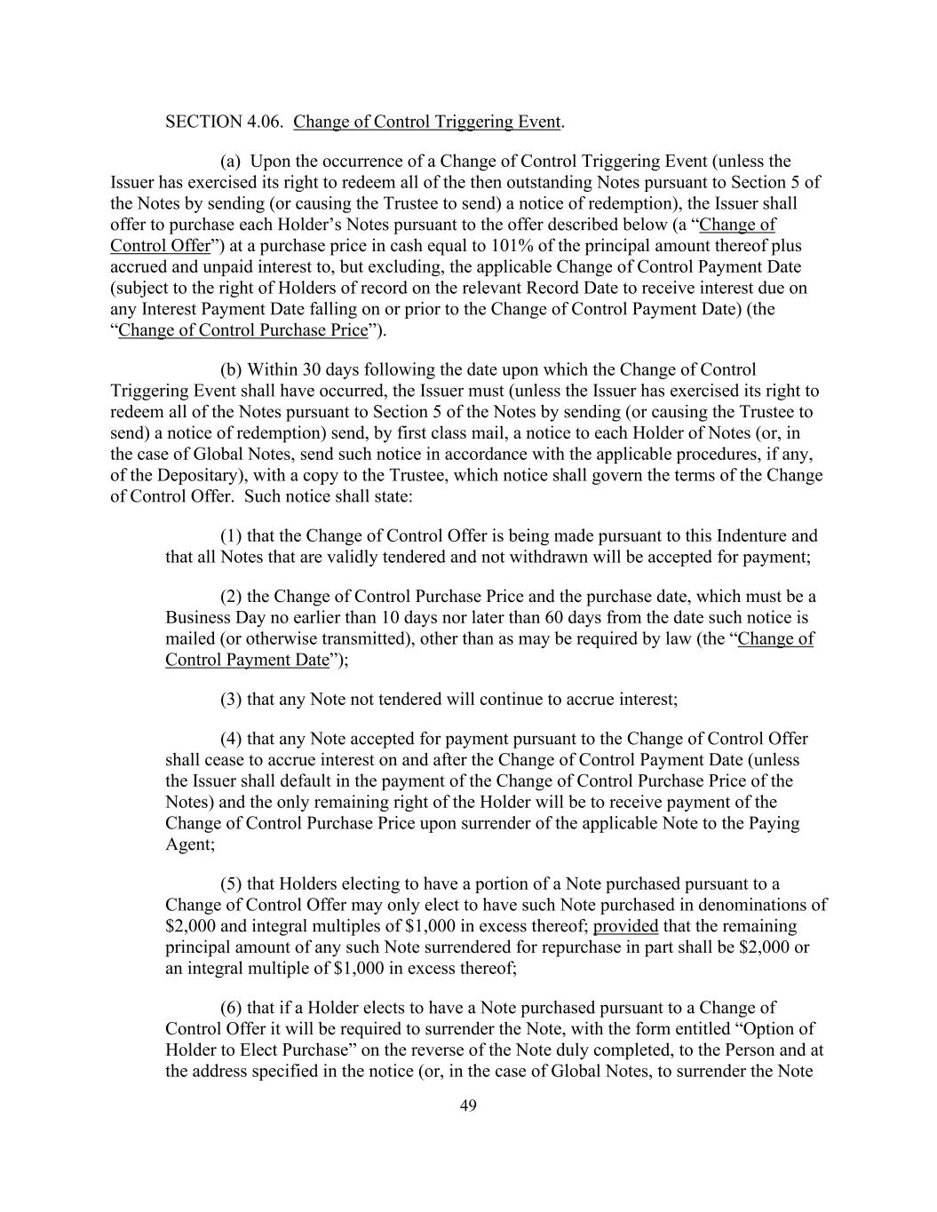 49 SECTION 4.06. Change of Control Triggering Event. (a) Upon the occurrence of a Change of Control Triggering Event (unless the Issuer has exercised its right to redeem all of the then outstanding Notes pursuant to Section 5 of the Notes by sending (or causing the Trustee to send) a notice of redemption), the Issuer shall offer to purchase each Holder’s Notes pursuant to the offer described below (a “Change of Control Offer”) at a purchase price in cash equal to 101% of the principal amount thereof plus accrued and unpaid interest to, but excluding, the applicable Change of Control Payment Date (subject to the right of Holders of record on the relevant Record Date to receive interest due on any Interest Payment Date falling on or prior to the Change of Control Payment Date) (the “Change of Control Purchase Price”). (b) Within 30 days following the date upon which the Change of Control Triggering Event shall have occurred, the Issuer must (unless the Issuer has exercised its right to redeem all of the Notes pursuant to Section 5 of the Notes by sending (or causing the Trustee to send) a notice of redemption) send, by first class mail, a notice to each Holder of Notes (or, in the case of Global Notes, send such notice in accordance with the applicable procedures, if any, of the Depositary), with a copy to the Trustee, which notice shall govern the terms of the Change of Control Offer. Such notice shall state: (1) that the Change of Control Offer is being made pursuant to this Indenture and that all Notes that are validly tendered and not withdrawn will be accepted for payment; (2) the Change of Control Purchase Price and the purchase date, which must be a Business Day no earlier than 10 days nor later than 60 days from the date such notice is mailed (or otherwise transmitted), other than as may be required by law (the “Change of Control Payment Date”); (3) that any Note not tendered will continue to accrue interest; (4) that any Note accepted for payment pursuant to the Change of Control Offer shall cease to accrue interest on and after the Change of Control Payment Date (unless the Issuer shall default in the payment of the Change of Control Purchase Price of the Notes) and the only remaining right of the Holder will be to receive payment of the Change of Control Purchase Price upon surrender of the applicable Note to the Paying Agent; (5) that Holders electing to have a portion of a Note purchased pursuant to a Change of Control Offer may only elect to have such Note purchased in denominations of $2,000 and integral multiples of $1,000 in excess thereof; provided that the remaining principal amount of any such Note surrendered for repurchase in part shall be $2,000 or an integral multiple of $1,000 in excess thereof; (6) that if a Holder elects to have a Note purchased pursuant to a Change of Control Offer it will be required to surrender the Note, with the form entitled “Option of Holder to Elect Purchase” on the reverse of the Note duly completed, to the Person and at the address specified in the notice (or, in the case of Global Notes, to surrender the Note