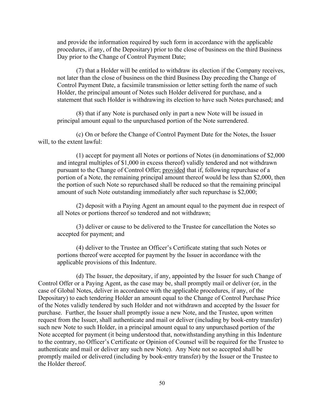 50 and provide the information required by such form in accordance with the applicable procedures, if any, of the Depositary) prior to the close of business on the third Business Day prior to the Change of Control Payment Date; (7) that a Holder will be entitled to withdraw its election if the Company receives, not later than the close of business on the third Business Day preceding the Change of Control Payment Date, a facsimile transmission or letter setting forth the name of such Holder, the principal amount of Notes such Holder delivered for purchase, and a statement that such Holder is withdrawing its election to have such Notes purchased; and (8) that if any Note is purchased only in part a new Note will be issued in principal amount equal to the unpurchased portion of the Note surrendered. (c) On or before the Change of Control Payment Date for the Notes, the Issuer will, to the extent lawful: (1) accept for payment all Notes or portions of Notes (in denominations of $2,000 and integral multiples of $1,000 in excess thereof) validly tendered and not withdrawn pursuant to the Change of Control Offer; provided that if, following repurchase of a portion of a Note, the remaining principal amount thereof would be less than $2,000, then the portion of such Note so repurchased shall be reduced so that the remaining principal amount of such Note outstanding immediately after such repurchase is $2,000; (2) deposit with a Paying Agent an amount equal to the payment due in respect of all Notes or portions thereof so tendered and not withdrawn; (3) deliver or cause to be delivered to the Trustee for cancellation the Notes so accepted for payment; and (4) deliver to the Trustee an Officer’s Certificate stating that such Notes or portions thereof were accepted for payment by the Issuer in accordance with the applicable provisions of this Indenture. (d) The Issuer, the depositary, if any, appointed by the Issuer for such Change of Control Offer or a Paying Agent, as the case may be, shall promptly mail or deliver (or, in the case of Global Notes, deliver in accordance with the applicable procedures, if any, of the Depositary) to each tendering Holder an amount equal to the Change of Control Purchase Price of the Notes validly tendered by such Holder and not withdrawn and accepted by the Issuer for purchase. Further, the Issuer shall promptly issue a new Note, and the Trustee, upon written request from the Issuer, shall authenticate and mail or deliver (including by book-entry transfer) such new Note to such Holder, in a principal amount equal to any unpurchased portion of the Note accepted for payment (it being understood that, notwithstanding anything in this Indenture to the contrary, no Officer’s Certificate or Opinion of Counsel will be required for the Trustee to authenticate and mail or deliver any such new Note). Any Note not so accepted shall be promptly mailed or delivered (including by book-entry transfer) by the Issuer or the Trustee to the Holder thereof.