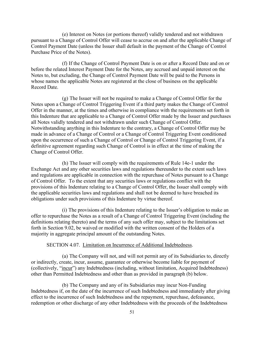 51 (e) Interest on Notes (or portions thereof) validly tendered and not withdrawn pursuant to a Change of Control Offer will cease to accrue on and after the applicable Change of Control Payment Date (unless the Issuer shall default in the payment of the Change of Control Purchase Price of the Notes). (f) If the Change of Control Payment Date is on or after a Record Date and on or before the related Interest Payment Date for the Notes, any accrued and unpaid interest on the Notes to, but excluding, the Change of Control Payment Date will be paid to the Persons in whose names the applicable Notes are registered at the close of business on the applicable Record Date. (g) The Issuer will not be required to make a Change of Control Offer for the Notes upon a Change of Control Triggering Event if a third party makes the Change of Control Offer in the manner, at the times and otherwise in compliance with the requirements set forth in this Indenture that are applicable to a Change of Control Offer made by the Issuer and purchases all Notes validly tendered and not withdrawn under such Change of Control Offer. Notwithstanding anything in this Indenture to the contrary, a Change of Control Offer may be made in advance of a Change of Control or a Change of Control Triggering Event conditioned upon the occurrence of such a Change of Control or Change of Control Triggering Event, if a definitive agreement regarding such Change of Control is in effect at the time of making the Change of Control Offer. (h) The Issuer will comply with the requirements of Rule 14e-1 under the Exchange Act and any other securities laws and regulations thereunder to the extent such laws and regulations are applicable in connection with the repurchase of Notes pursuant to a Change of Control Offer. To the extent that any securities laws or regulations conflict with the provisions of this Indenture relating to a Change of Control Offer, the Issuer shall comply with the applicable securities laws and regulations and shall not be deemed to have breached its obligations under such provisions of this Indenture by virtue thereof. (i) The provisions of this Indenture relating to the Issuer’s obligation to make an offer to repurchase the Notes as a result of a Change of Control Triggering Event (including the definitions relating thereto) and the terms of any such offer may, subject to the limitations set forth in Section 9.02, be waived or modified with the written consent of the Holders of a majority in aggregate principal amount of the outstanding Notes. SECTION 4.07. Limitation on Incurrence of Additional Indebtedness. (a) The Company will not, and will not permit any of its Subsidiaries to, directly or indirectly, create, incur, assume, guarantee or otherwise become liable for payment of (collectively, “incur”) any Indebtedness (including, without limitation, Acquired Indebtedness) other than Permitted Indebtedness and other than as provided in paragraph (b) below. (b) The Company and any of its Subsidiaries may incur Non-Funding Indebtedness if, on the date of the incurrence of such Indebtedness and immediately after giving effect to the incurrence of such Indebtedness and the repayment, repurchase, defeasance, redemption or other discharge of any other Indebtedness with the proceeds of the Indebtedness