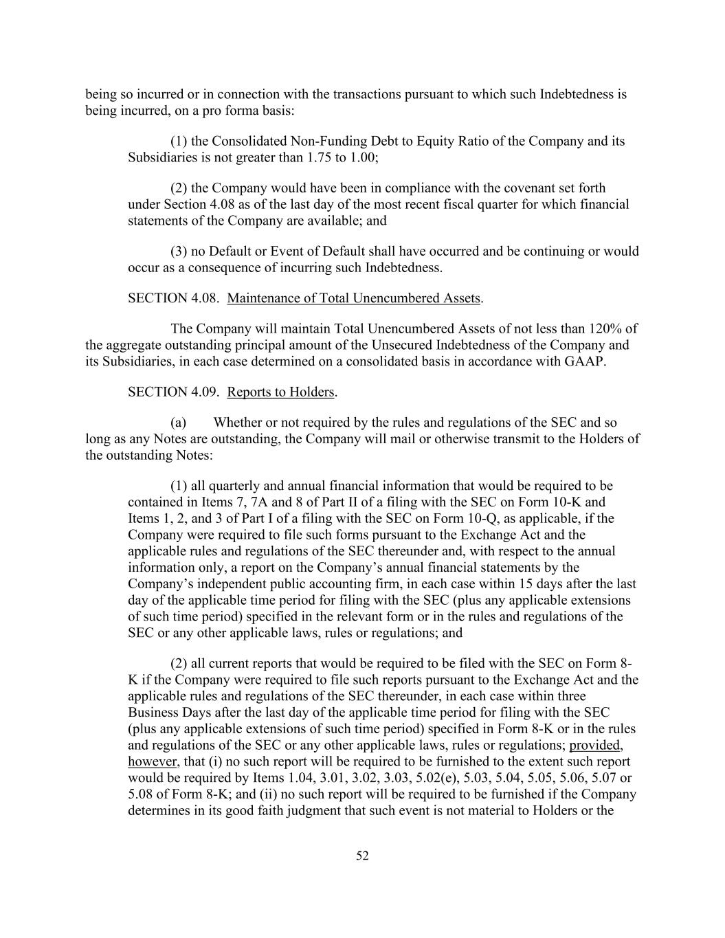 52 being so incurred or in connection with the transactions pursuant to which such Indebtedness is being incurred, on a pro forma basis: (1) the Consolidated Non-Funding Debt to Equity Ratio of the Company and its Subsidiaries is not greater than 1.75 to 1.00; (2) the Company would have been in compliance with the covenant set forth under Section 4.08 as of the last day of the most recent fiscal quarter for which financial statements of the Company are available; and (3) no Default or Event of Default shall have occurred and be continuing or would occur as a consequence of incurring such Indebtedness. SECTION 4.08. Maintenance of Total Unencumbered Assets. The Company will maintain Total Unencumbered Assets of not less than 120% of the aggregate outstanding principal amount of the Unsecured Indebtedness of the Company and its Subsidiaries, in each case determined on a consolidated basis in accordance with GAAP. SECTION 4.09. Reports to Holders. (a) Whether or not required by the rules and regulations of the SEC and so long as any Notes are outstanding, the Company will mail or otherwise transmit to the Holders of the outstanding Notes: (1) all quarterly and annual financial information that would be required to be contained in Items 7, 7A and 8 of Part II of a filing with the SEC on Form 10-K and Items 1, 2, and 3 of Part I of a filing with the SEC on Form 10-Q, as applicable, if the Company were required to file such forms pursuant to the Exchange Act and the applicable rules and regulations of the SEC thereunder and, with respect to the annual information only, a report on the Company’s annual financial statements by the Company’s independent public accounting firm, in each case within 15 days after the last day of the applicable time period for filing with the SEC (plus any applicable extensions of such time period) specified in the relevant form or in the rules and regulations of the SEC or any other applicable laws, rules or regulations; and (2) all current reports that would be required to be filed with the SEC on Form 8- K if the Company were required to file such reports pursuant to the Exchange Act and the applicable rules and regulations of the SEC thereunder, in each case within three Business Days after the last day of the applicable time period for filing with the SEC (plus any applicable extensions of such time period) specified in Form 8-K or in the rules and regulations of the SEC or any other applicable laws, rules or regulations; provided, however, that (i) no such report will be required to be furnished to the extent such report would be required by Items 1.04, 3.01, 3.02, 3.03, 5.02(e), 5.03, 5.04, 5.05, 5.06, 5.07 or 5.08 of Form 8-K; and (ii) no such report will be required to be furnished if the Company determines in its good faith judgment that such event is not material to Holders or the