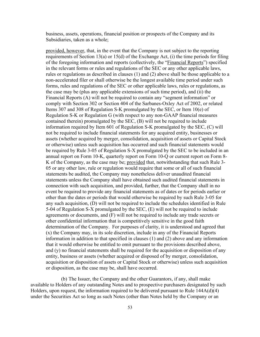 53 business, assets, operations, financial position or prospects of the Company and its Subsidiaries, taken as a whole; provided, however, that, in the event that the Company is not subject to the reporting requirements of Section 13(a) or 15(d) of the Exchange Act, (i) the time periods for filing of the foregoing information and reports (collectively, the “Financial Reports”) specified in the relevant forms or rules and regulations of the SEC or any other applicable laws, rules or regulations as described in clauses (1) and (2) above shall be those applicable to a non-accelerated filer or shall otherwise be the longest available time period under such forms, rules and regulations of the SEC or other applicable laws, rules or regulations, as the case may be (plus any applicable extensions of such time period), and (ii) the Financial Reports (A) will not be required to contain any “segment information” or comply with Section 302 or Section 404 of the Sarbanes-Oxley Act of 2002, or related Items 307 and 308 of Regulation S-K promulgated by the SEC, or Item 10(e) of Regulation S-K or Regulation G (with respect to any non-GAAP financial measures contained therein) promulgated by the SEC, (B) will not be required to include information required by Item 601 of Regulation S-K promulgated by the SEC, (C) will not be required to include financial statements for any acquired entity, businesses or assets (whether acquired by merger, consolidation, acquisition of assets or Capital Stock or otherwise) unless such acquisition has occurred and such financial statements would be required by Rule 3-05 of Regulation S-X promulgated by the SEC to be included in an annual report on Form 10-K, quarterly report on Form 10-Q or current report on Form 8- K of the Company, as the case may be; provided that, notwithstanding that such Rule 3- 05 or any other law, rule or regulation would require that some or all of such financial statements be audited, the Company may nonetheless deliver unaudited financial statements unless the Company shall have obtained such audited financial statements in connection with such acquisition, and provided, further, that the Company shall in no event be required to provide any financial statements as of dates or for periods earlier or other than the dates or periods that would otherwise be required by such Rule 3-05 for any such acquisition, (D) will not be required to include the schedules identified in Rule 5-04 of Regulation S-X promulgated by the SEC, (E) will not be required to include agreements or documents, and (F) will not be required to include any trade secrets or other confidential information that is competitively sensitive in the good faith determination of the Company. For purposes of clarity, it is understood and agreed that (x) the Company may, in its sole discretion, include in any of the Financial Reports information in addition to that specified in clauses (1) and (2) above and any information that it would otherwise be entitled to omit pursuant to the provisions described above, and (y) no financial statements shall be required for the acquisition or disposition of any entity, business or assets (whether acquired or disposed of by merger, consolidation, acquisition or disposition of assets or Capital Stock or otherwise) unless such acquisition or disposition, as the case may be, shall have occurred. (b) The Issuer, the Company and the other Guarantors, if any, shall make available to Holders of any outstanding Notes and to prospective purchasers designated by such Holders, upon request, the information required to be delivered pursuant to Rule 144A(d)(4) under the Securities Act so long as such Notes (other than Notes held by the Company or an