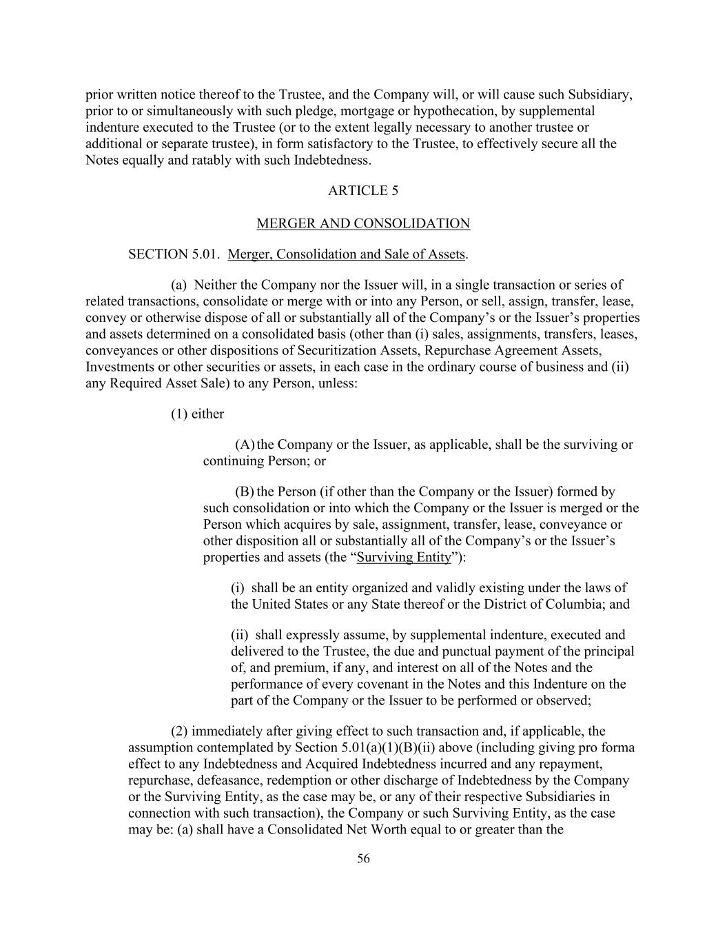56 prior written notice thereof to the Trustee, and the Company will, or will cause such Subsidiary, prior to or simultaneously with such pledge, mortgage or hypothecation, by supplemental indenture executed to the Trustee (or to the extent legally necessary to another trustee or additional or separate trustee), in form satisfactory to the Trustee, to effectively secure all the Notes equally and ratably with such Indebtedness. ARTICLE 5 MERGER AND CONSOLIDATION SECTION 5.01. Merger, Consolidation and Sale of Assets. (a) Neither the Company nor the Issuer will, in a single transaction or series of related transactions, consolidate or merge with or into any Person, or sell, assign, transfer, lease, convey or otherwise dispose of all or substantially all of the Company’s or the Issuer’s properties and assets determined on a consolidated basis (other than (i) sales, assignments, transfers, leases, conveyances or other dispositions of Securitization Assets, Repurchase Agreement Assets, Investments or other securities or assets, in each case in the ordinary course of business and (ii) any Required Asset Sale) to any Person, unless: (1) either (A) the Company or the Issuer, as applicable, shall be the surviving or continuing Person; or (B) the Person (if other than the Company or the Issuer) formed by such consolidation or into which the Company or the Issuer is merged or the Person which acquires by sale, assignment, transfer, lease, conveyance or other disposition all or substantially all of the Company’s or the Issuer’s properties and assets (the “Surviving Entity”): (i) shall be an entity organized and validly existing under the laws of the United States or any State thereof or the District of Columbia; and (ii) shall expressly assume, by supplemental indenture, executed and delivered to the Trustee, the due and punctual payment of the principal of, and premium, if any, and interest on all of the Notes and the performance of every covenant in the Notes and this Indenture on the part of the Company or the Issuer to be performed or observed; (2) immediately after giving effect to such transaction and, if applicable, the assumption contemplated by Section 5.01(a)(1)(B)(ii) above (including giving pro forma effect to any Indebtedness and Acquired Indebtedness incurred and any repayment, repurchase, defeasance, redemption or other discharge of Indebtedness by the Company or the Surviving Entity, as the case may be, or any of their respective Subsidiaries in connection with such transaction), the Company or such Surviving Entity, as the case may be: (a) shall have a Consolidated Net Worth equal to or greater than the
