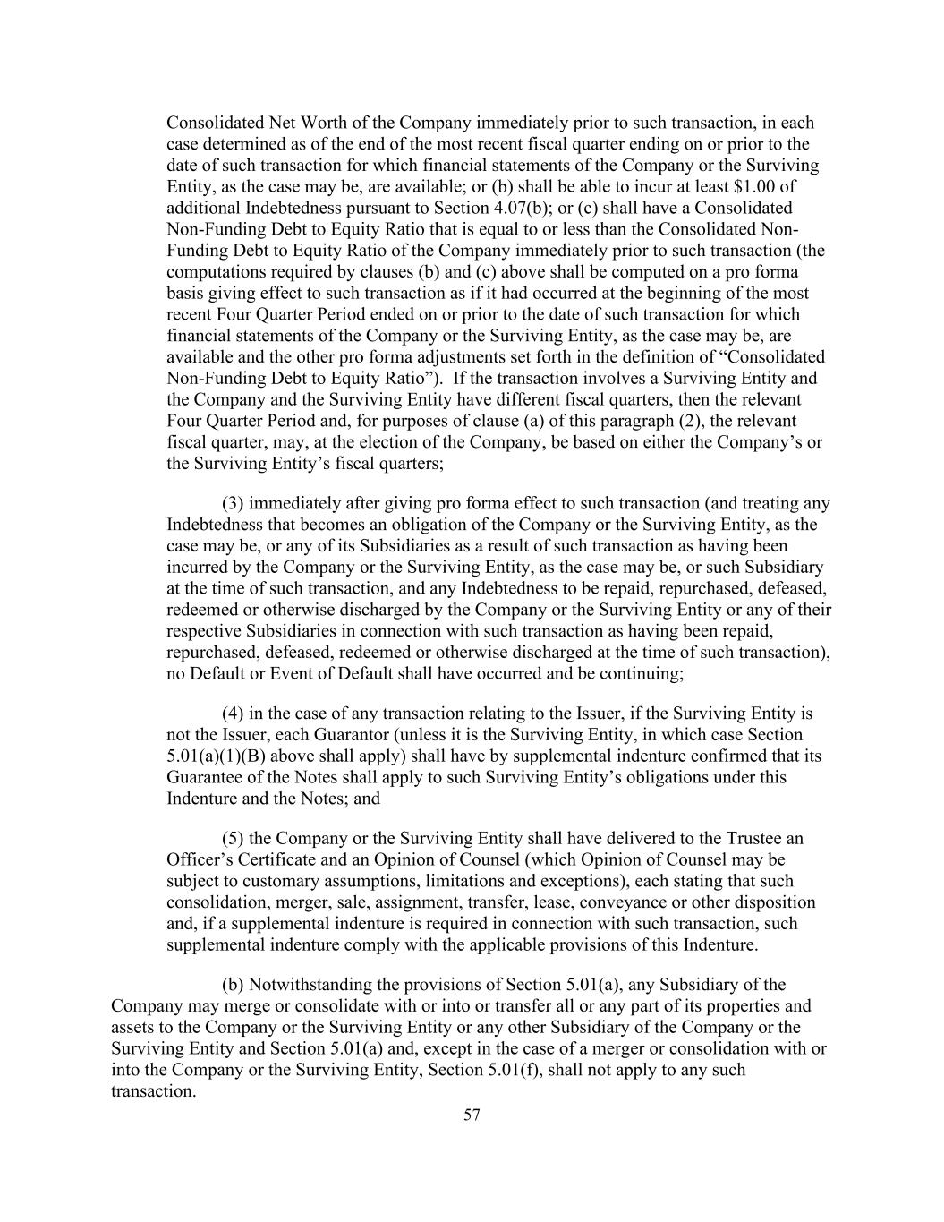 57 Consolidated Net Worth of the Company immediately prior to such transaction, in each case determined as of the end of the most recent fiscal quarter ending on or prior to the date of such transaction for which financial statements of the Company or the Surviving Entity, as the case may be, are available; or (b) shall be able to incur at least $1.00 of additional Indebtedness pursuant to Section 4.07(b); or (c) shall have a Consolidated Non-Funding Debt to Equity Ratio that is equal to or less than the Consolidated Non- Funding Debt to Equity Ratio of the Company immediately prior to such transaction (the computations required by clauses (b) and (c) above shall be computed on a pro forma basis giving effect to such transaction as if it had occurred at the beginning of the most recent Four Quarter Period ended on or prior to the date of such transaction for which financial statements of the Company or the Surviving Entity, as the case may be, are available and the other pro forma adjustments set forth in the definition of “Consolidated Non-Funding Debt to Equity Ratio”). If the transaction involves a Surviving Entity and the Company and the Surviving Entity have different fiscal quarters, then the relevant Four Quarter Period and, for purposes of clause (a) of this paragraph (2), the relevant fiscal quarter, may, at the election of the Company, be based on either the Company’s or the Surviving Entity’s fiscal quarters; (3) immediately after giving pro forma effect to such transaction (and treating any Indebtedness that becomes an obligation of the Company or the Surviving Entity, as the case may be, or any of its Subsidiaries as a result of such transaction as having been incurred by the Company or the Surviving Entity, as the case may be, or such Subsidiary at the time of such transaction, and any Indebtedness to be repaid, repurchased, defeased, redeemed or otherwise discharged by the Company or the Surviving Entity or any of their respective Subsidiaries in connection with such transaction as having been repaid, repurchased, defeased, redeemed or otherwise discharged at the time of such transaction), no Default or Event of Default shall have occurred and be continuing; (4) in the case of any transaction relating to the Issuer, if the Surviving Entity is not the Issuer, each Guarantor (unless it is the Surviving Entity, in which case Section 5.01(a)(1)(B) above shall apply) shall have by supplemental indenture confirmed that its Guarantee of the Notes shall apply to such Surviving Entity’s obligations under this Indenture and the Notes; and (5) the Company or the Surviving Entity shall have delivered to the Trustee an Officer’s Certificate and an Opinion of Counsel (which Opinion of Counsel may be subject to customary assumptions, limitations and exceptions), each stating that such consolidation, merger, sale, assignment, transfer, lease, conveyance or other disposition and, if a supplemental indenture is required in connection with such transaction, such supplemental indenture comply with the applicable provisions of this Indenture. (b) Notwithstanding the provisions of Section 5.01(a), any Subsidiary of the Company may merge or consolidate with or into or transfer all or any part of its properties and assets to the Company or the Surviving Entity or any other Subsidiary of the Company or the Surviving Entity and Section 5.01(a) and, except in the case of a merger or consolidation with or into the Company or the Surviving Entity, Section 5.01(f), shall not apply to any such transaction.