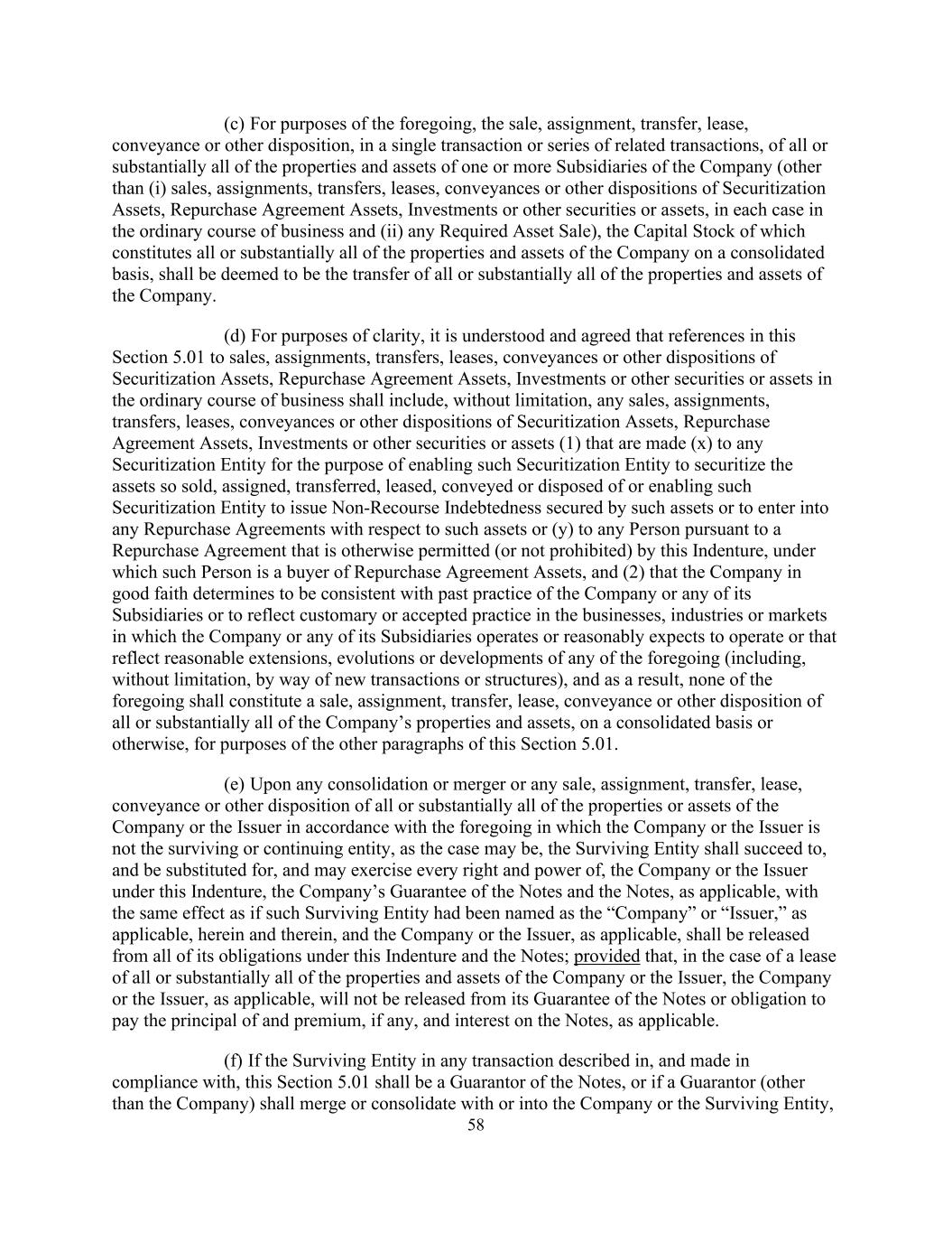 58 (c) For purposes of the foregoing, the sale, assignment, transfer, lease, conveyance or other disposition, in a single transaction or series of related transactions, of all or substantially all of the properties and assets of one or more Subsidiaries of the Company (other than (i) sales, assignments, transfers, leases, conveyances or other dispositions of Securitization Assets, Repurchase Agreement Assets, Investments or other securities or assets, in each case in the ordinary course of business and (ii) any Required Asset Sale), the Capital Stock of which constitutes all or substantially all of the properties and assets of the Company on a consolidated basis, shall be deemed to be the transfer of all or substantially all of the properties and assets of the Company. (d) For purposes of clarity, it is understood and agreed that references in this Section 5.01 to sales, assignments, transfers, leases, conveyances or other dispositions of Securitization Assets, Repurchase Agreement Assets, Investments or other securities or assets in the ordinary course of business shall include, without limitation, any sales, assignments, transfers, leases, conveyances or other dispositions of Securitization Assets, Repurchase Agreement Assets, Investments or other securities or assets (1) that are made (x) to any Securitization Entity for the purpose of enabling such Securitization Entity to securitize the assets so sold, assigned, transferred, leased, conveyed or disposed of or enabling such Securitization Entity to issue Non-Recourse Indebtedness secured by such assets or to enter into any Repurchase Agreements with respect to such assets or (y) to any Person pursuant to a Repurchase Agreement that is otherwise permitted (or not prohibited) by this Indenture, under which such Person is a buyer of Repurchase Agreement Assets, and (2) that the Company in good faith determines to be consistent with past practice of the Company or any of its Subsidiaries or to reflect customary or accepted practice in the businesses, industries or markets in which the Company or any of its Subsidiaries operates or reasonably expects to operate or that reflect reasonable extensions, evolutions or developments of any of the foregoing (including, without limitation, by way of new transactions or structures), and as a result, none of the foregoing shall constitute a sale, assignment, transfer, lease, conveyance or other disposition of all or substantially all of the Company’s properties and assets, on a consolidated basis or otherwise, for purposes of the other paragraphs of this Section 5.01. (e) Upon any consolidation or merger or any sale, assignment, transfer, lease, conveyance or other disposition of all or substantially all of the properties or assets of the Company or the Issuer in accordance with the foregoing in which the Company or the Issuer is not the surviving or continuing entity, as the case may be, the Surviving Entity shall succeed to, and be substituted for, and may exercise every right and power of, the Company or the Issuer under this Indenture, the Company’s Guarantee of the Notes and the Notes, as applicable, with the same effect as if such Surviving Entity had been named as the “Company” or “Issuer,” as applicable, herein and therein, and the Company or the Issuer, as applicable, shall be released from all of its obligations under this Indenture and the Notes; provided that, in the case of a lease of all or substantially all of the properties and assets of the Company or the Issuer, the Company or the Issuer, as applicable, will not be released from its Guarantee of the Notes or obligation to pay the principal of and premium, if any, and interest on the Notes, as applicable. (f) If the Surviving Entity in any transaction described in, and made in compliance with, this Section 5.01 shall be a Guarantor of the Notes, or if a Guarantor (other than the Company) shall merge or consolidate with or into the Company or the Surviving Entity,